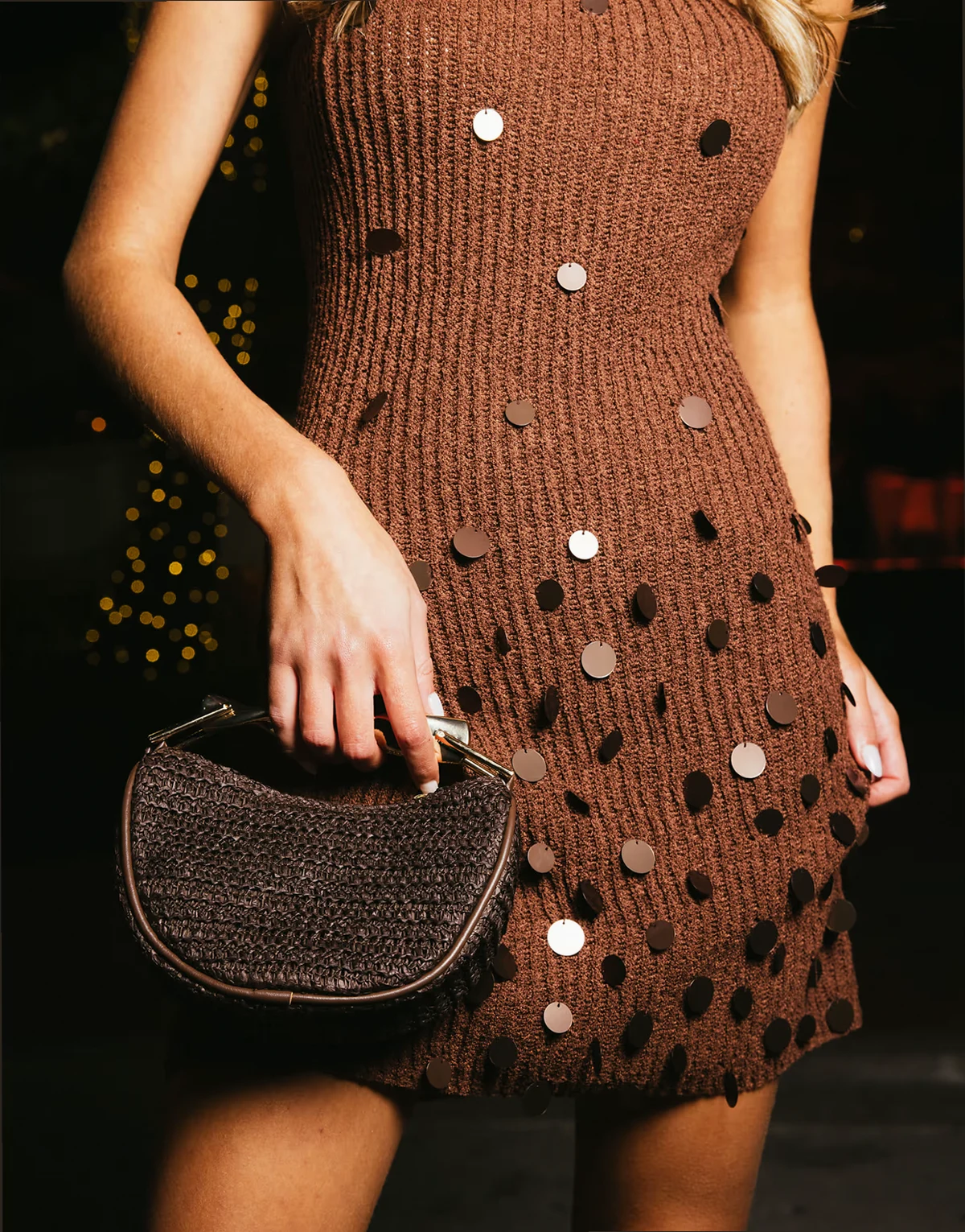 – Schulterfreies Mini-Strandkleid aus Strick in Braun mit Pailletten
