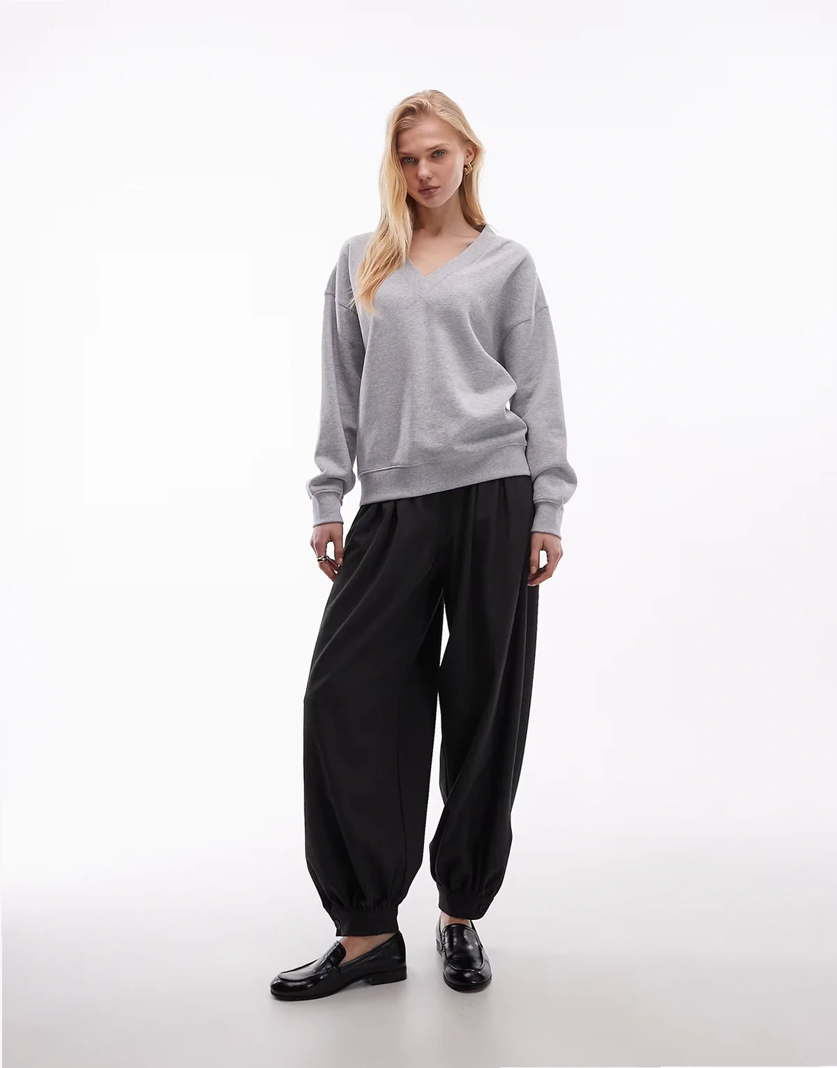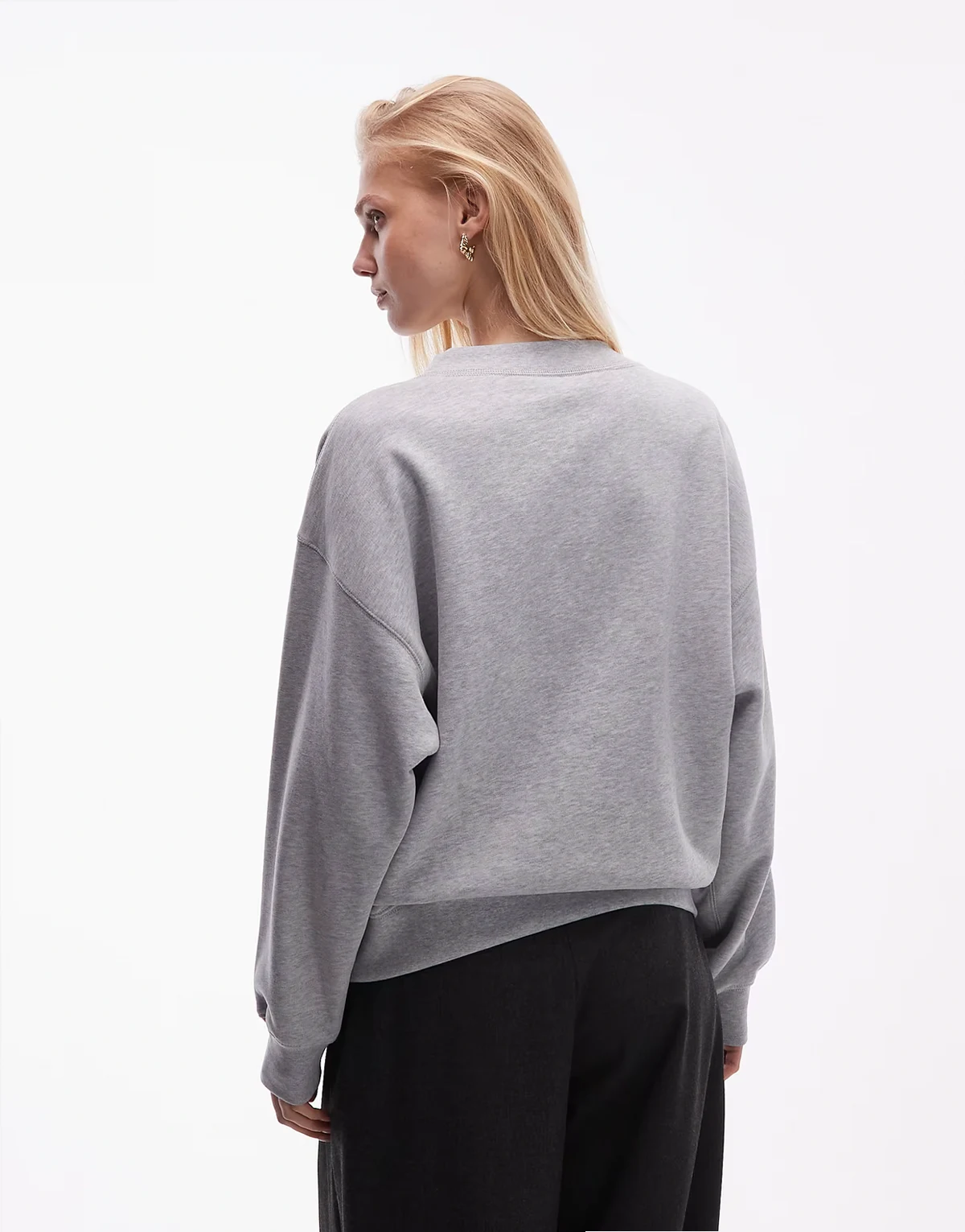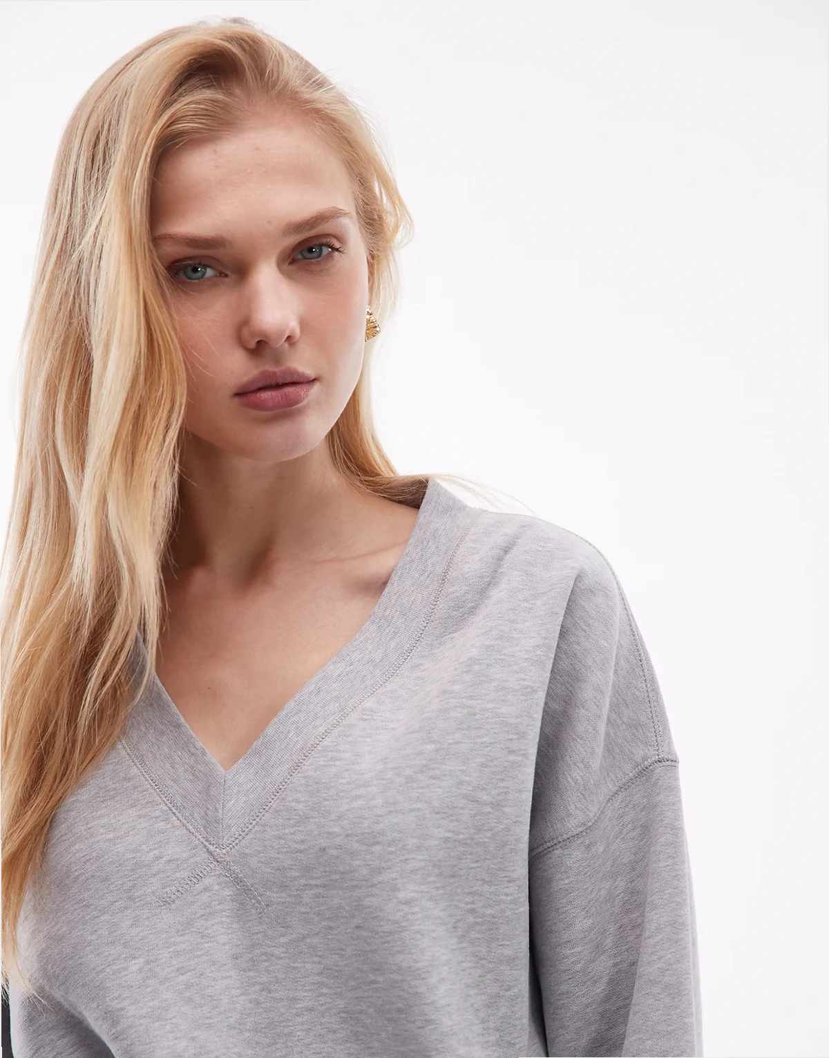 – Oversize-Sweatshirt aus reiner Baumwolle in meliertem Grau mit V-Ausschnitt