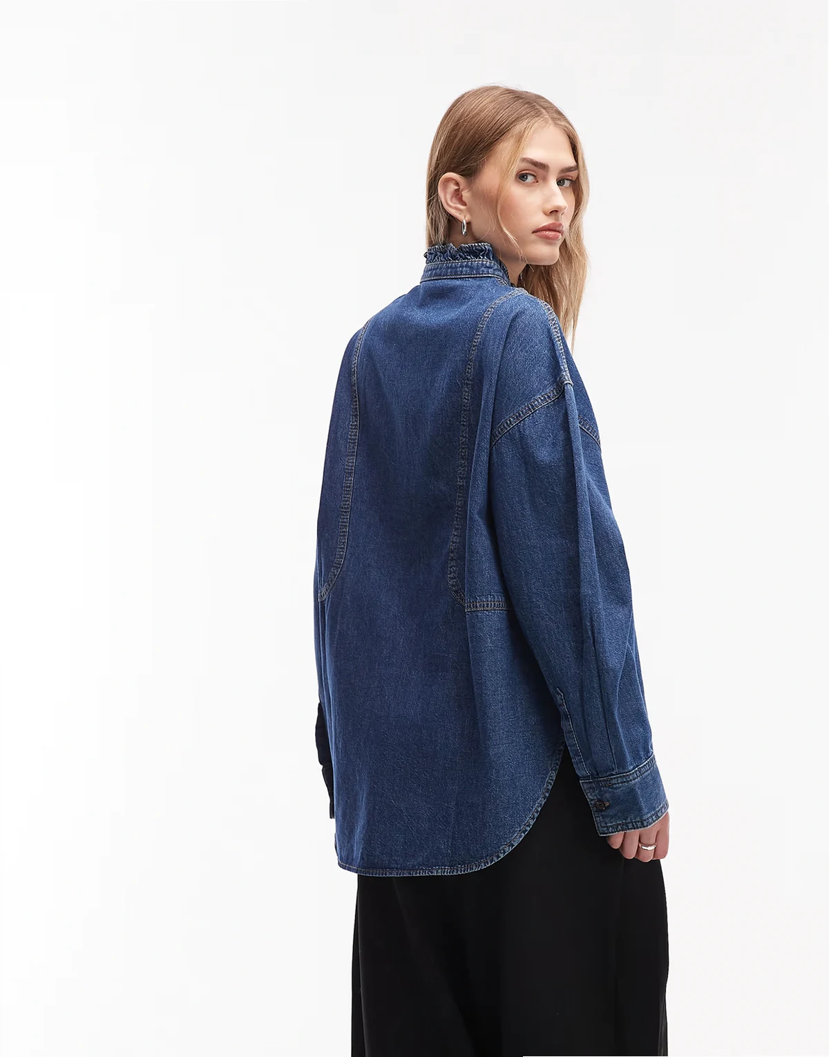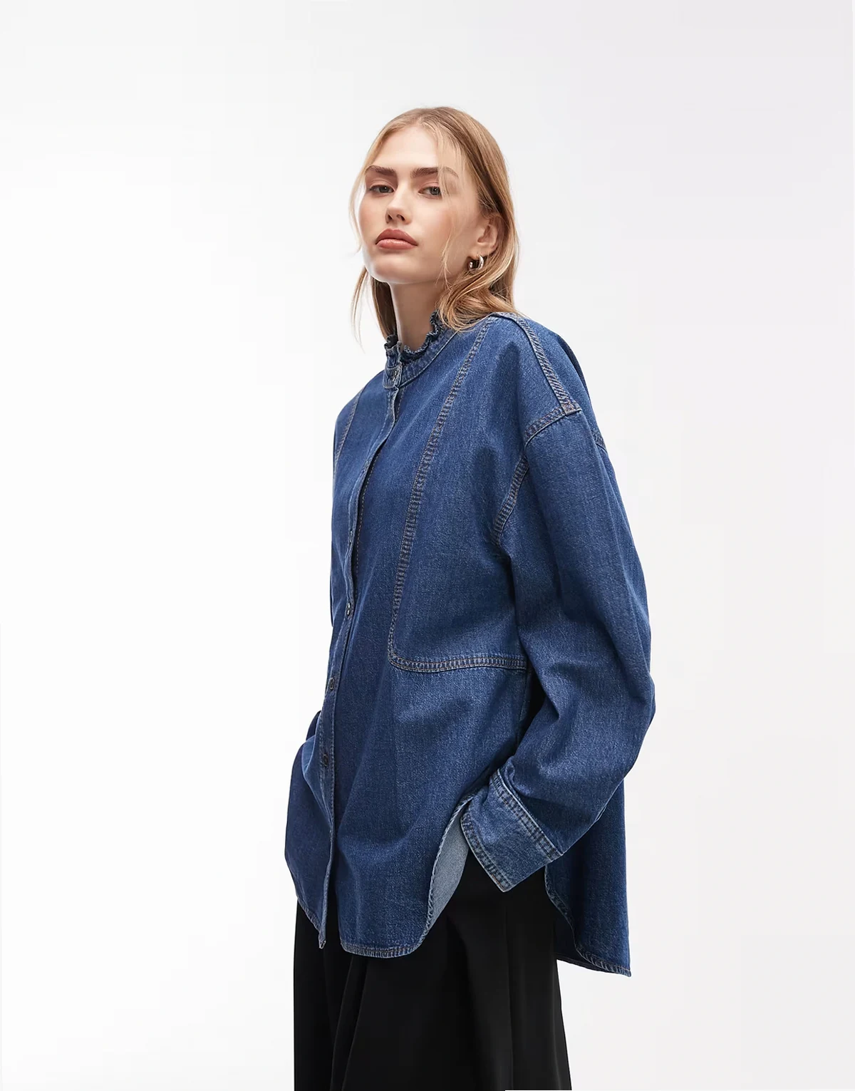 – Jeanshemd in blauer Waschung mit gerüschtem Grandad-Kragen
