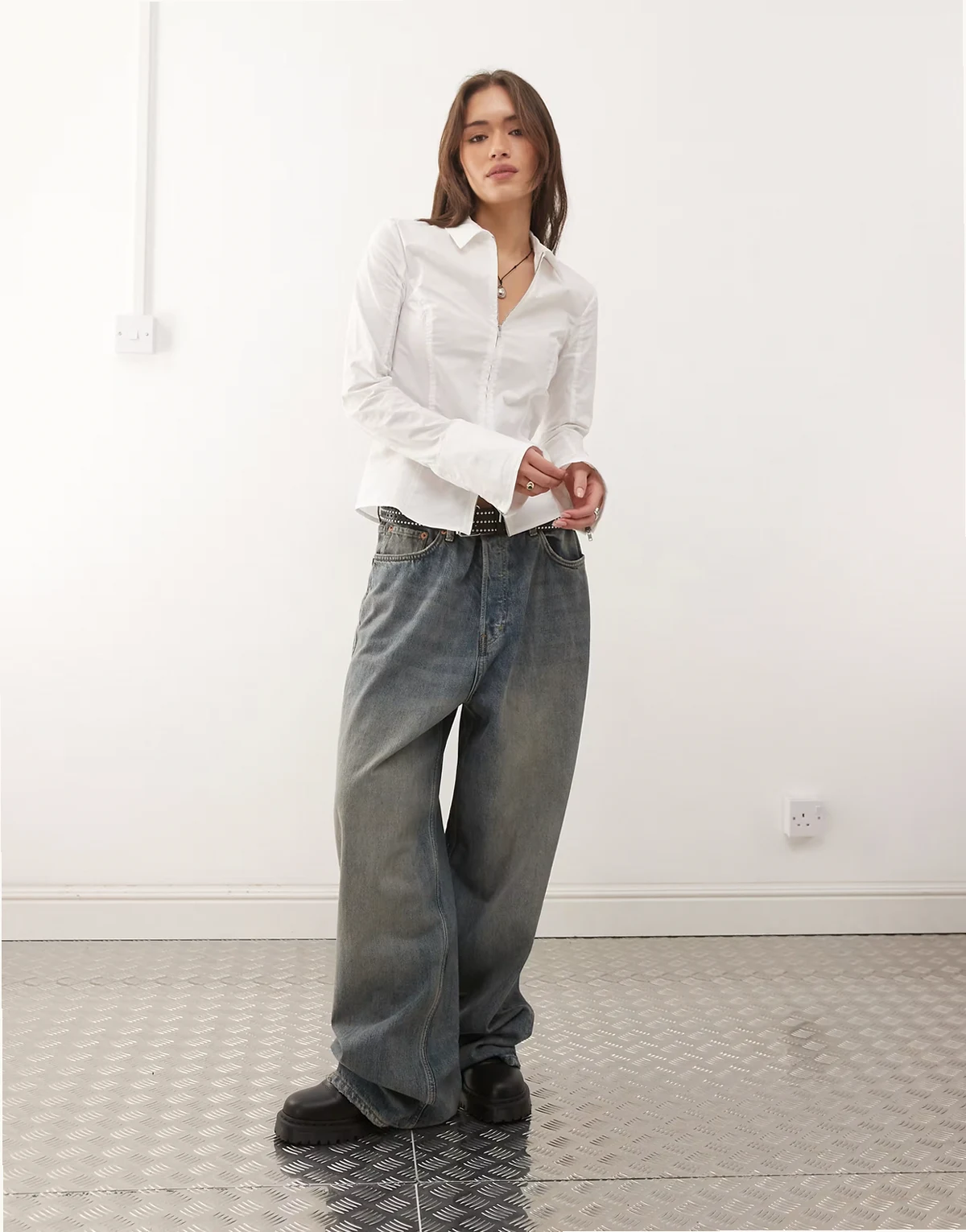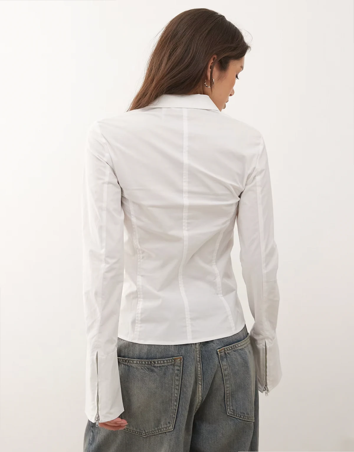 – Hemdbluse in Weiß mit ausgestellten Ärmeln und Reißverschluss
