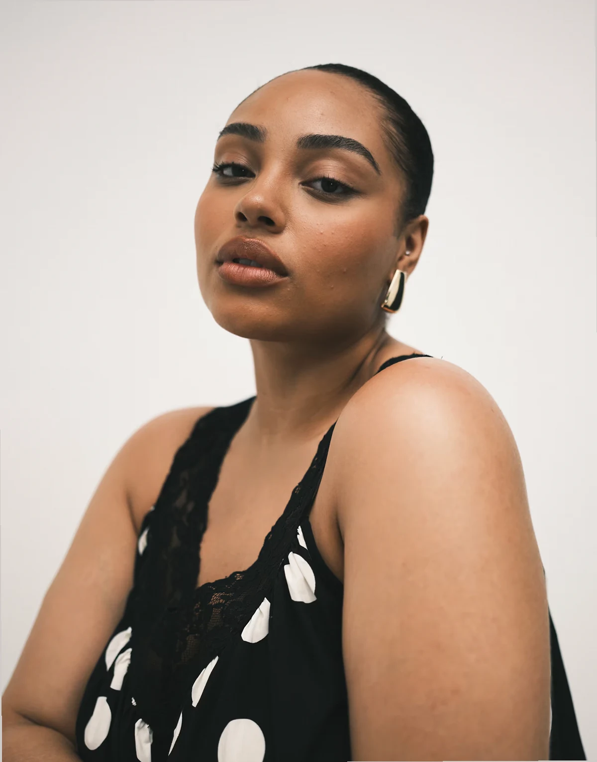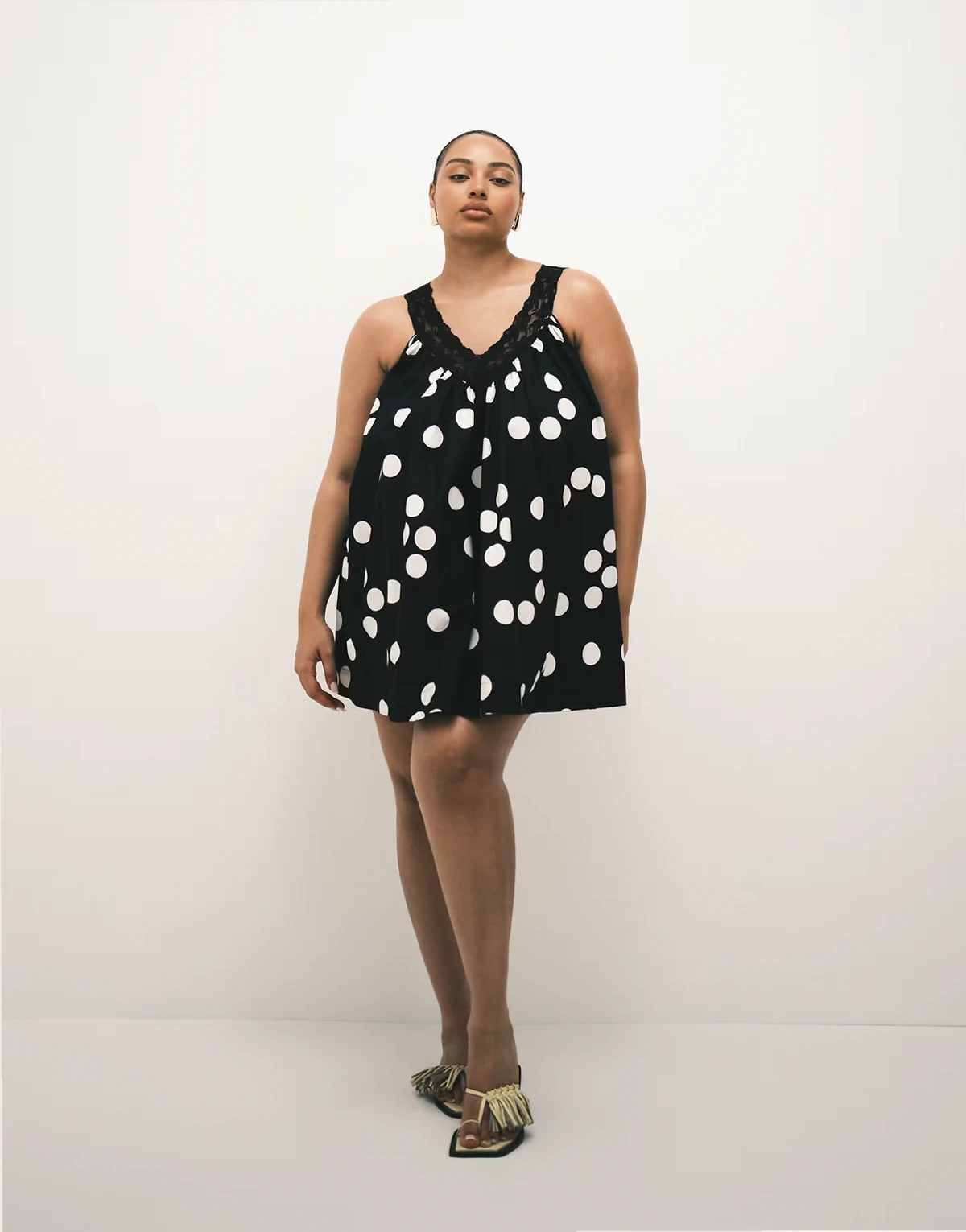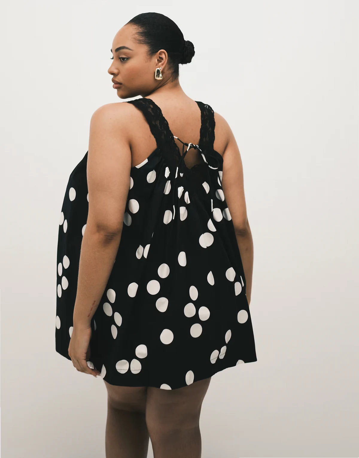ASOS DESIGN Curve – Sommerliches Mini-Hängerkleid aus Popeline in Schwarz-Weiß gepunktet mit V-Ausschnitt und Spitzen-Overlay