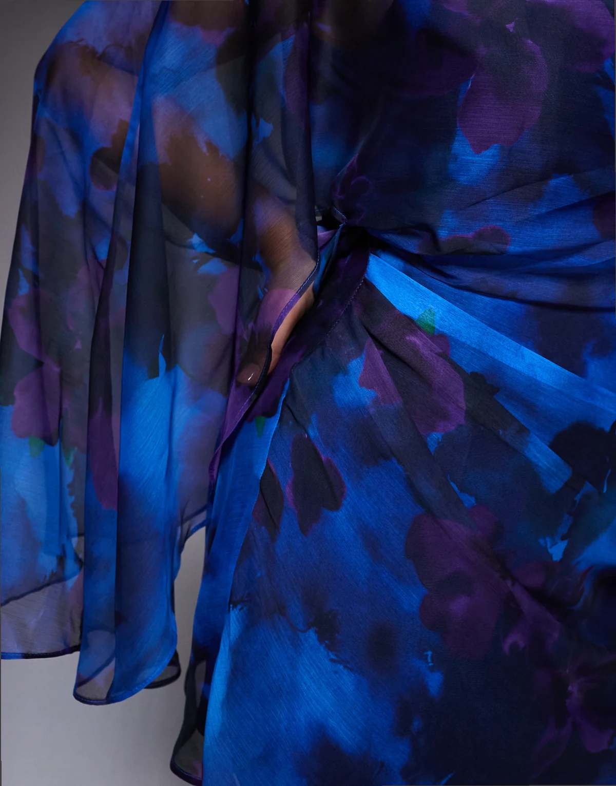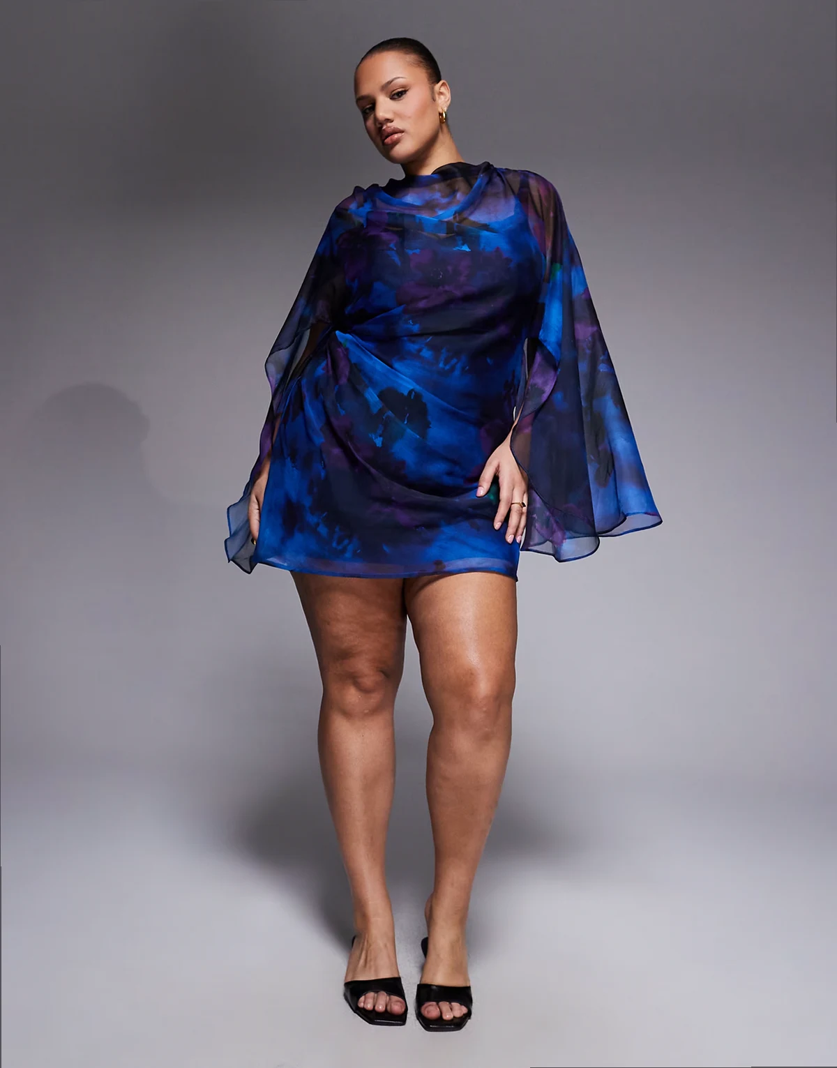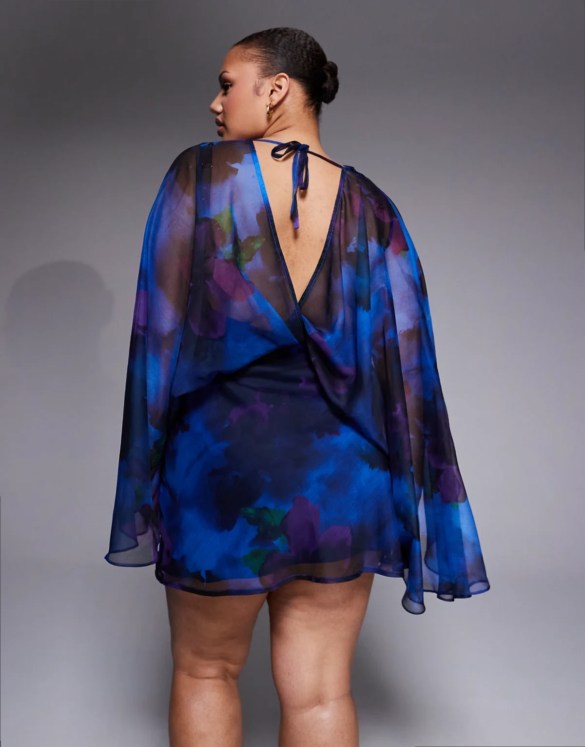 ASOS DESIGN Curve – Hochgeschlossenes Minikleid mit drapierter Vorderseite, extremen Cape-Ärmeln und blauem Blumenmuster