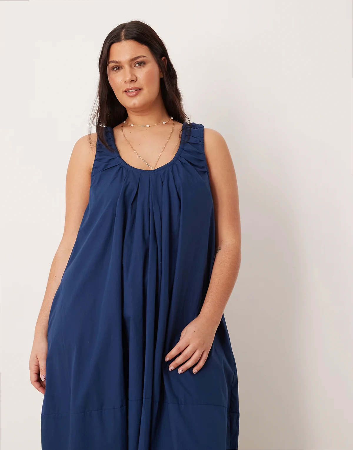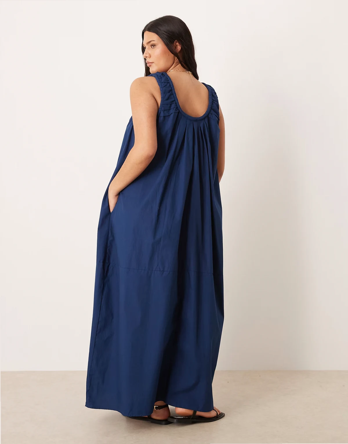ASOS DESIGN Curve – Sommerkleid in Maxilänge aus Popeline in Marineblau mit gerafftem U-Ausschnitt