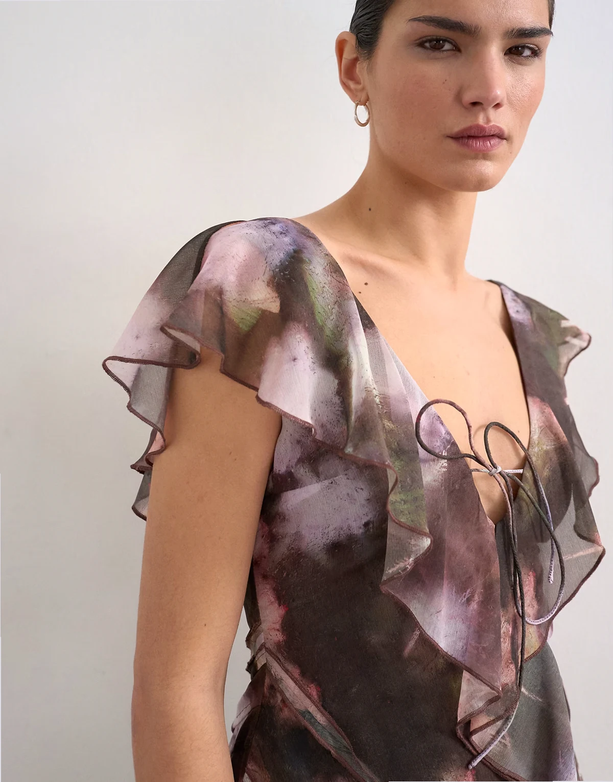Dieses Kleid ist aus durchscheinendem, fließendem Chiffon mit verschwommenem Blumenmuster gefertigt. Es ist mit Rüschenborten, einem tiefen V-Ausschnitt und Schnürung am Ausschnitt versehen.