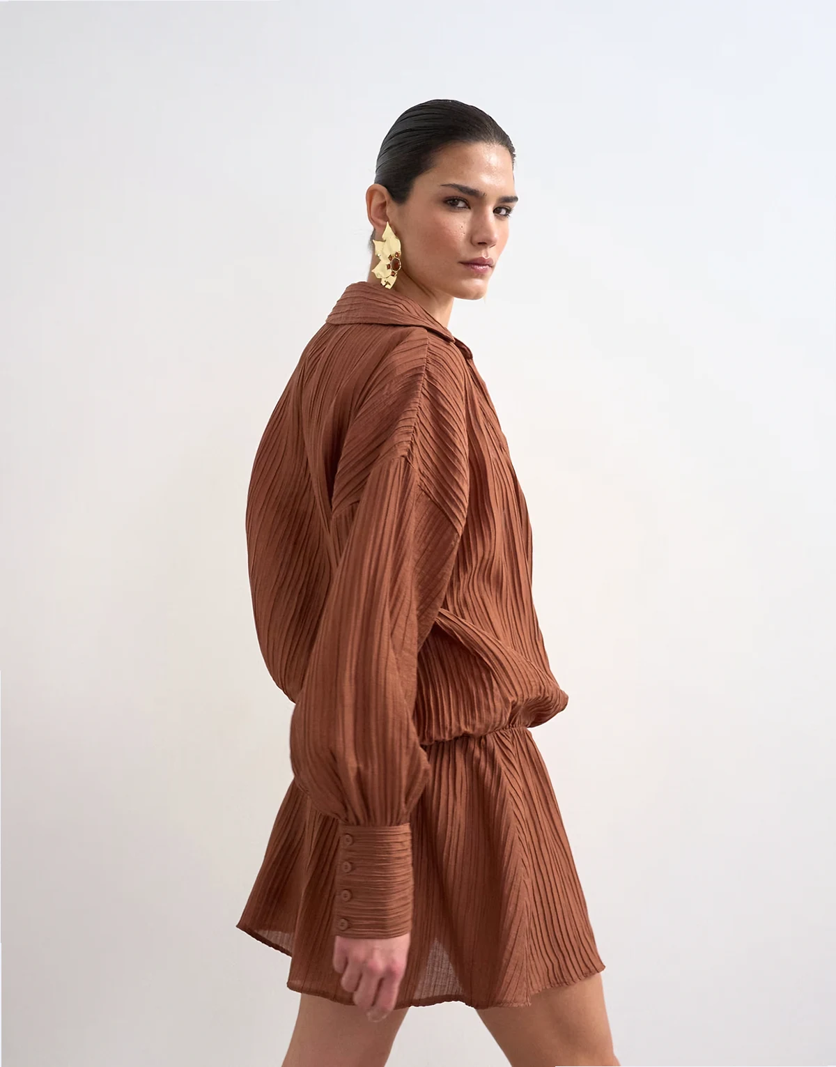 Dieses Kleid ist aus einem leichten, plissierten Stoff gefertigt. Das langärmlige Modell im regulärer Passform zeigt sich mit Rundhalsausschnitt und elastischem Bund.