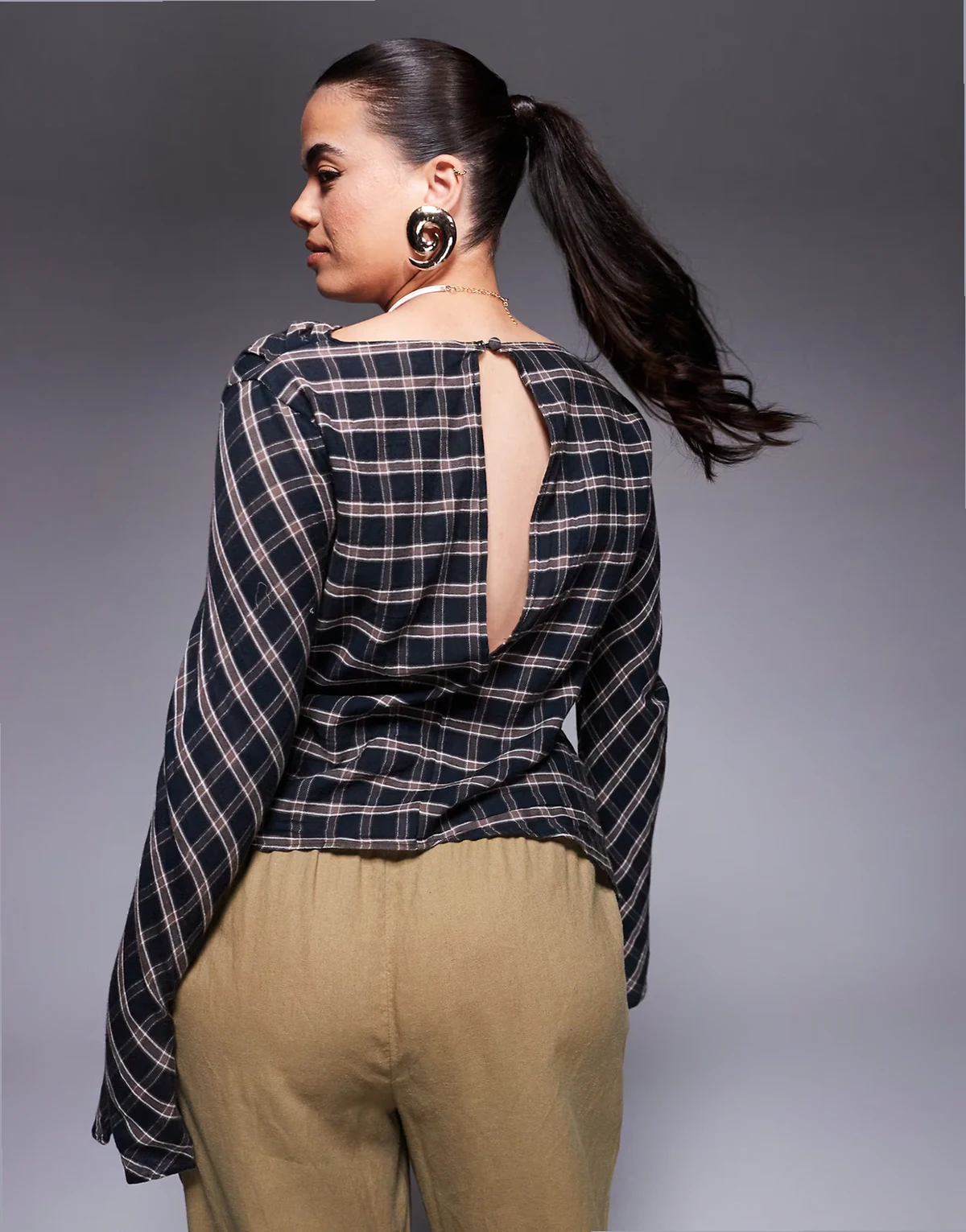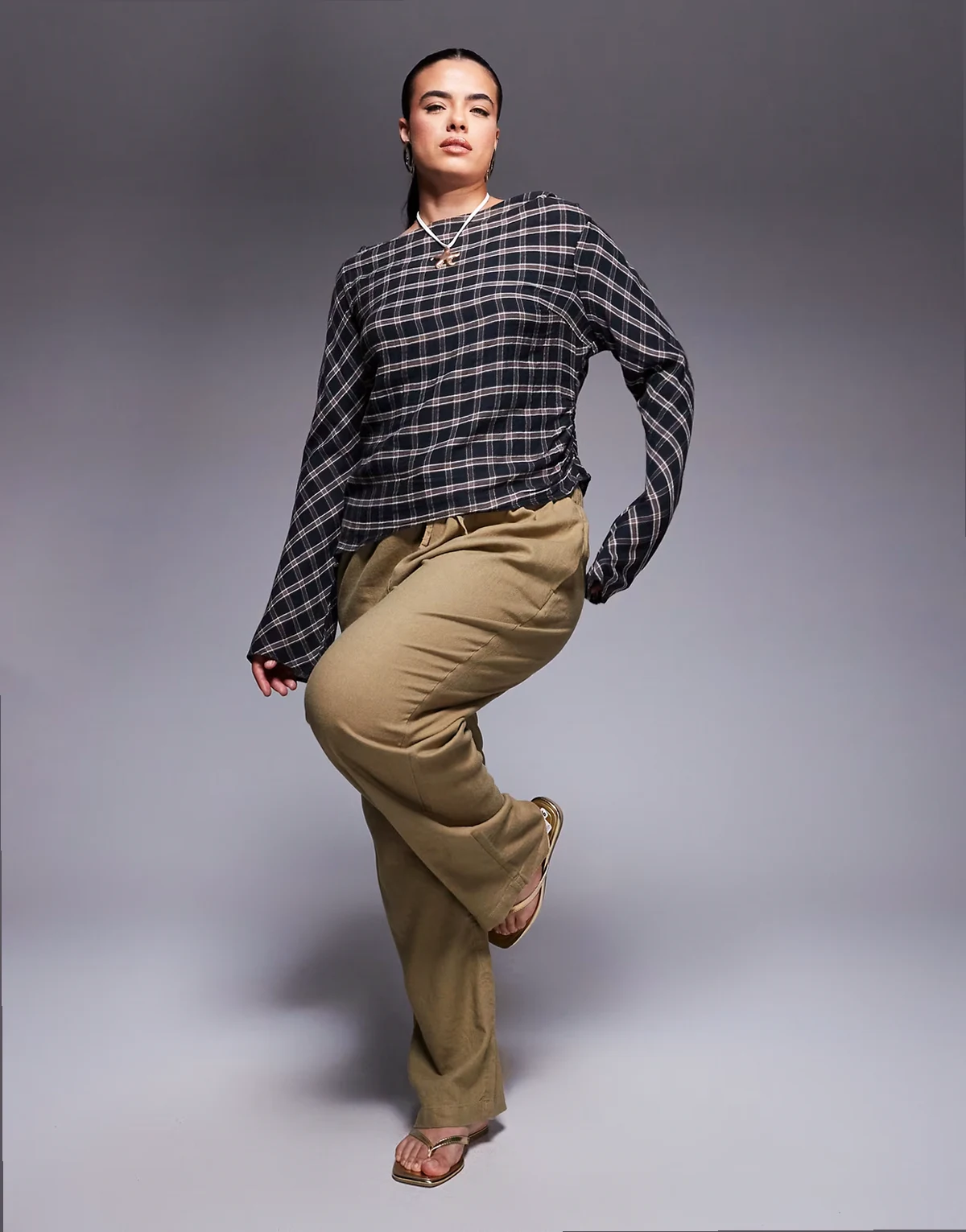 ASOS DESIGN Curve – Gerafftes Langärmliges Oberteil mit Karomuster und U-Boot-Ausschnitt