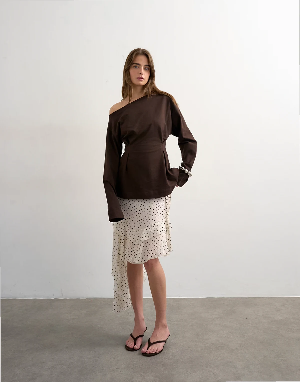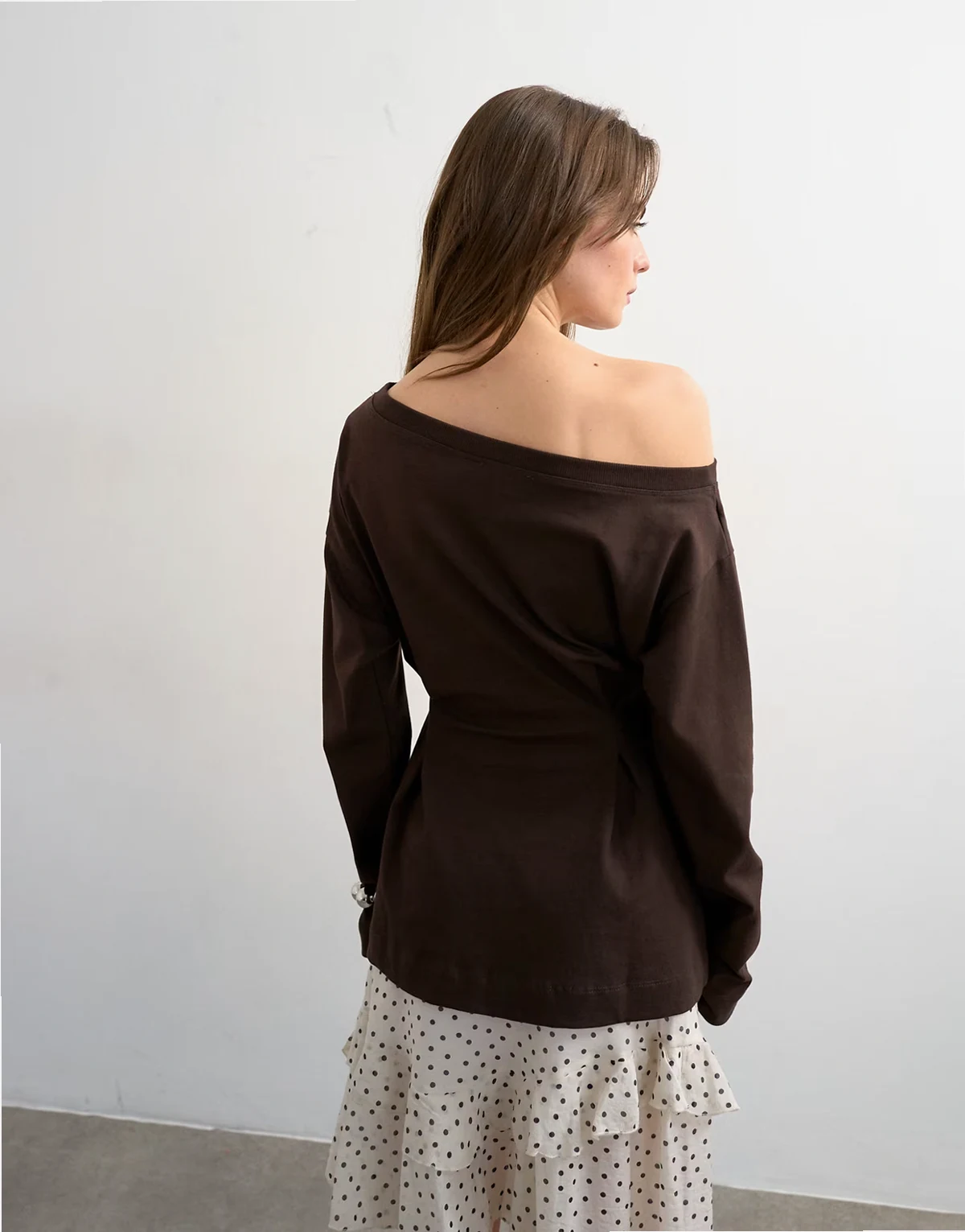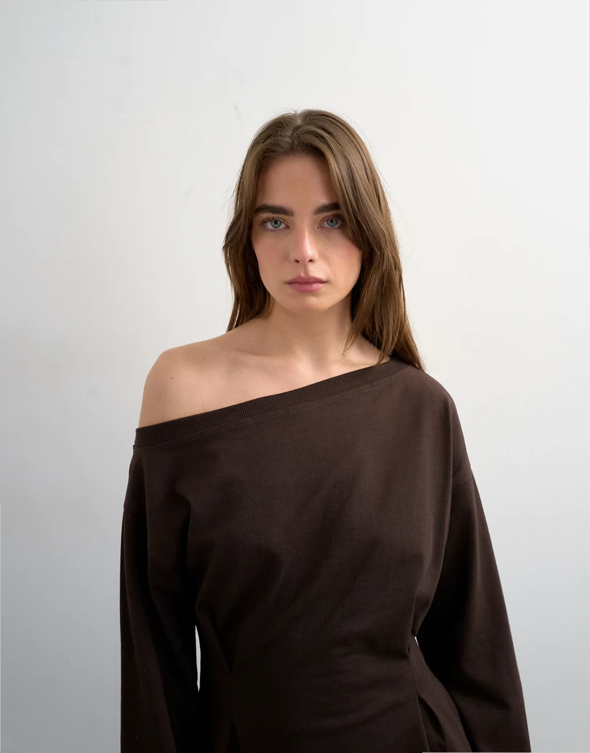 Dieses Oberteil ist aus einem weichen, elastischen Jersey in einem schokobraunen Farbton gefertigt. Das schulterfreie Modell zeichnet sich durch lange Ärmel, geraffte Details und eine normale Passform aus.