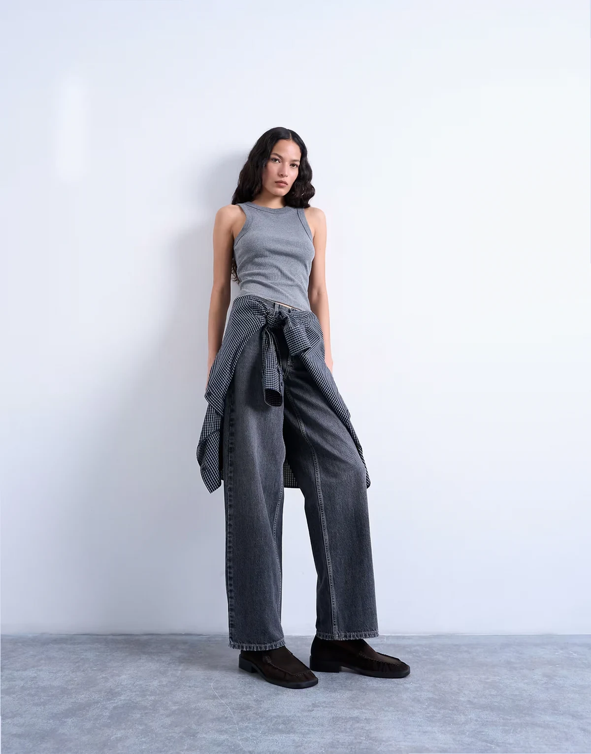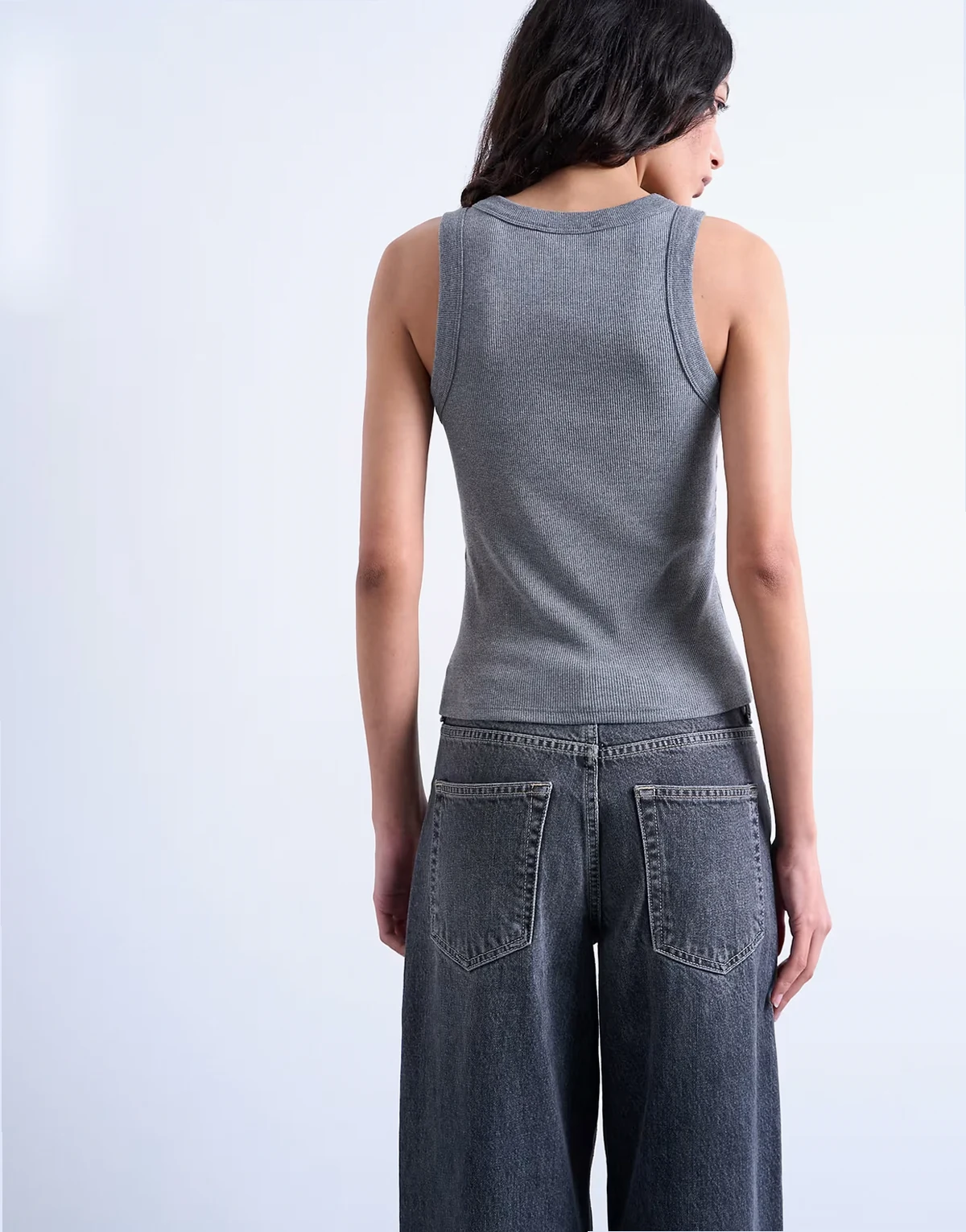 Dieses Trägertop ist aus geripptem Jersey in meliertem Grau gefertigt. Das Modell verfügt über einen Rundhalsausschnitt, einen Ringerrücken und eine normale Passform.