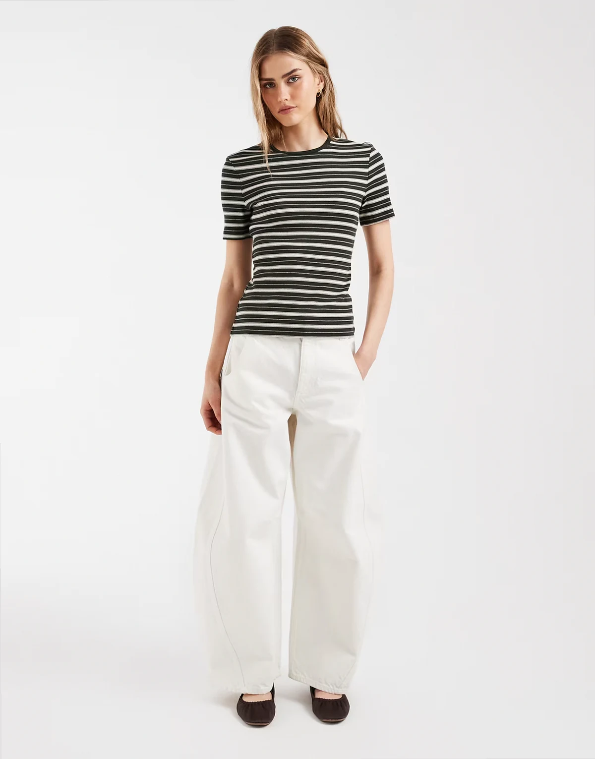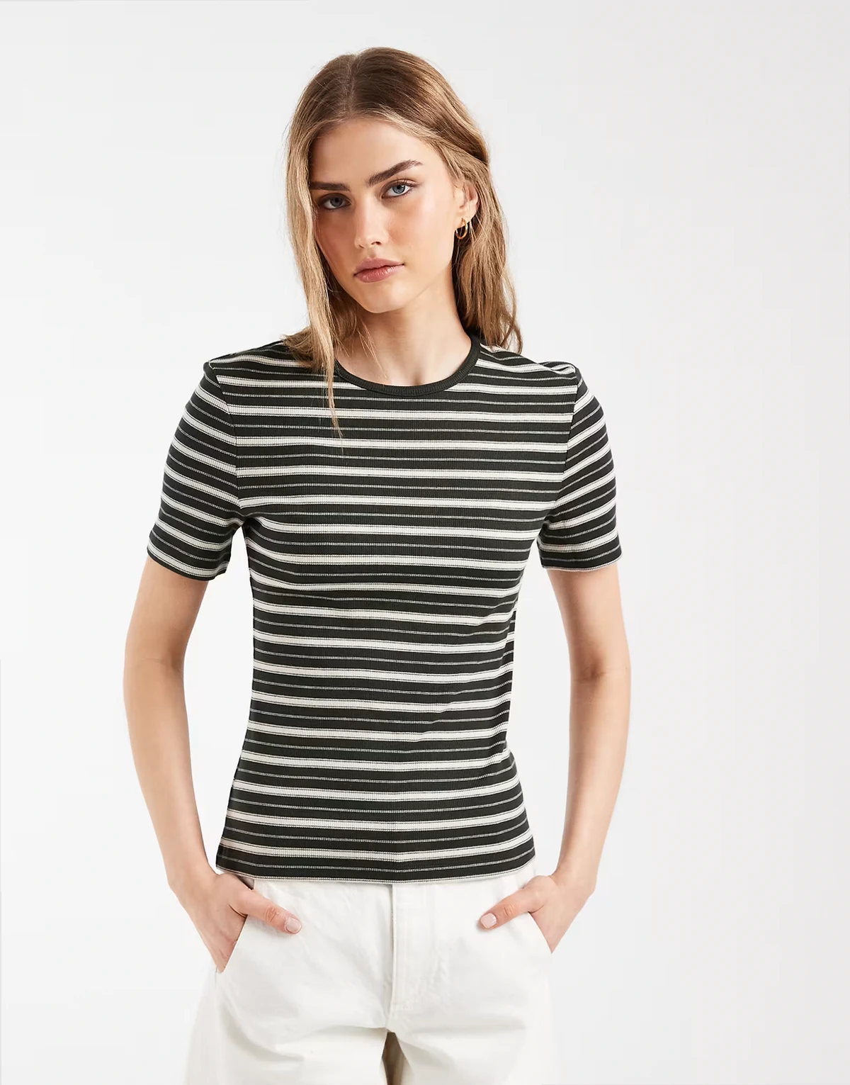 – Geripptes, superweiches T-Shirt in Dunkelgrün mit Streifen und schmalem Schnitt