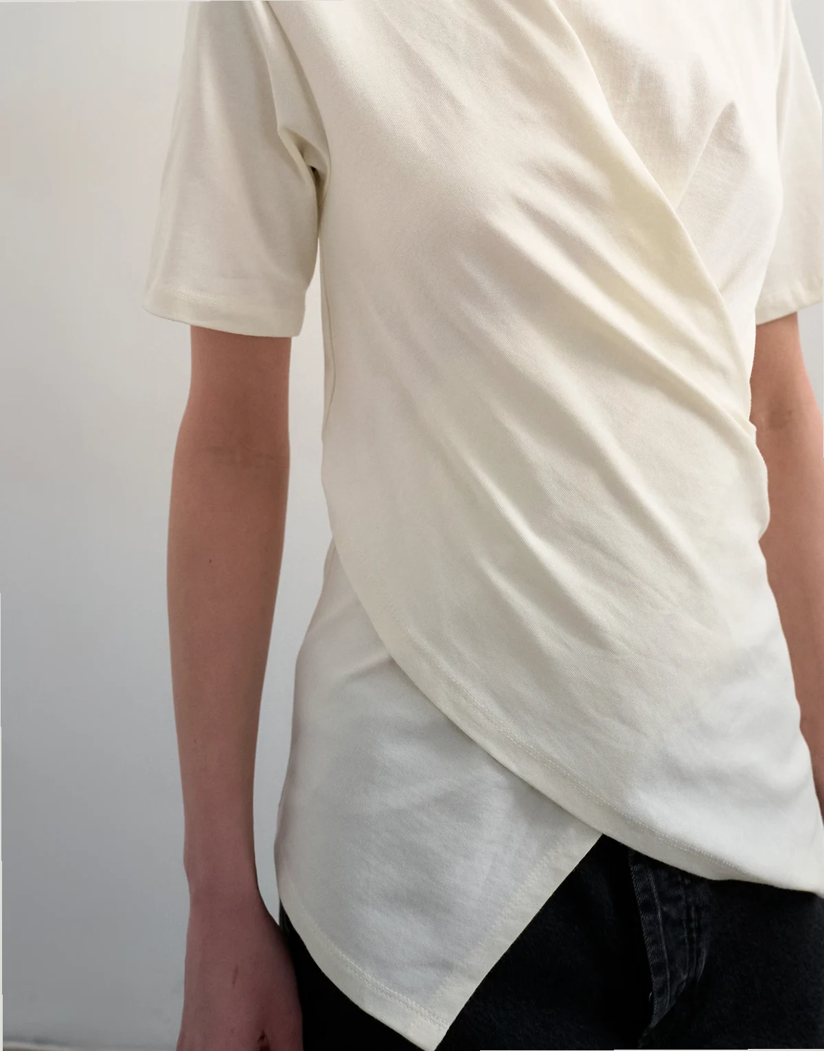 Dieses Oberteil ist aus Jersey in schlichtem Design gefertigt. Es hat einen Rundhalsausschnitt, kurze Ärmel, eine gewickelte Vorderseite und einen Regular-Fit-Schnitt.