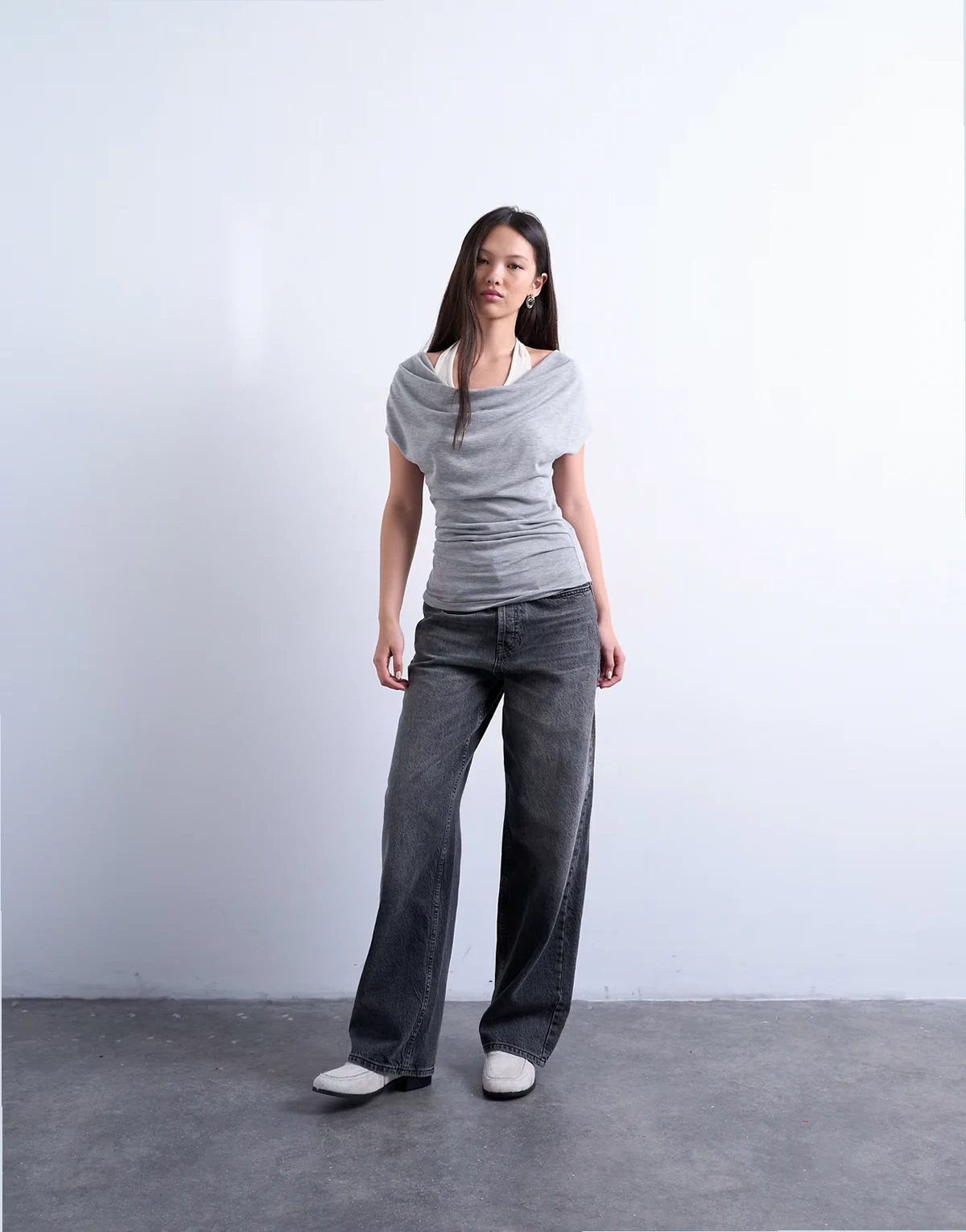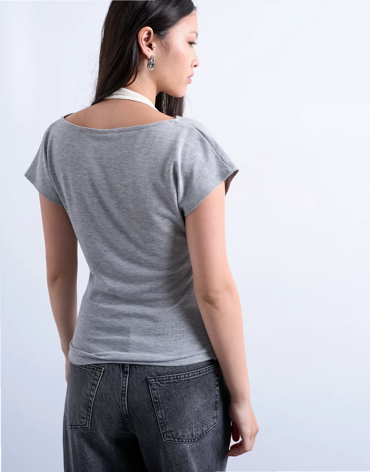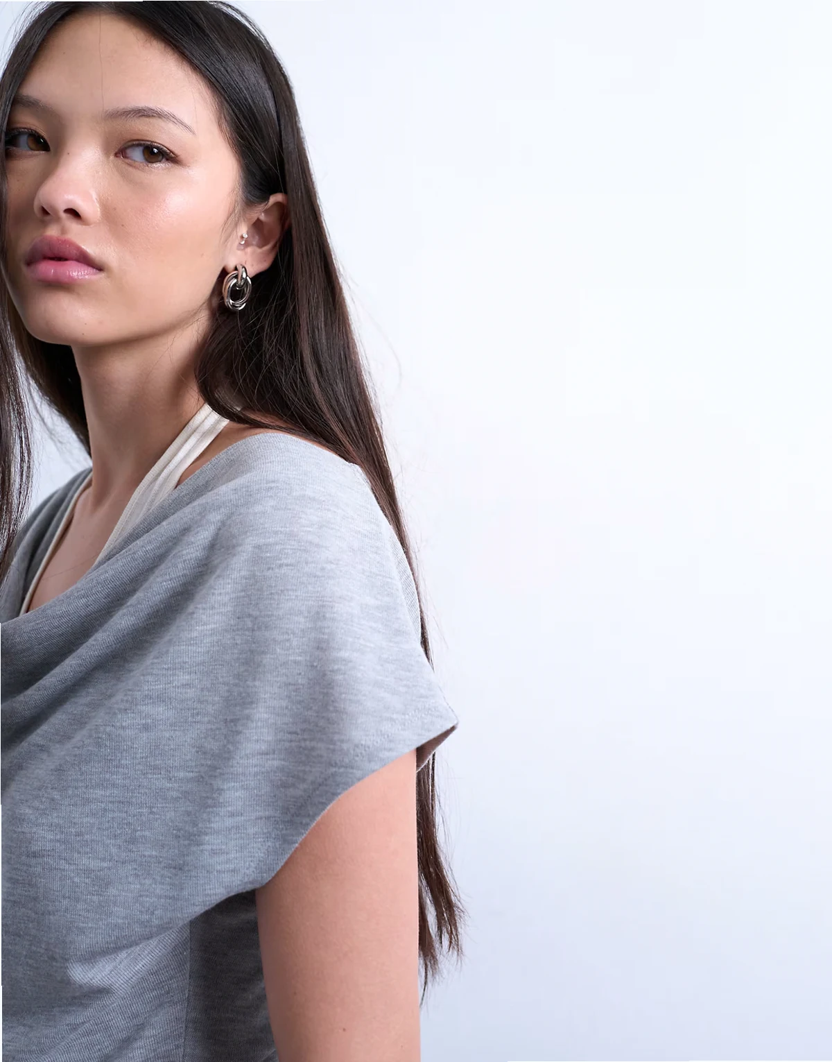 Dieses Oberteil ist aus einem weichen und elastischen Strickstoff gefertigt. Dieses Modell mit doppellagigem Design verfügt über einen Wasserfallausschnitt, kurze Ärmel und eine normale Passform.