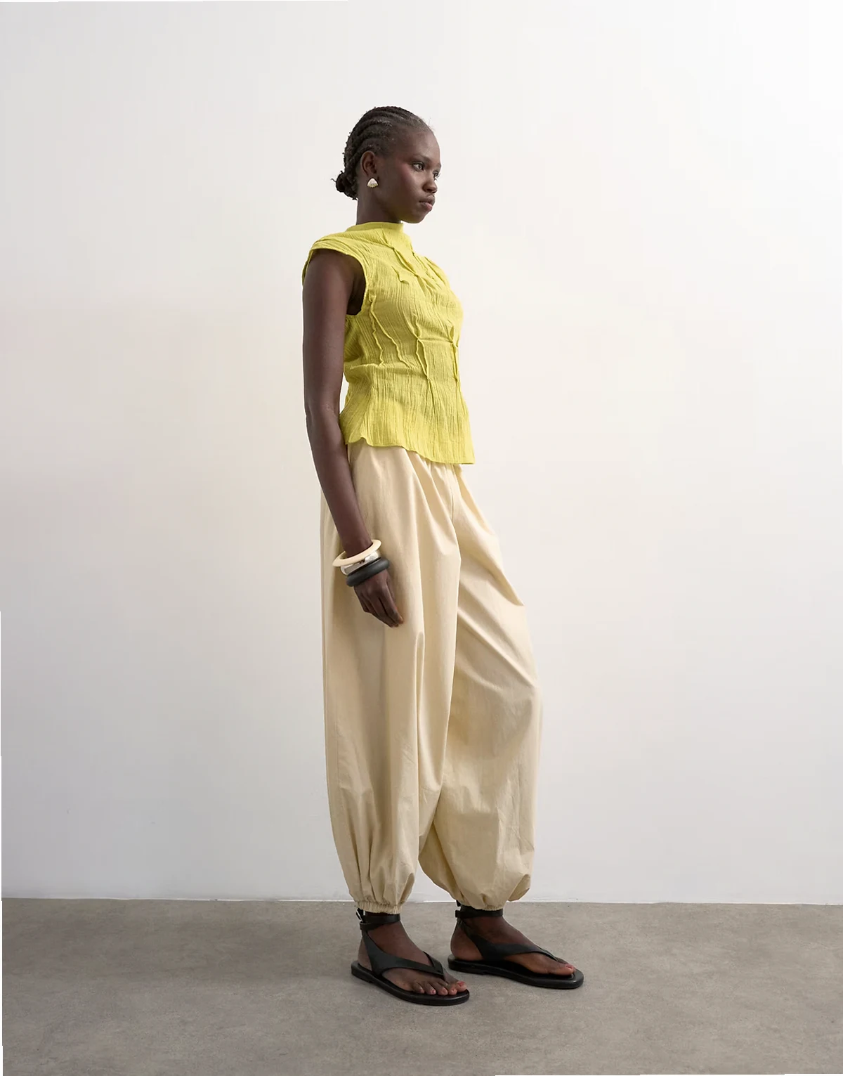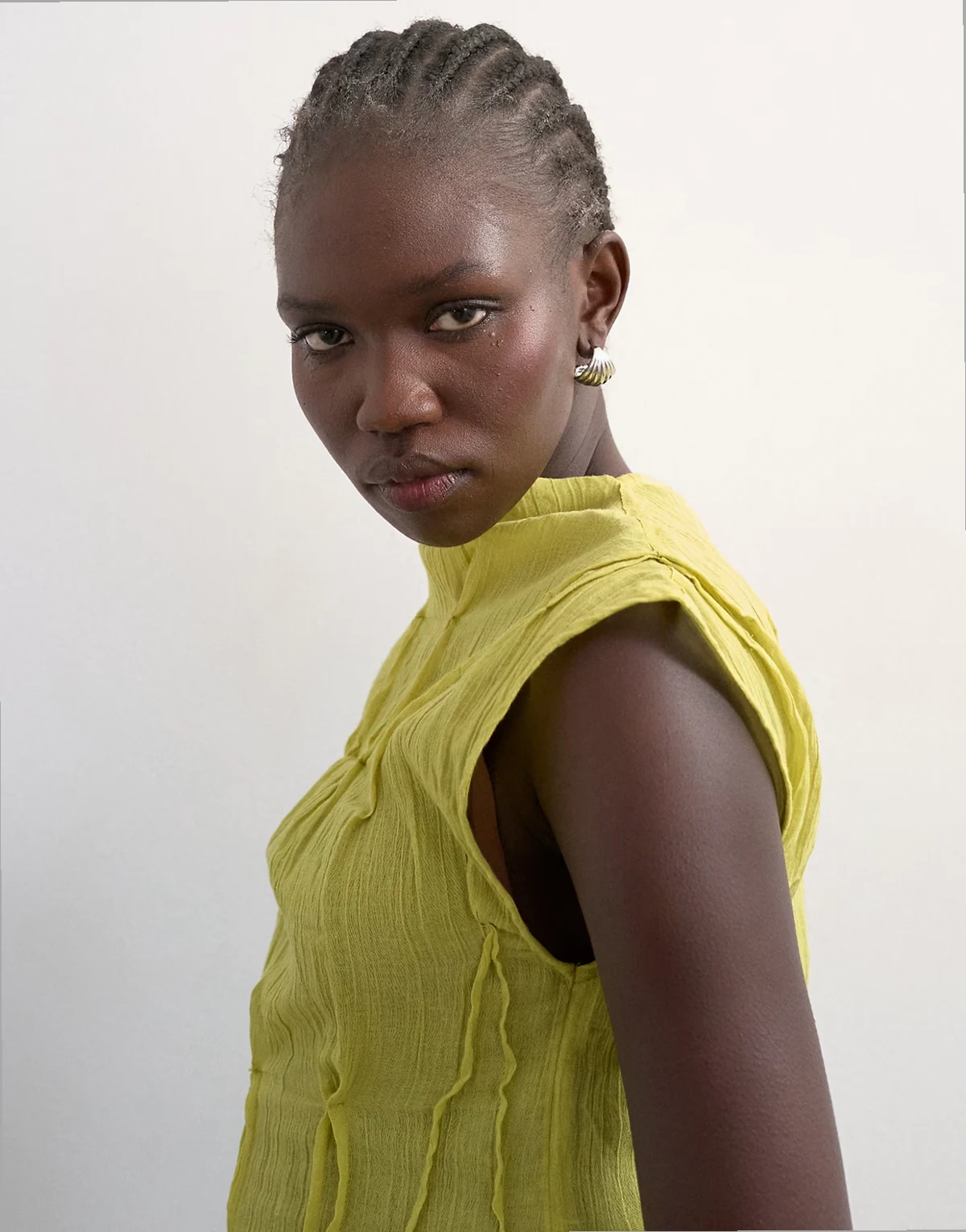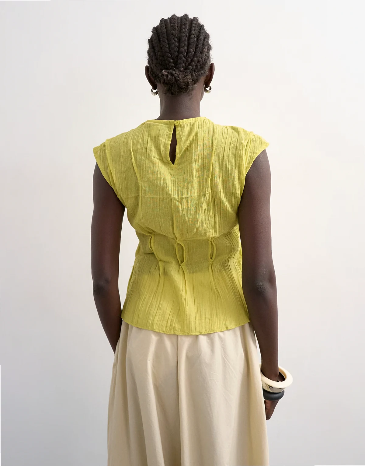 Dieses Oberteil besteht aus einem Webstoff mit Knitterstruktur. Das hochgeschlossene Modell zeigt sich mit einfarbigem Design, einer ärmellose Silhouette, einem Schlüsselloch-Knopfverschluss am Rücken und einer regulären Passform.