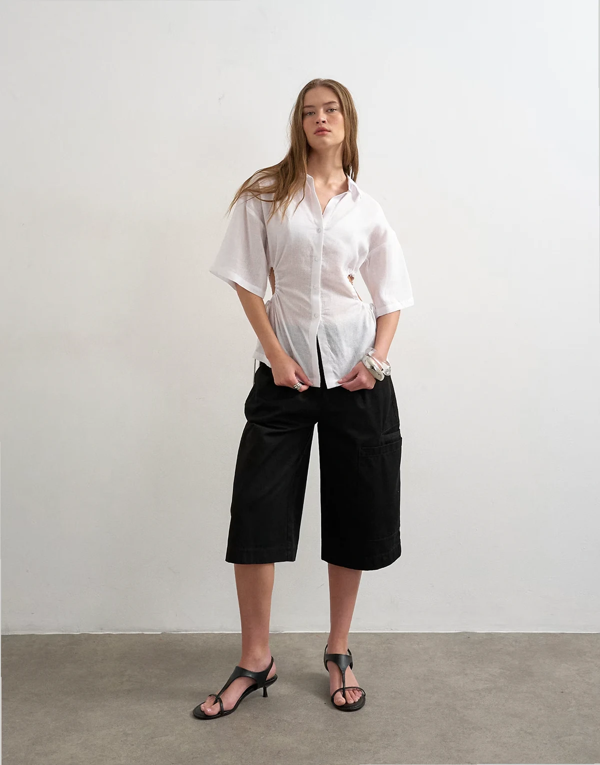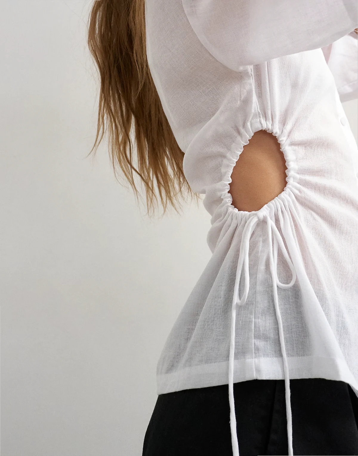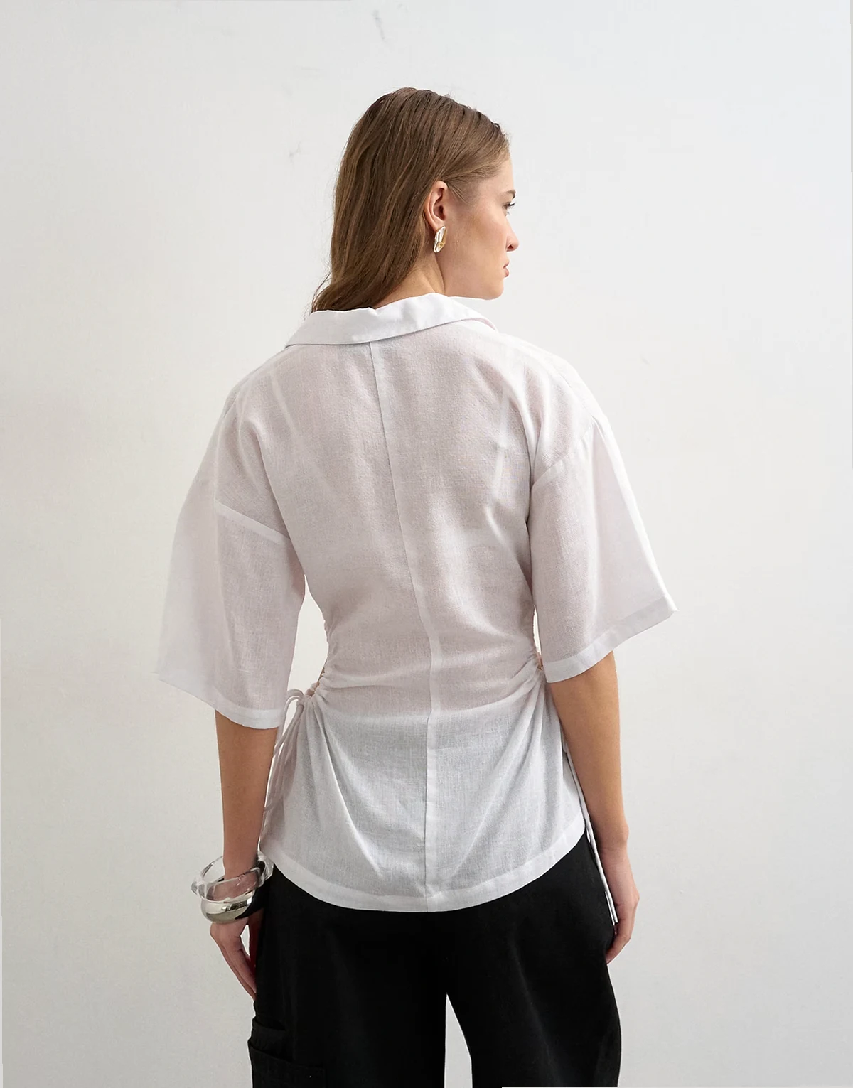 Dieses Hemd ist aus Webstoff in einem Weißton gefertigt. Das Design verfügt über einen gespreizten Kragen, eine Knopfleiste und Cut-out-Details an den Seiten. Dieses Modell im Regular Fit mit betonter Taille wird durch Raffungen, Bindeverschlüsse und kurze Ärmel abgerundet.