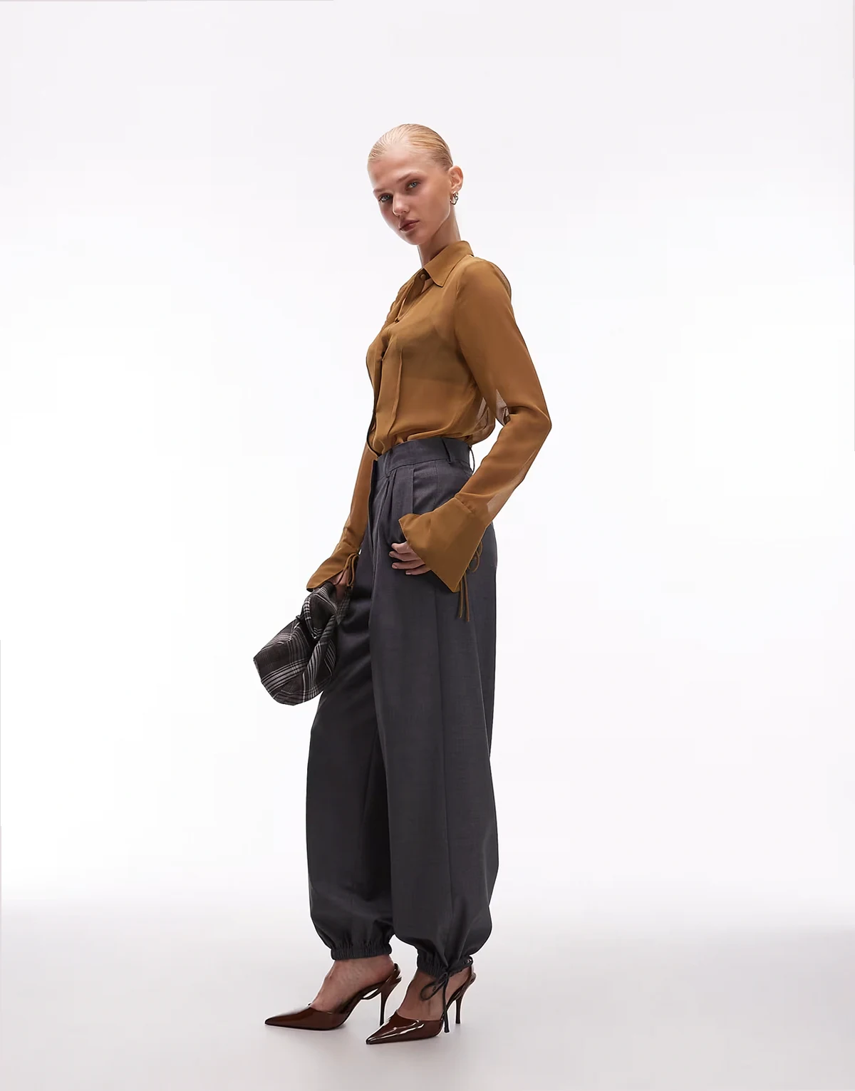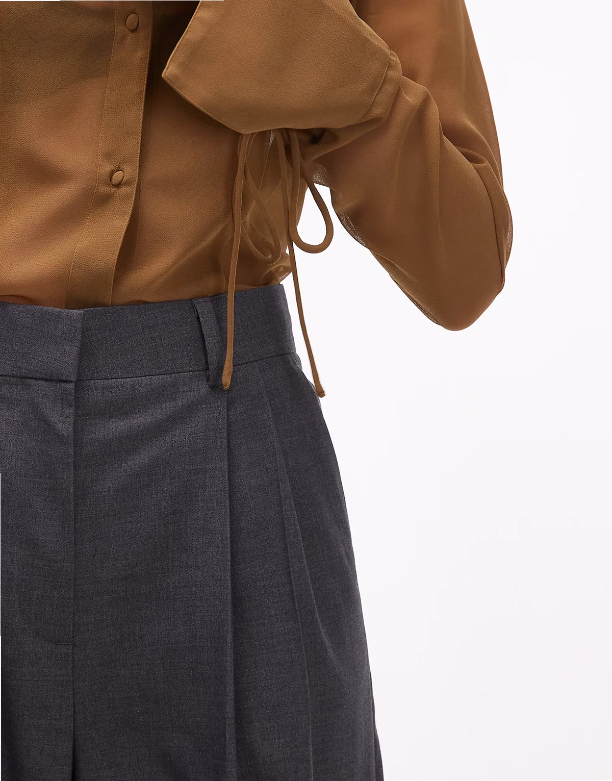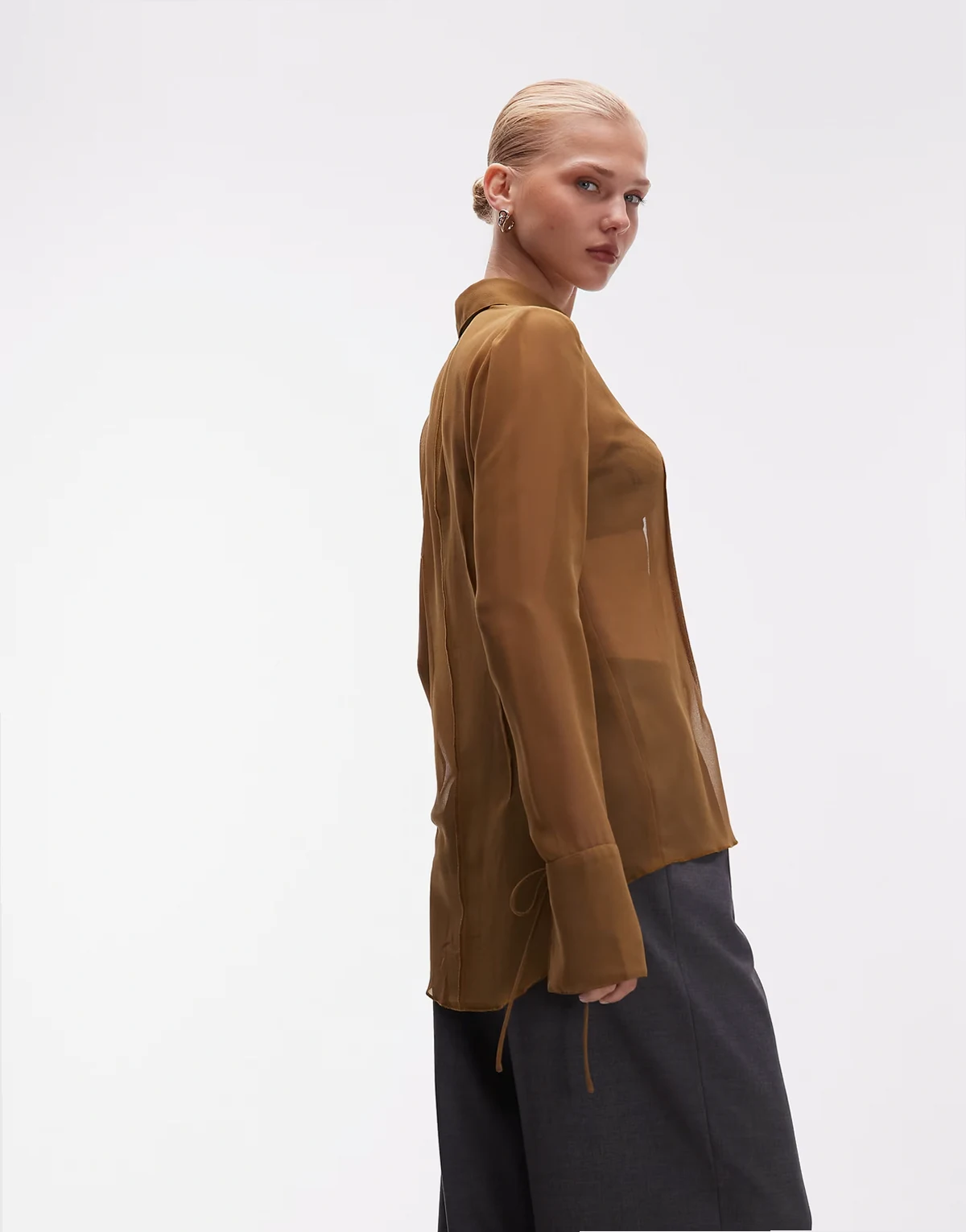 ‑ Durchscheinende, goldbraune Hemdbluse im 90er-Stil