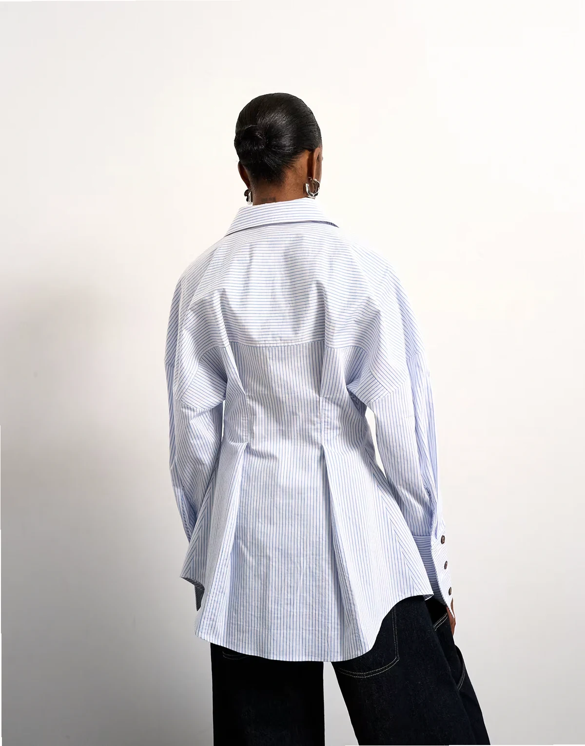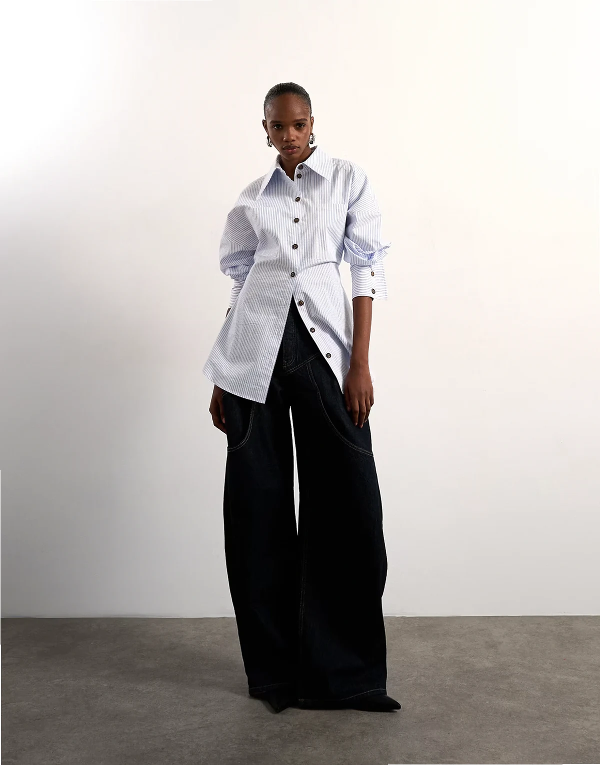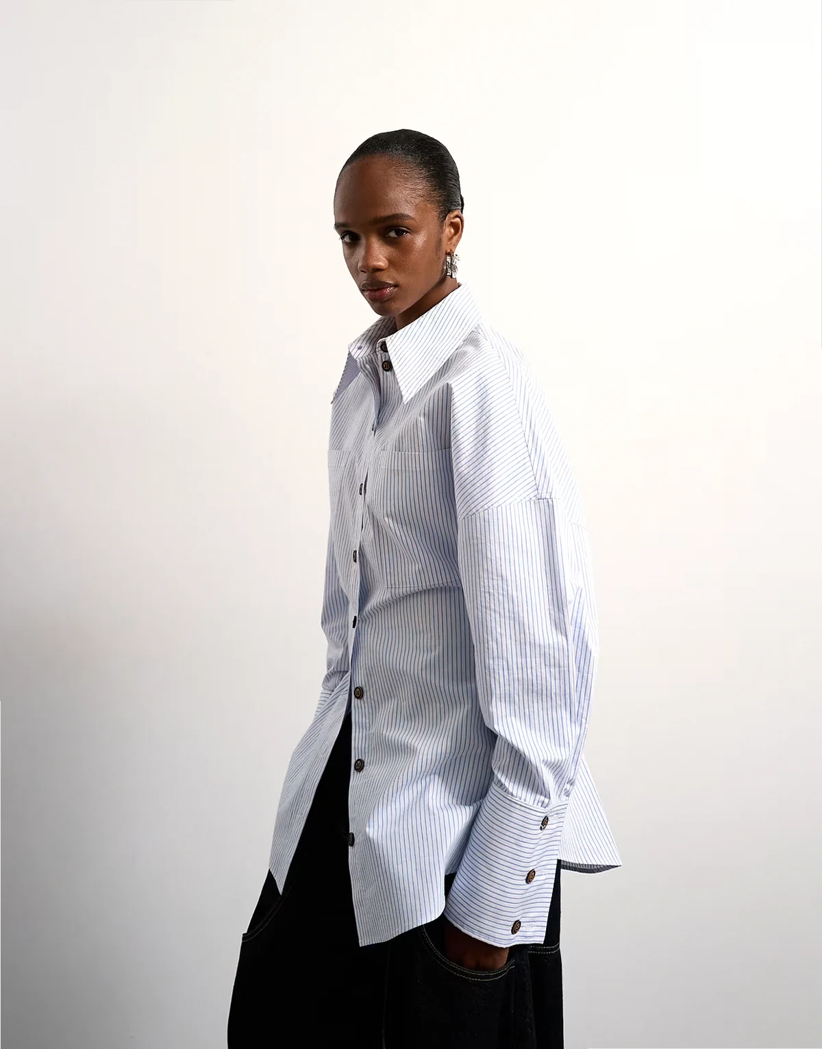 Dieses Hemd ist aus einem Webstoff mit Streifenmuster gefertigt. Das Modell verfügt über einen Statement-Kragen, eine Knopfleiste, Brusttaschen, taillierte Details und eine reguläre Longline-Passform.