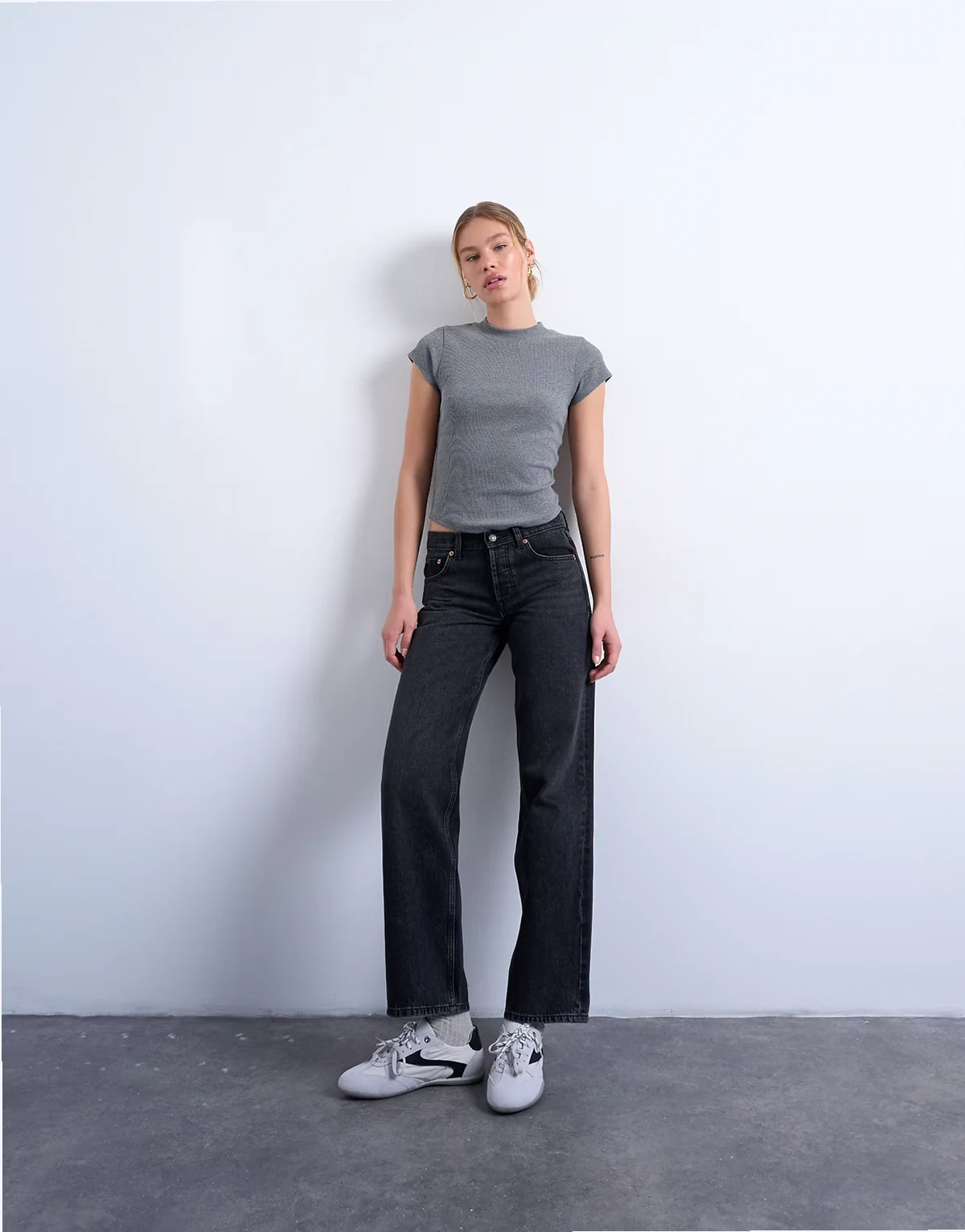 – Geripptes, figurbetontes T-Shirt in meliertem Grau mit abgerundetem Saum