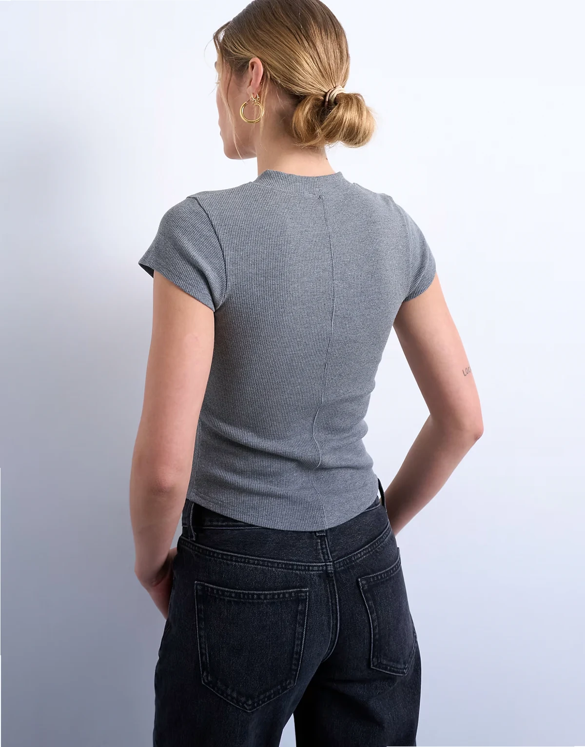 Dieses T-Shirt ist aus einem elastischen Jersey in Grau mit geripptem Finish gefertigt. Das Modell präsentiert sich mit hohem Kragen, Flügelärmeln und abgerundetem Saum. Am Rücken ist es mit einer Naht versehen und hat eine schmale Passform.