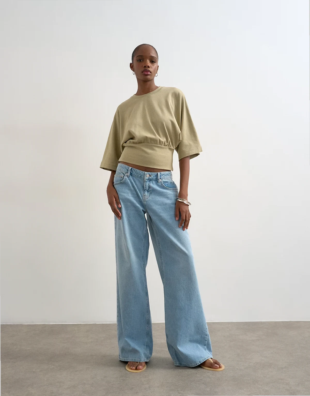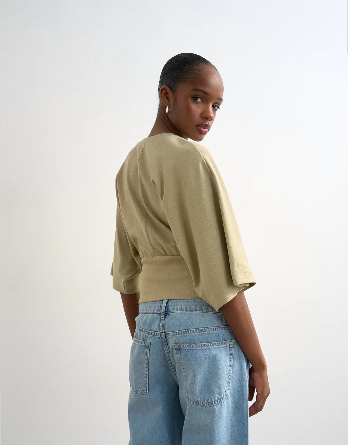 Dieses Oberteil ist aus weichem Stretch-Jersey in einem hellen Khakiton gefertigt. Das Modell im Relaxed Fit hat einen Rundhalsausschnitt, halblange Ärmel und eine taillierte Passform.