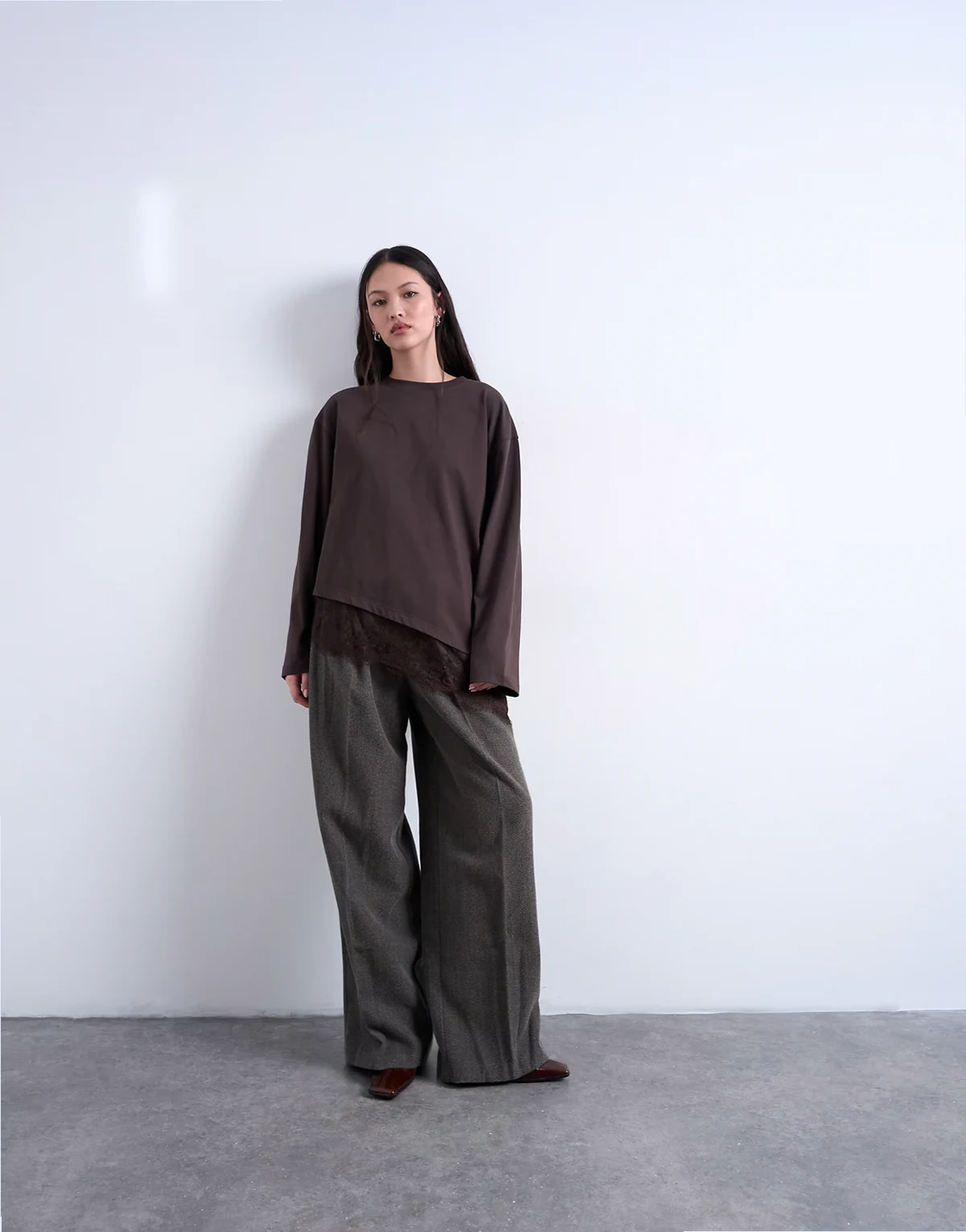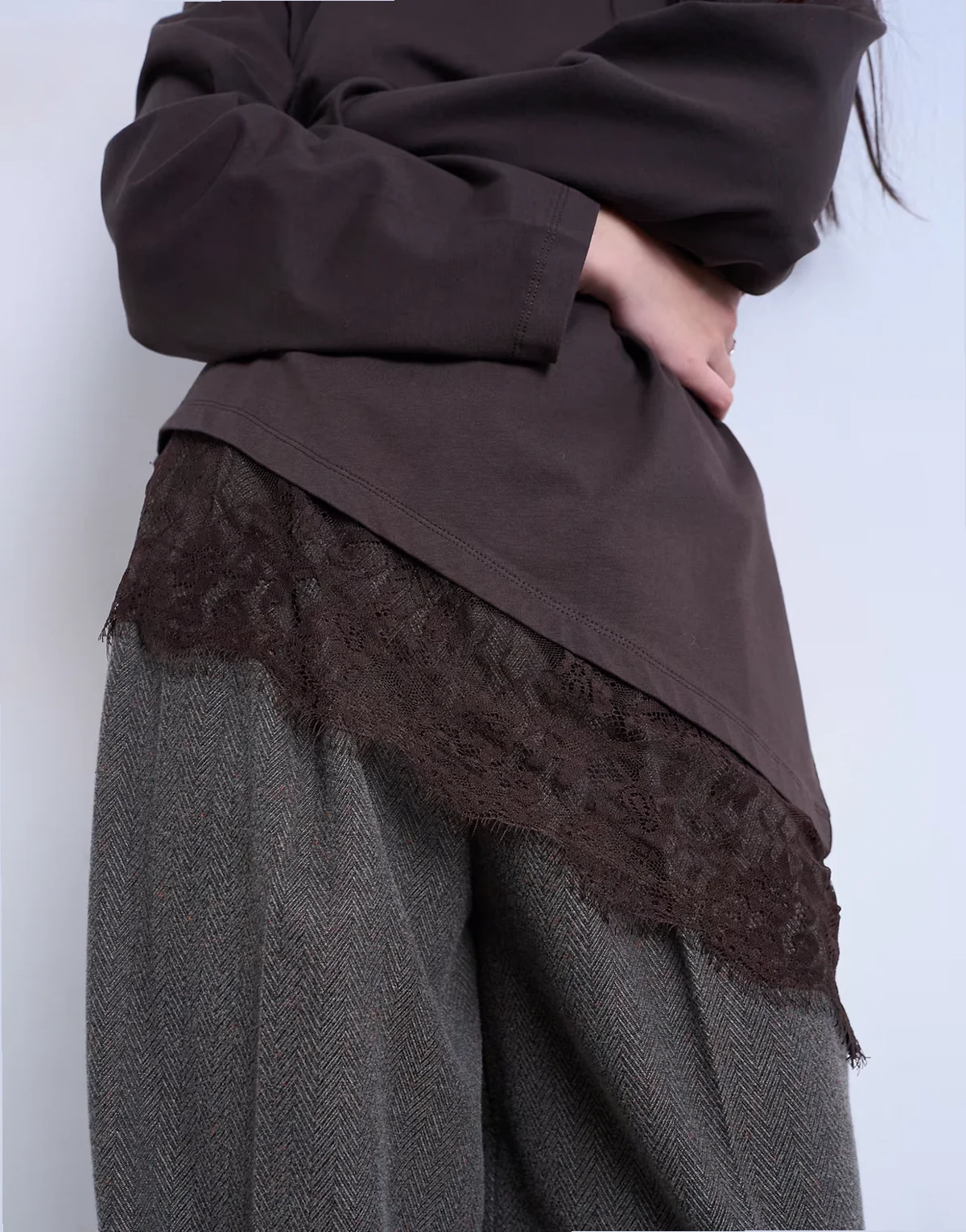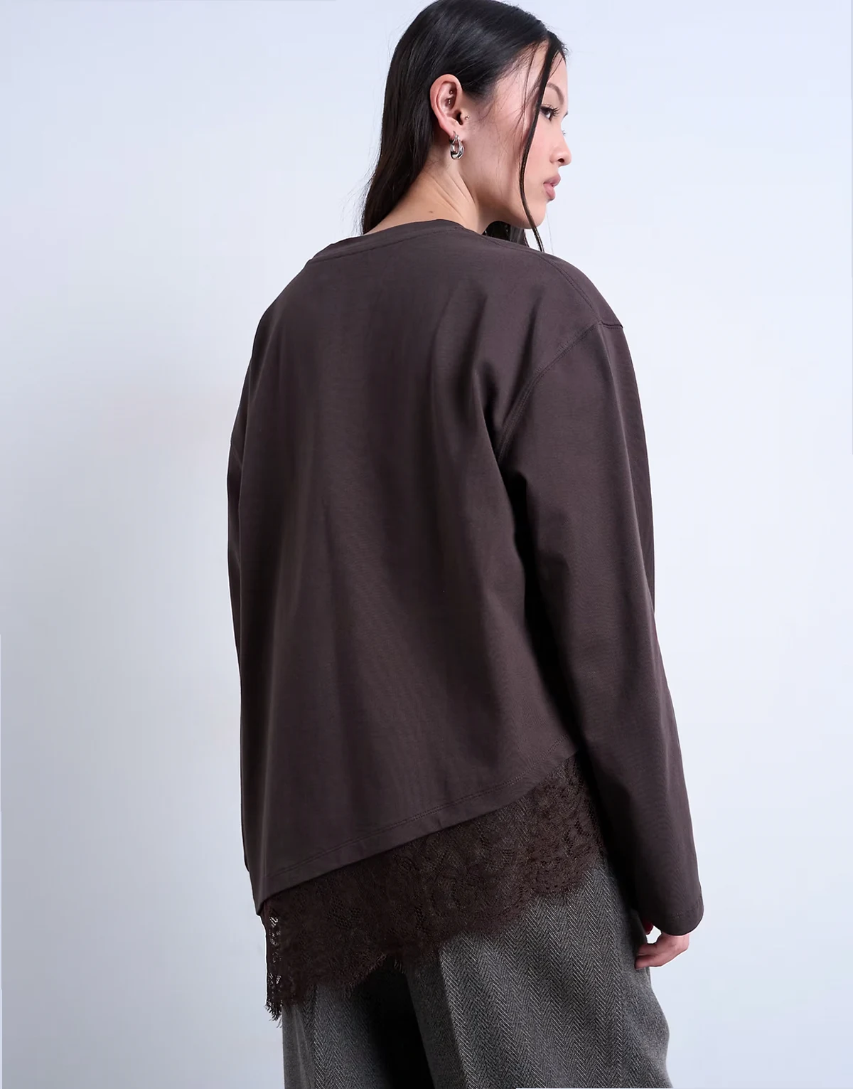 Dieses T-Shirt ist aus Jersey-Stoff gefertigt. Das Modell verfügt über einen Rundhalsausschnitt, lange Ärmel, einen Spitzenbesatz und eine Oversize-Passform.