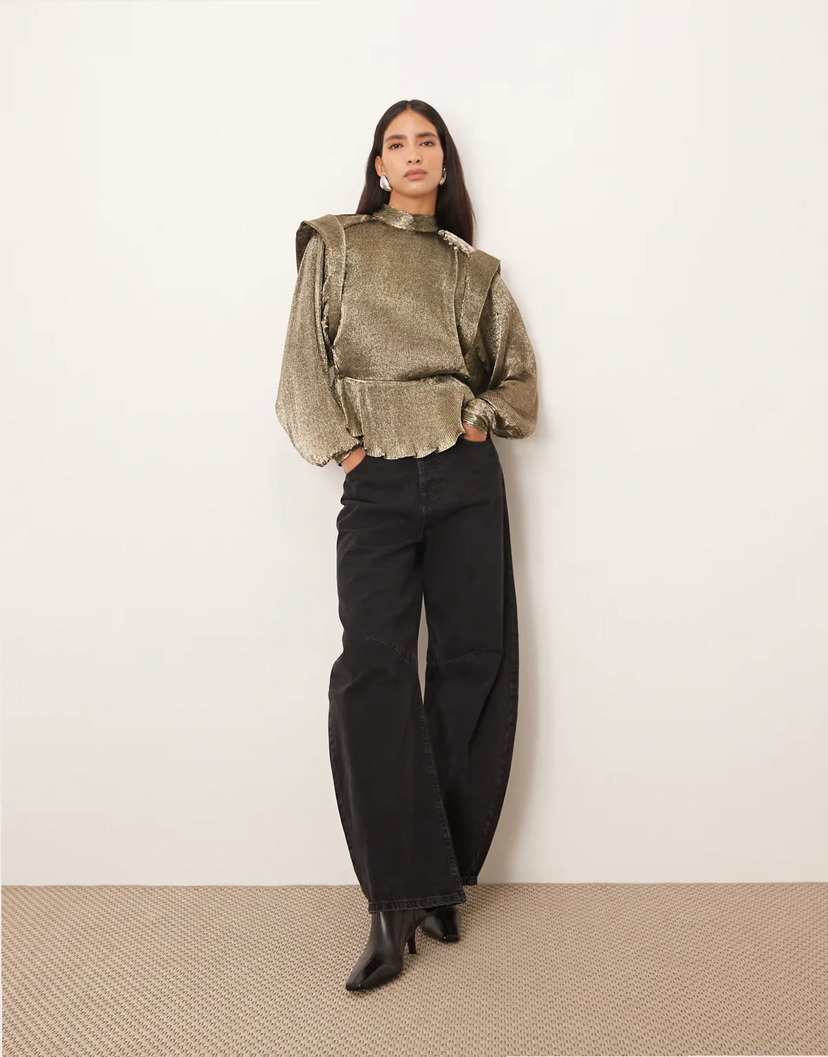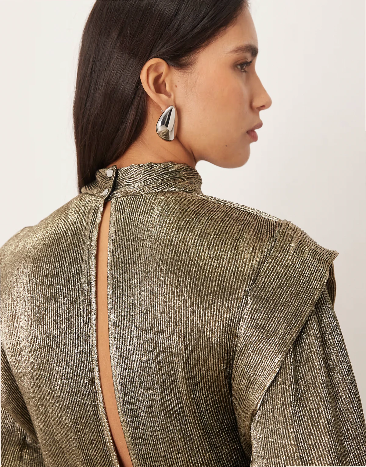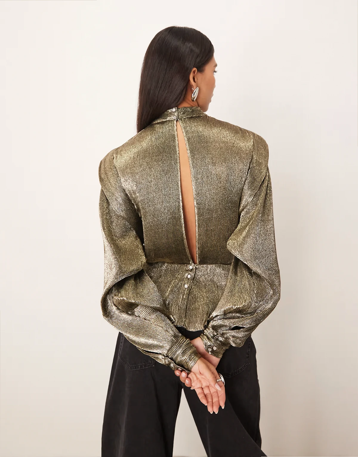 – Bluse in Metallic-Antikgold mit Faltendetails und Schulterpolstern