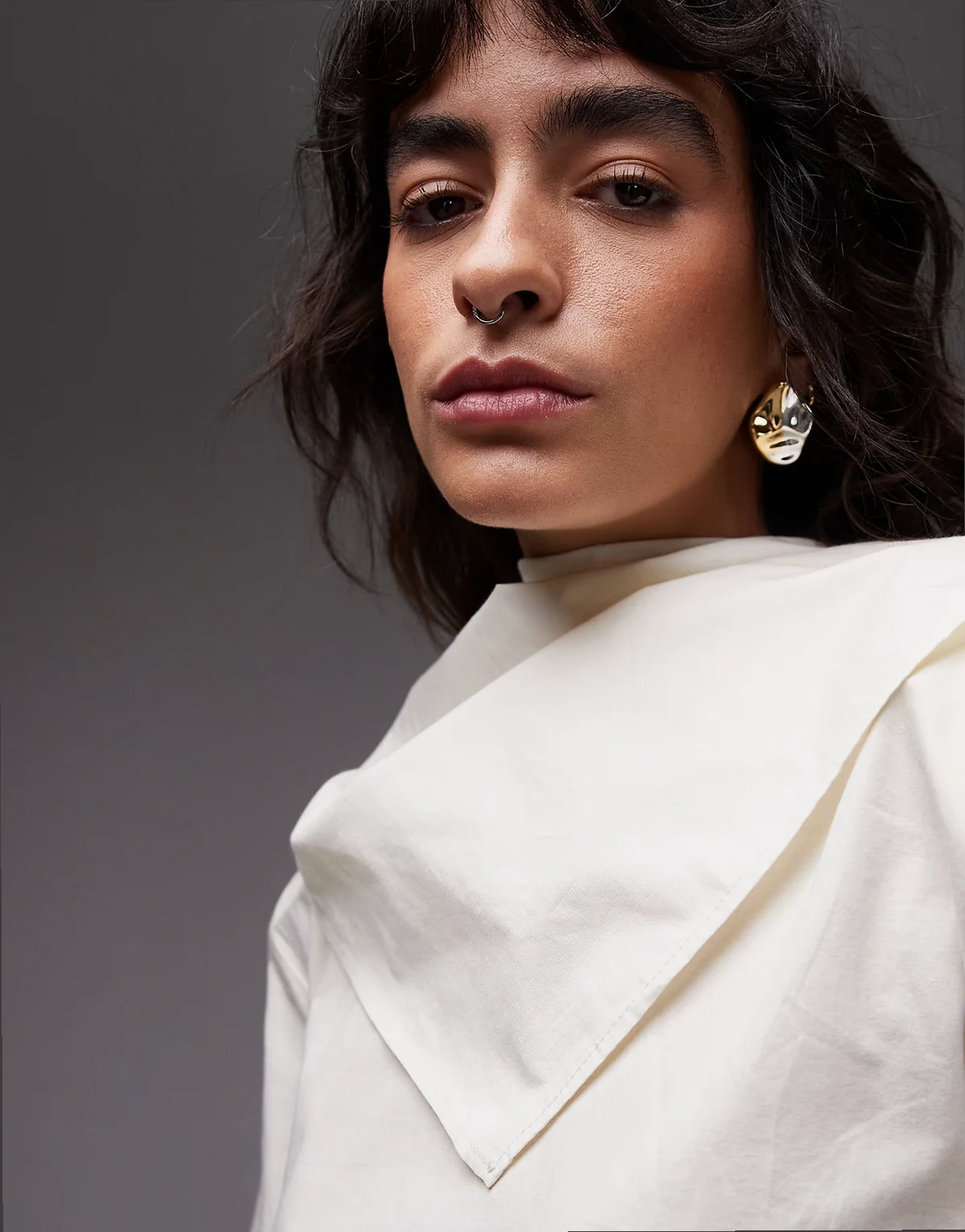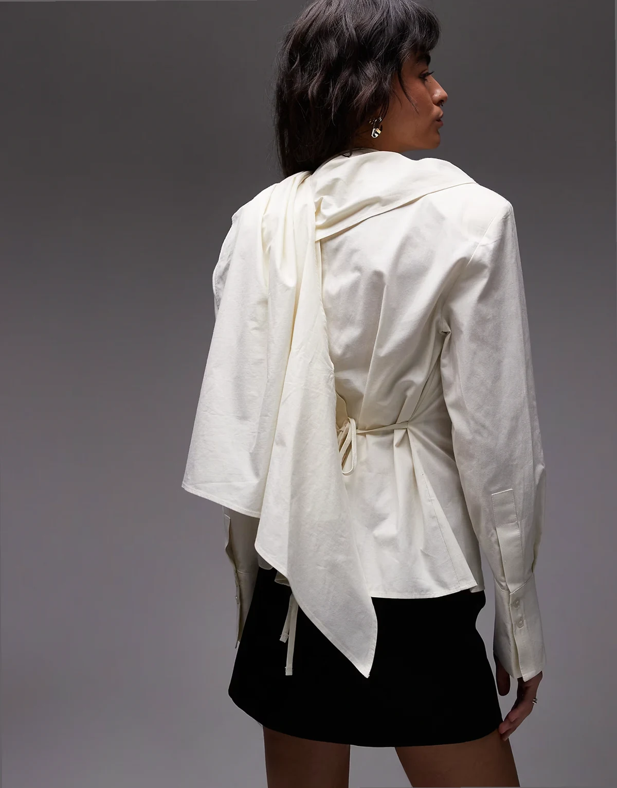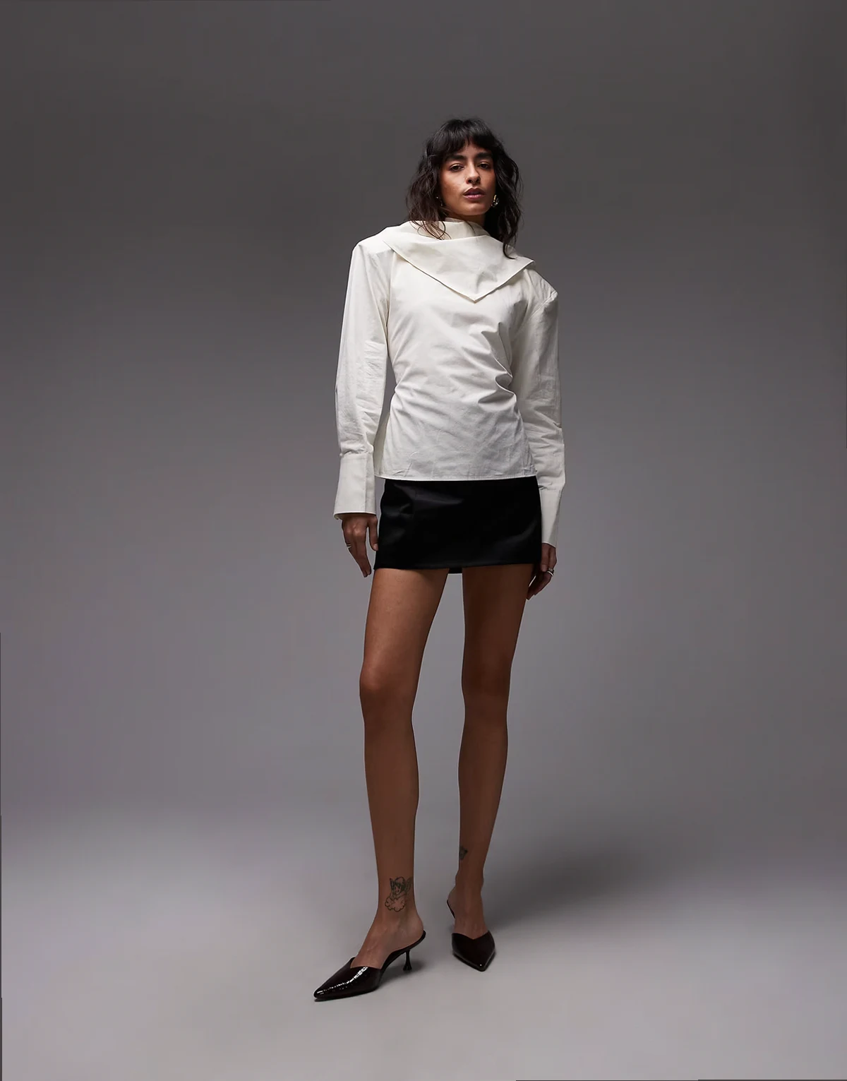5. – Bluse in Austernweiß mit Schulterpolstern und Schalkragen