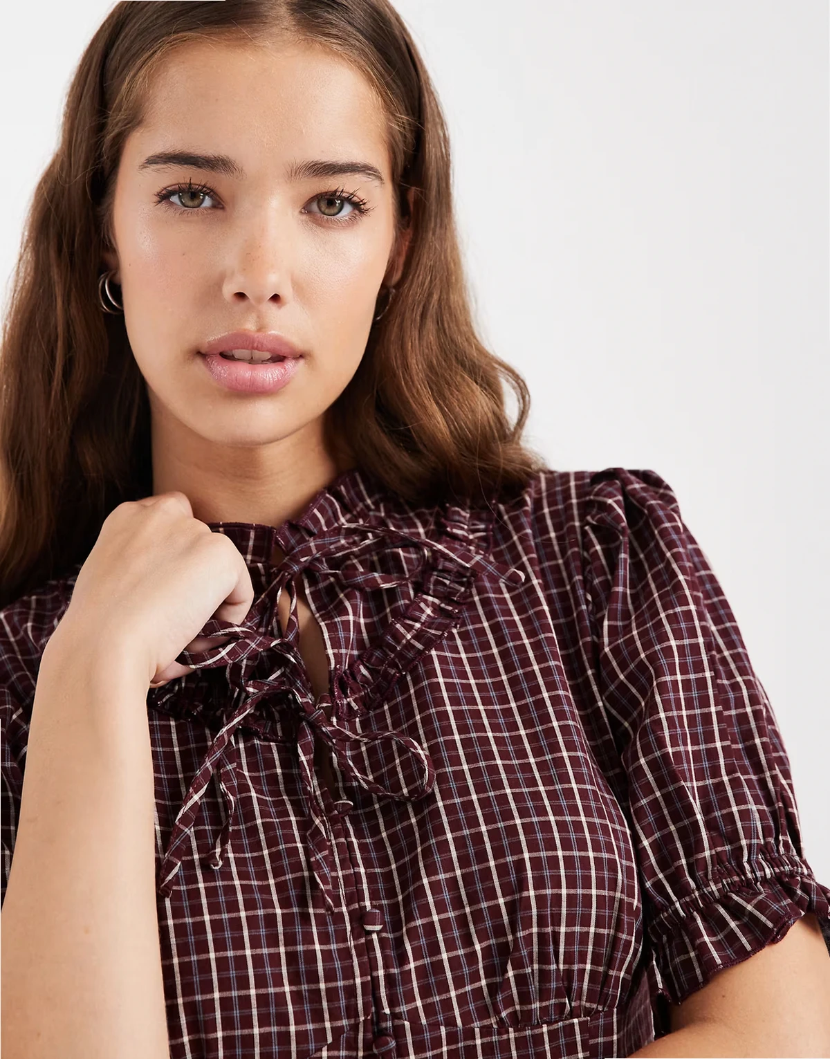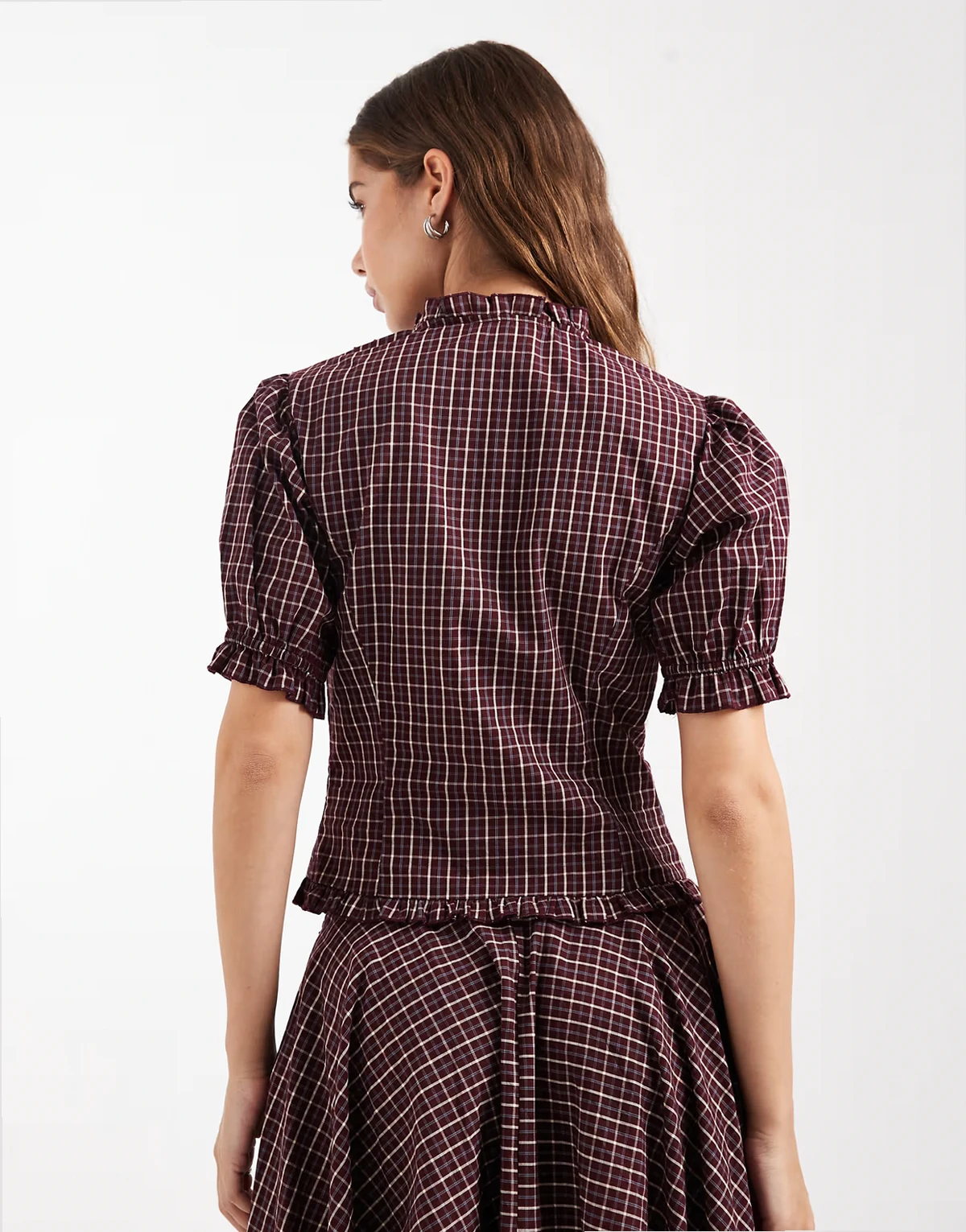 – Bluse in Burgunderrot kariert mit Puffärmeln und Rüschenkragen, Kombiteil