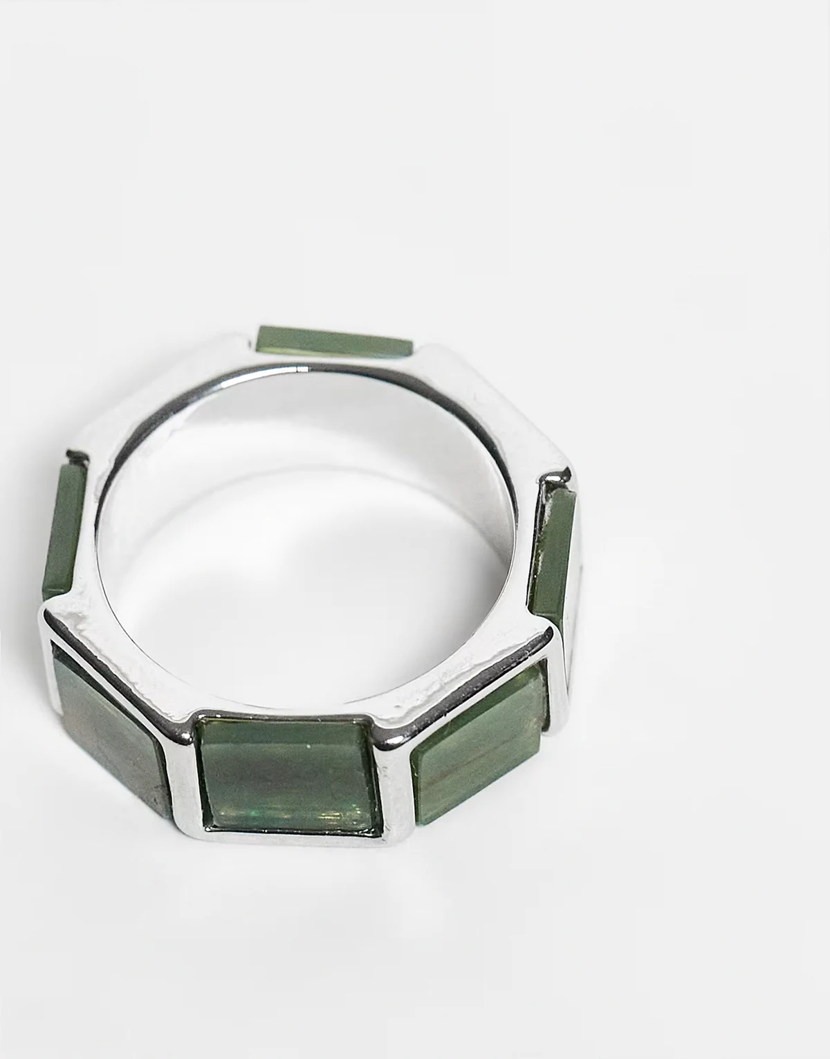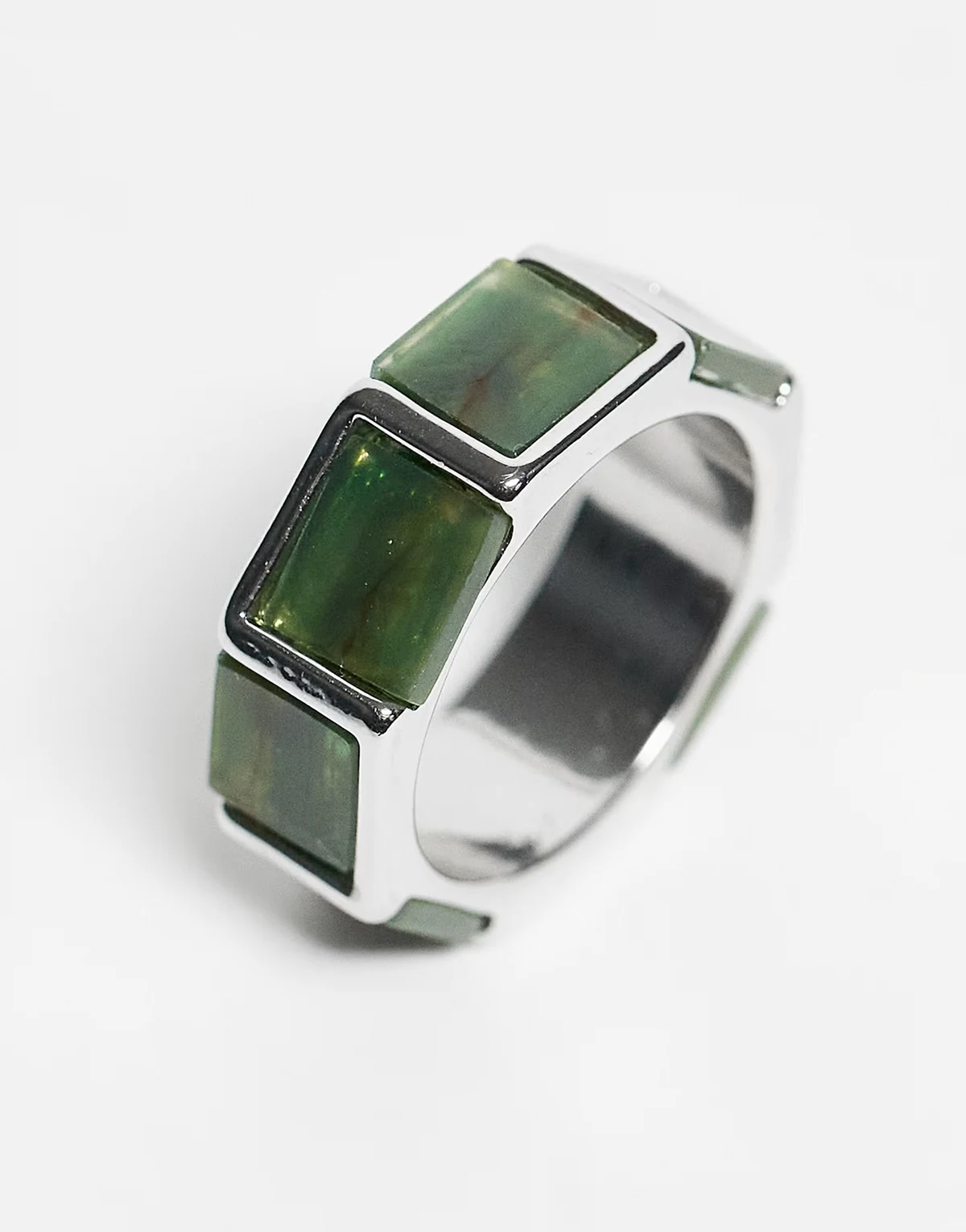 – Silberfarbener, eckiger Ring mit künstlichem Moosachat