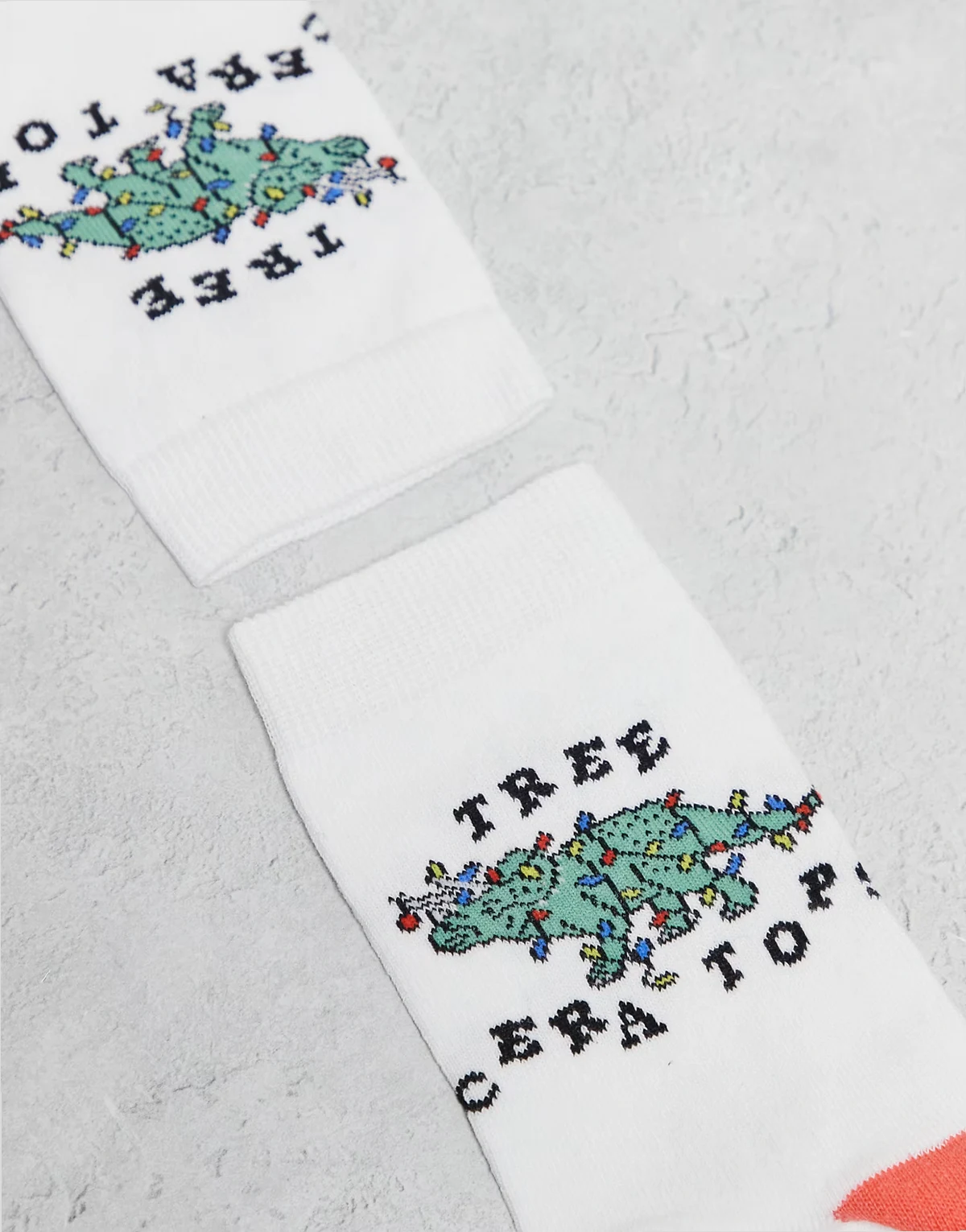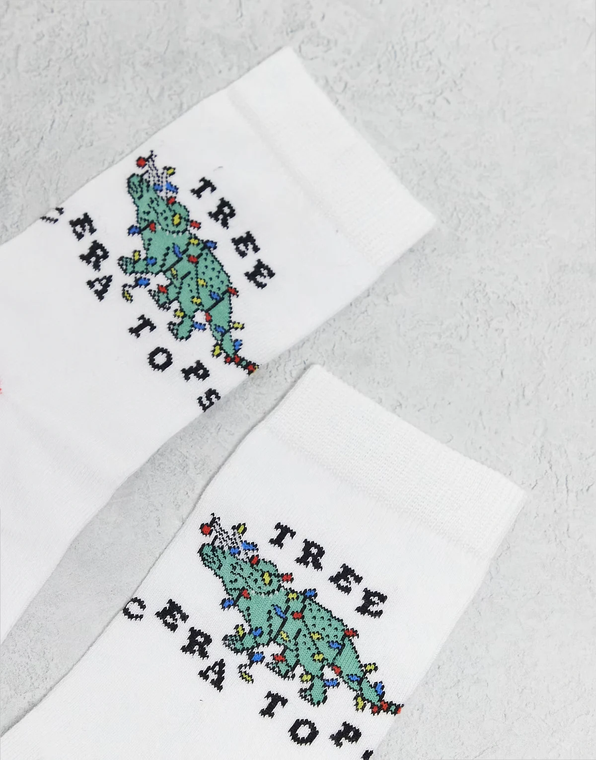 – Socken in Weiß mit weihnachtlichem Dinosaurier-Motiv