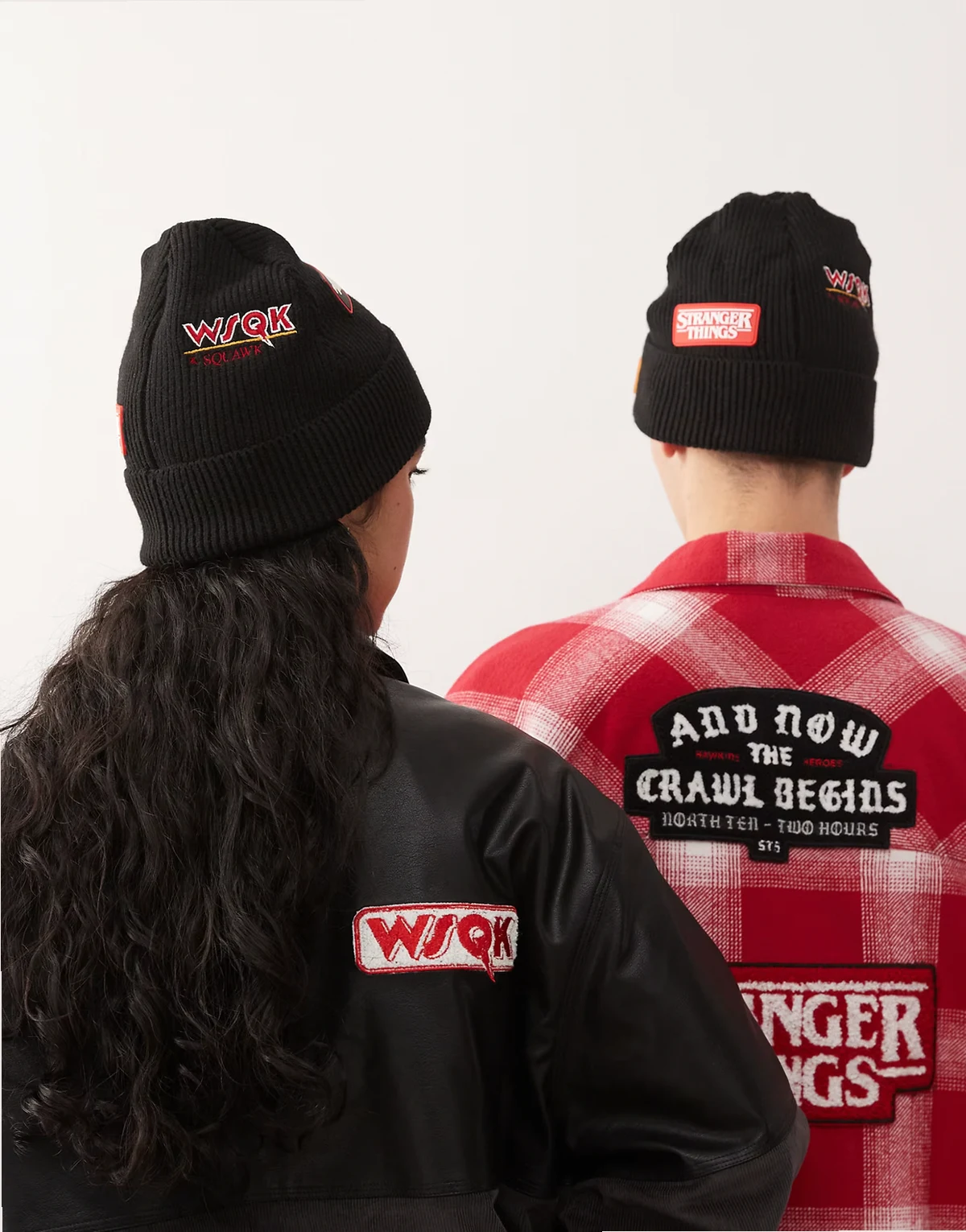 x Stranger Things – Unisex-Strickmütze in Schwarz mit Aufnähern
