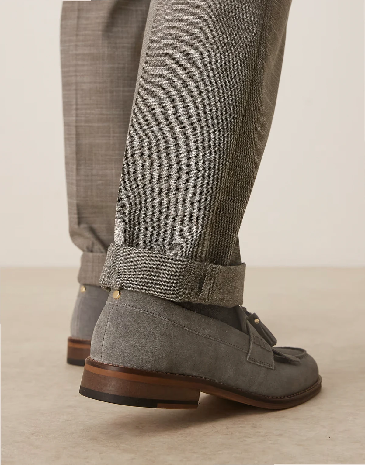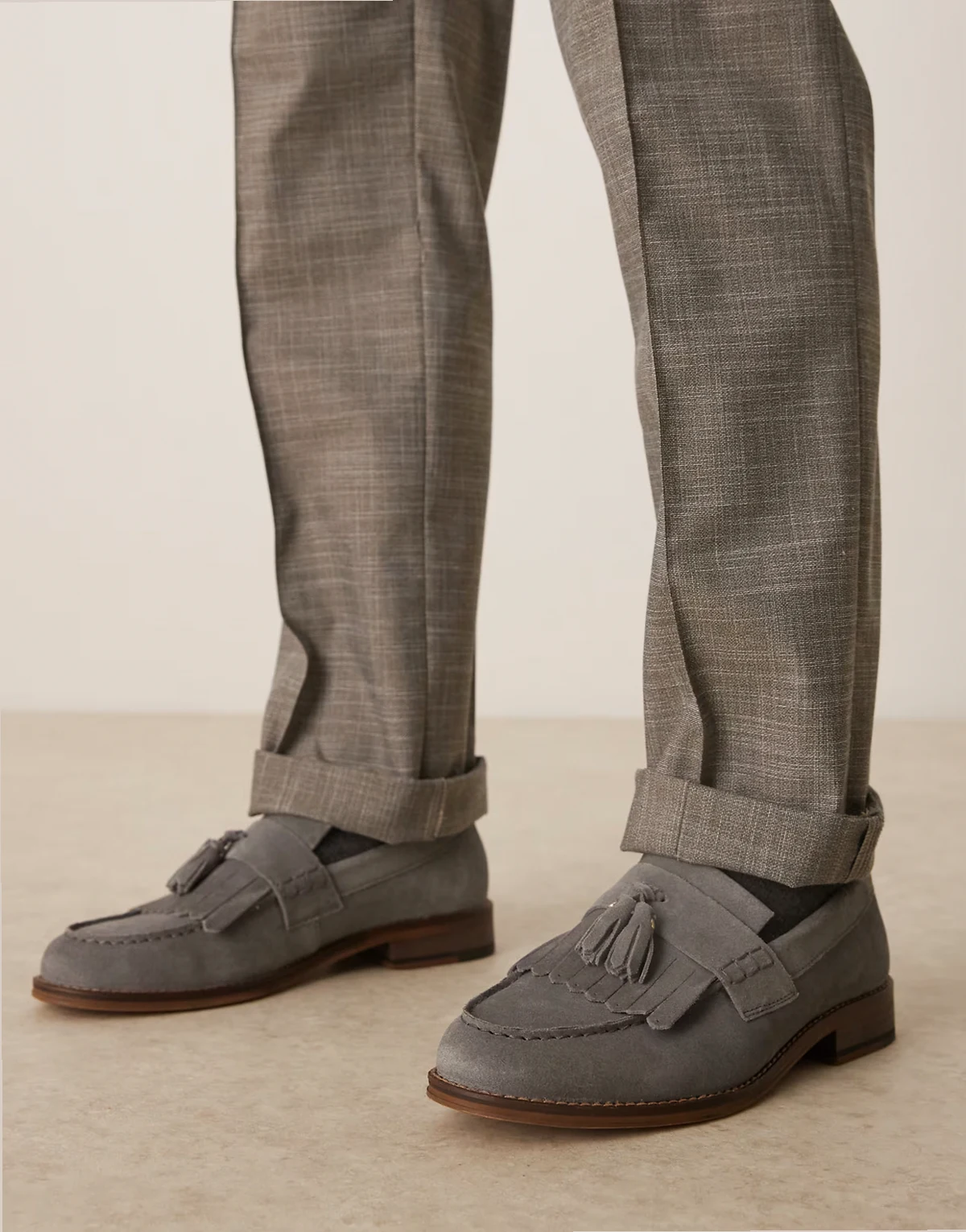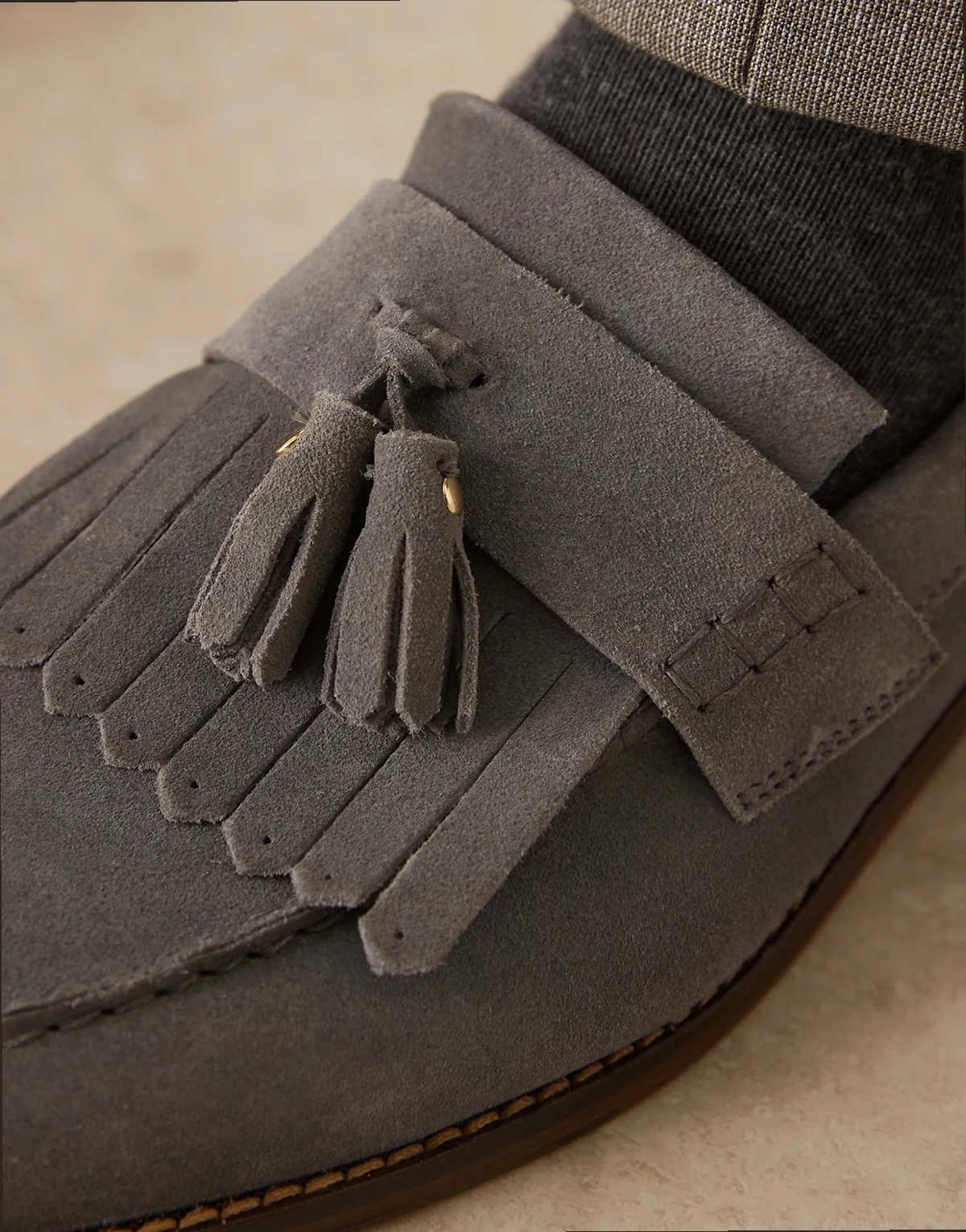 – Halbschuhe aus grauem Wildleder mit Fransen und Bommel