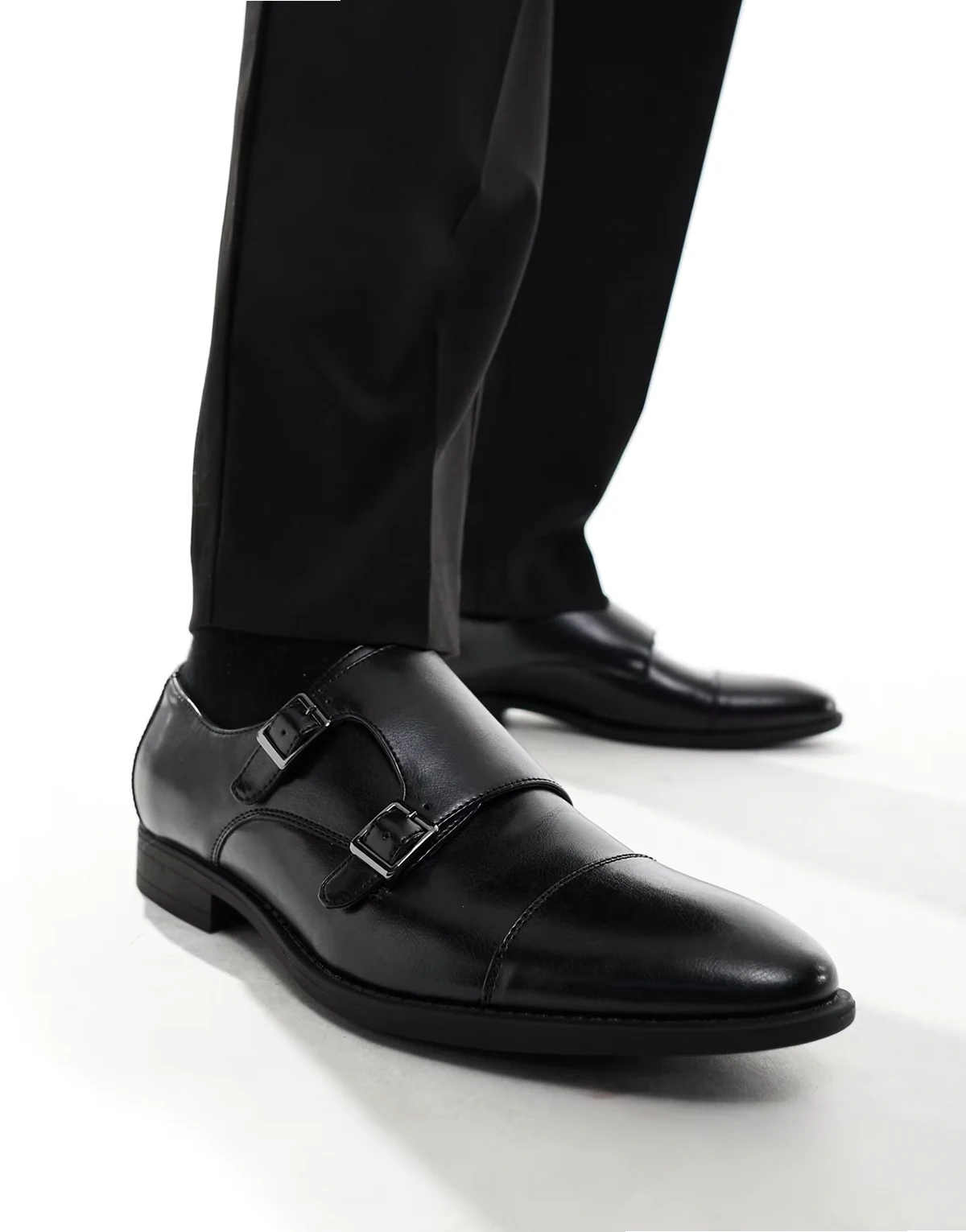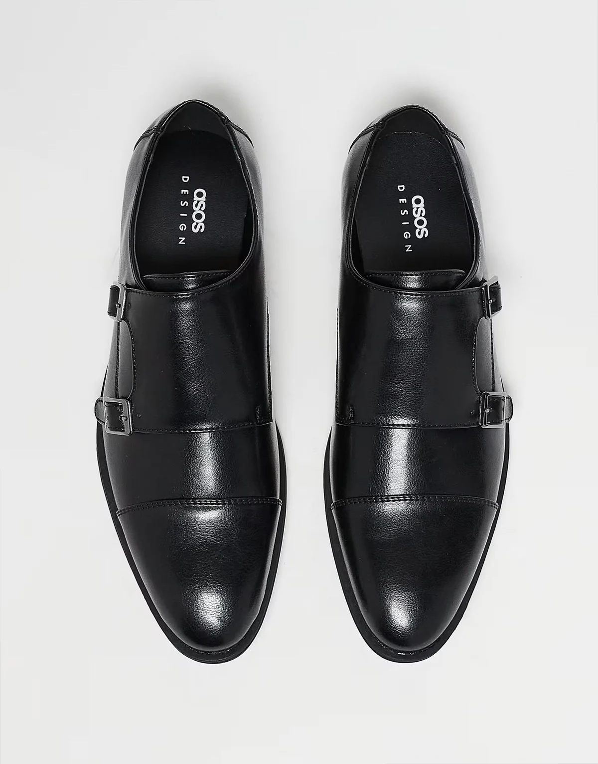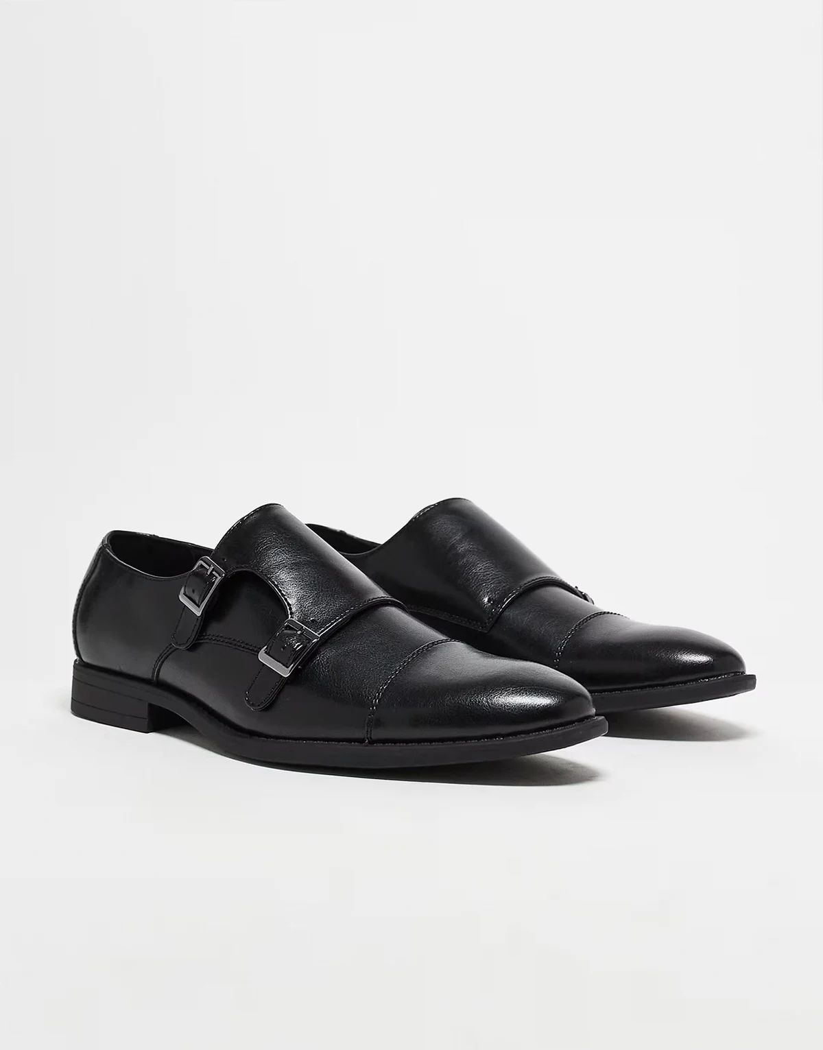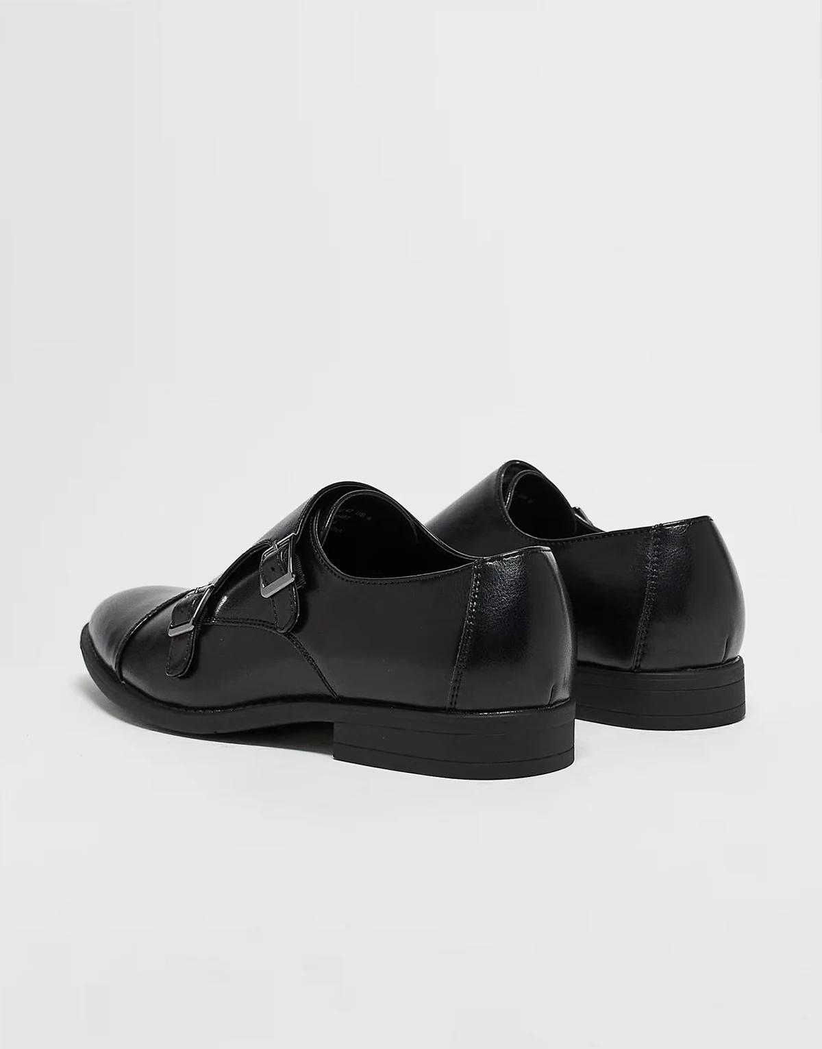 – Monkschuhe aus schwarzem Kunstleder mit Prägung