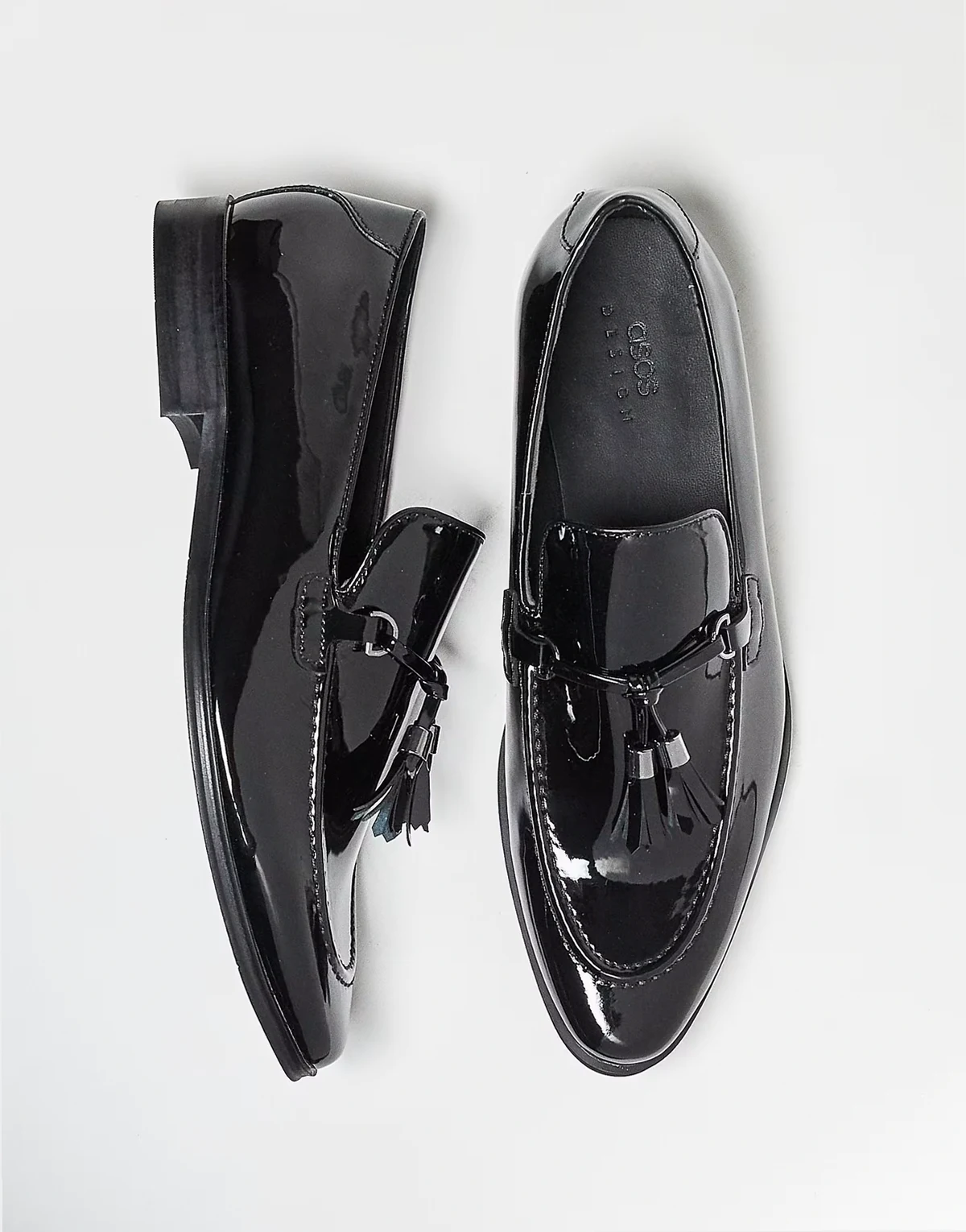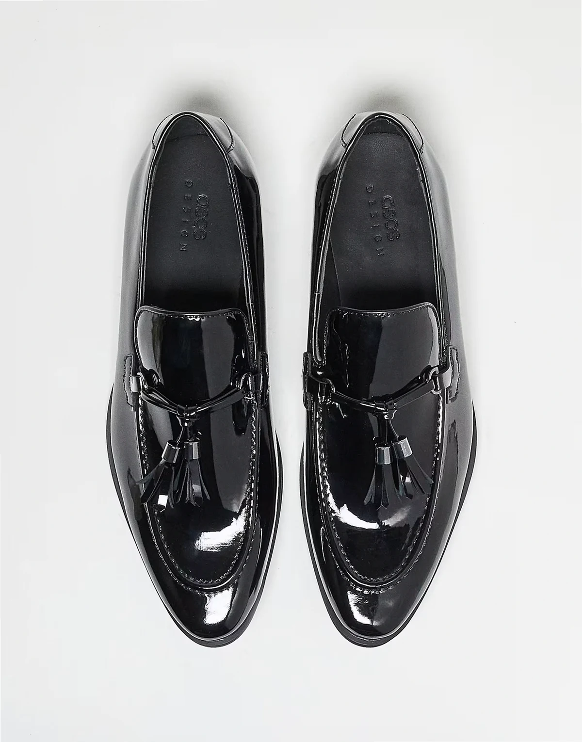 – Halbschuhe in schwarzer Lackoptik mit Bommeln