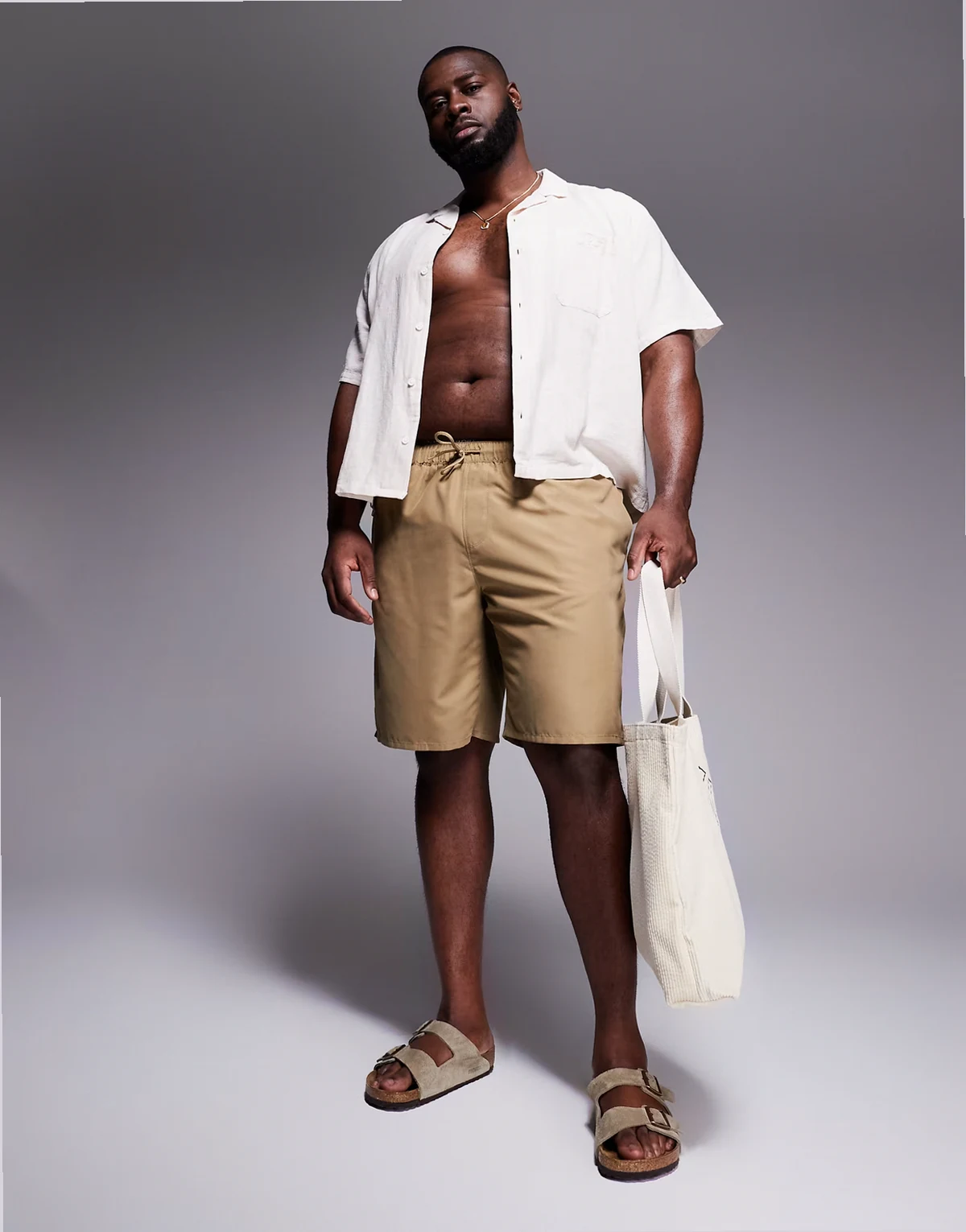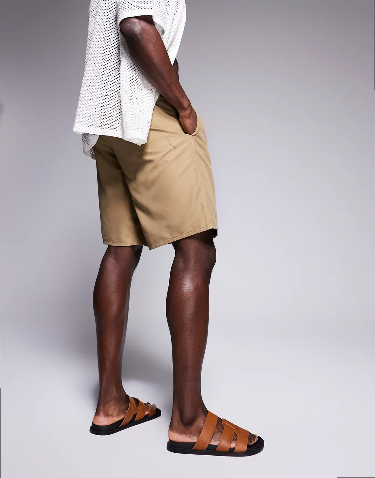 – Lang geschnittene Badeshorts in neutraler Farbe