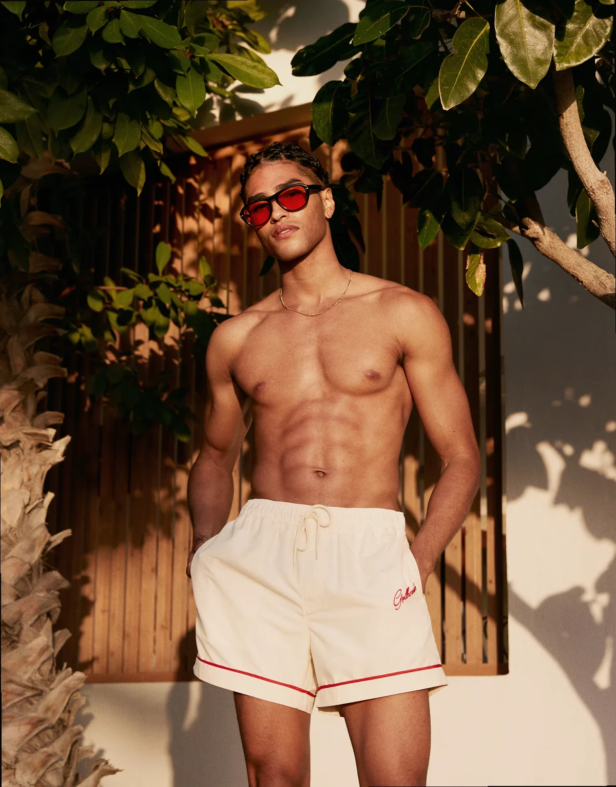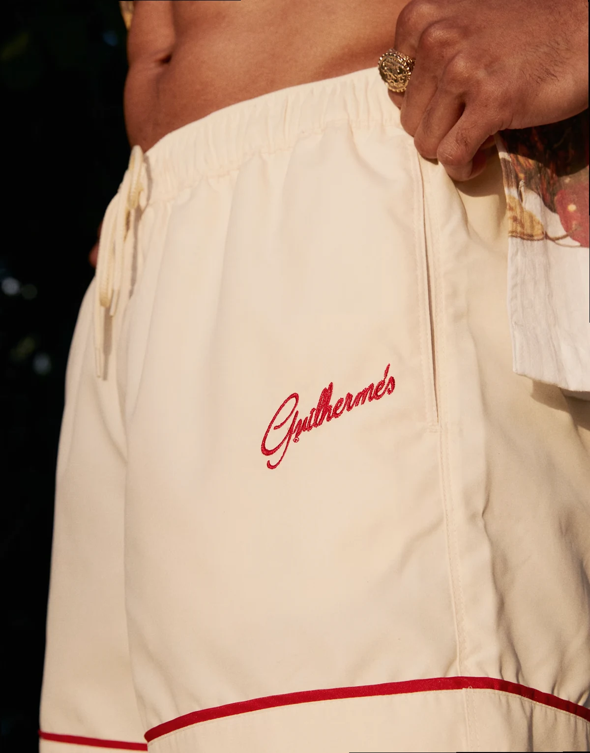 – Kurze Badeshorts in Neutral mit platzierter Stickerei