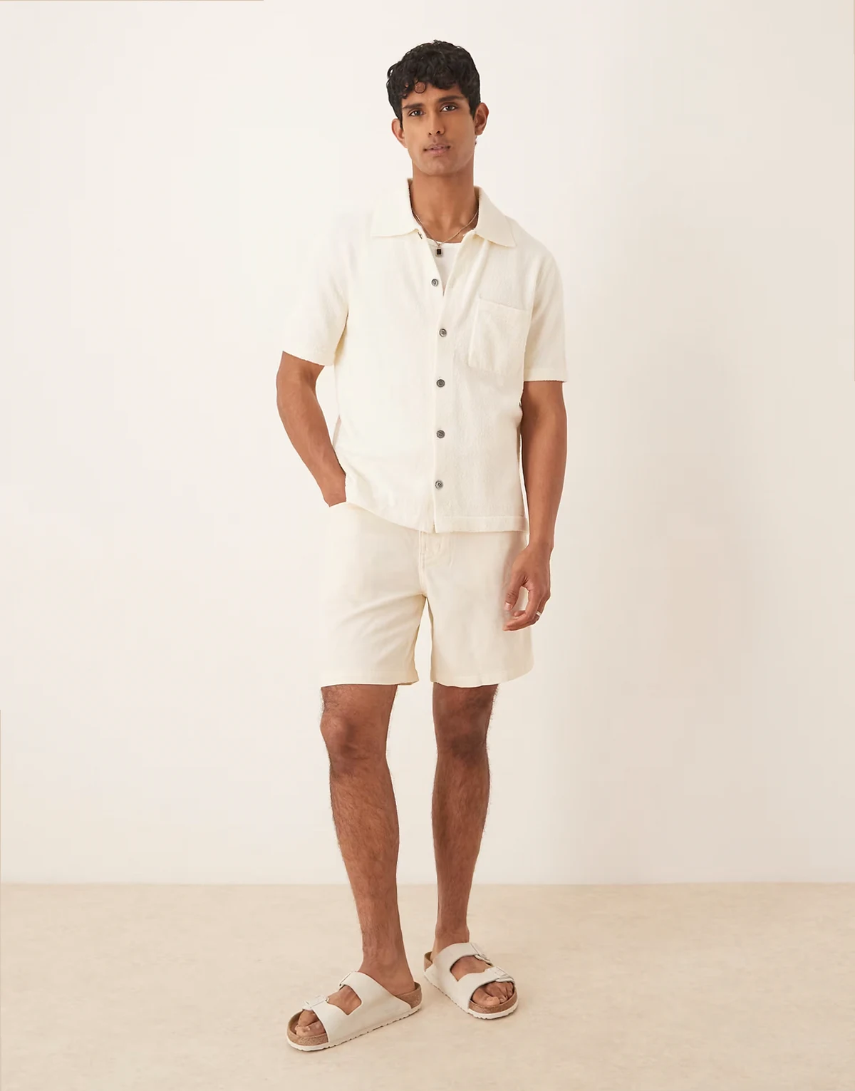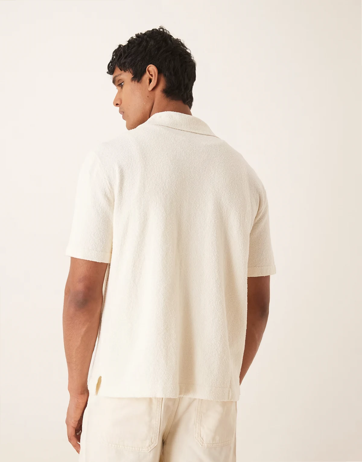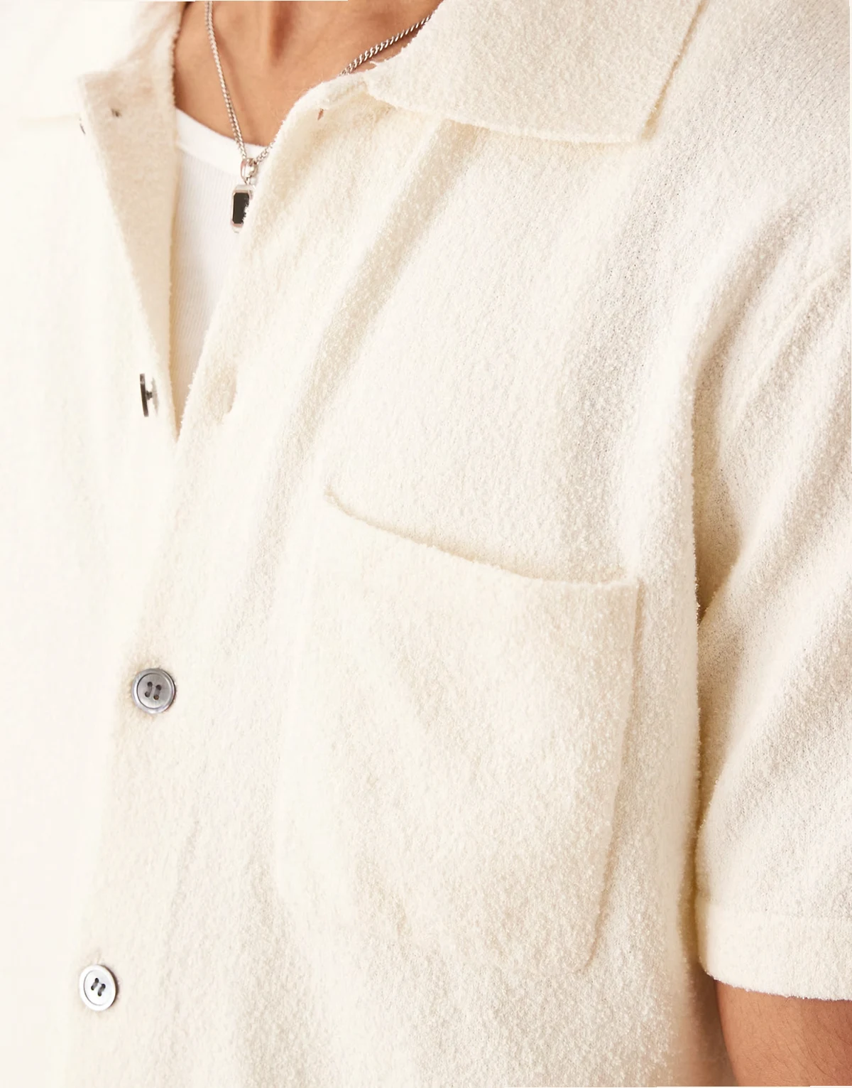 – Kurzärmliges Bouclé-Hemd aus strukturiertem Strick in Wollweiß mit weicher Haptik