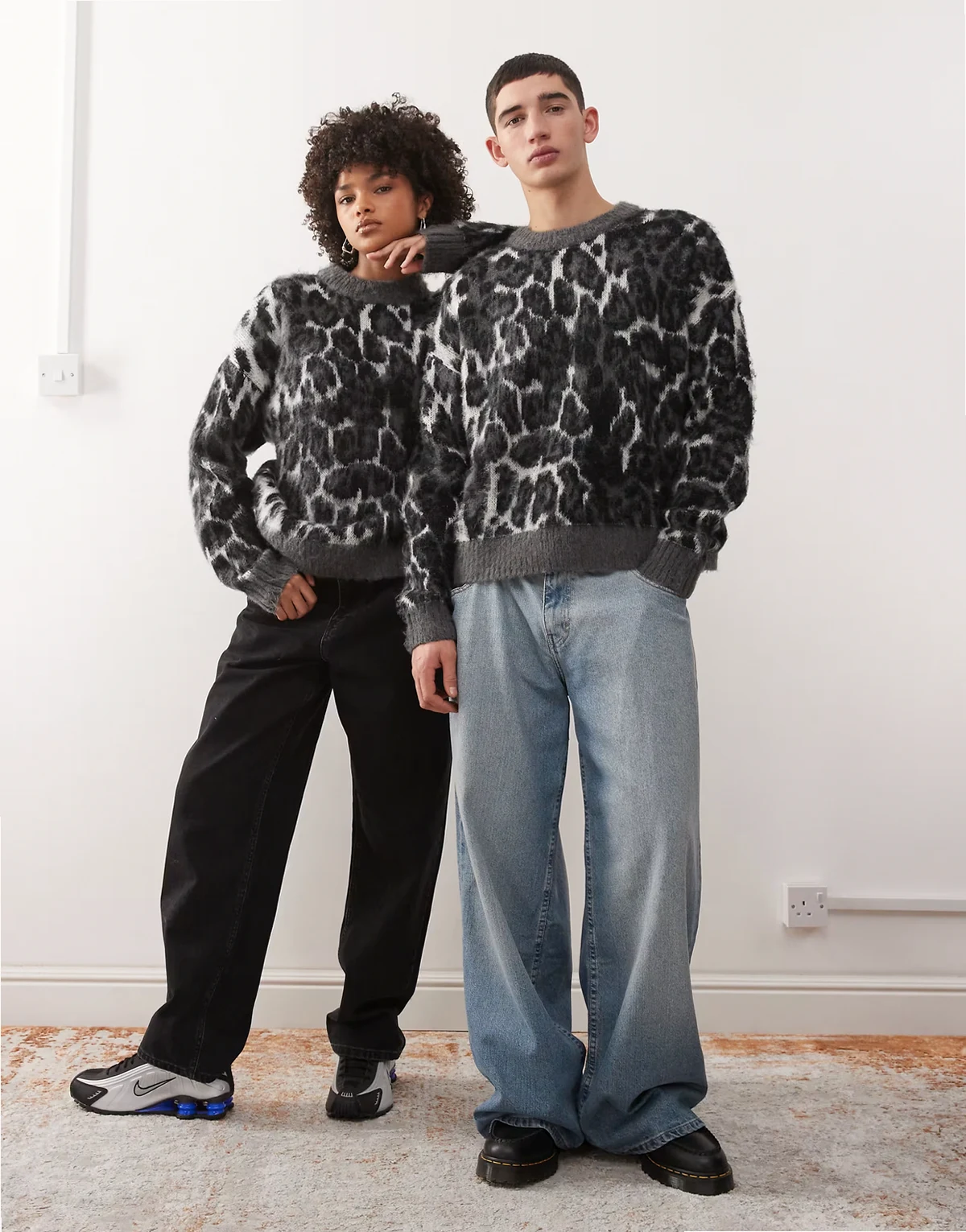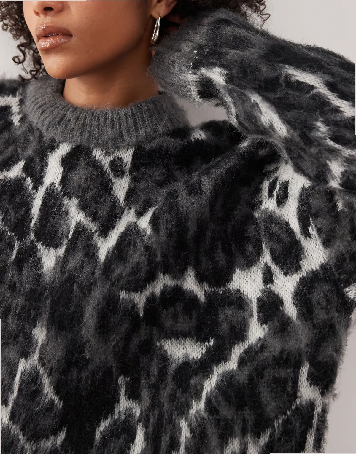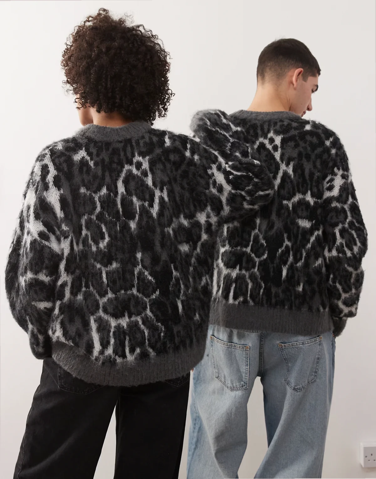 – Kastiger Unisex-Pullover in Grau mit Rundhalsausschnitt und Leopardenmuster