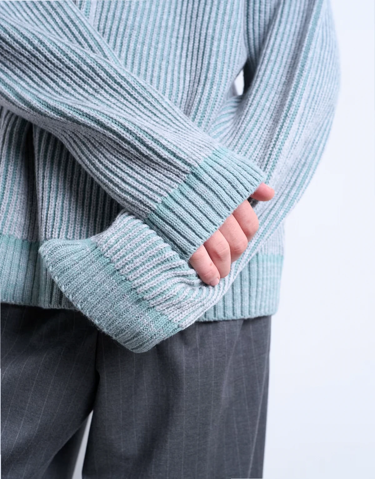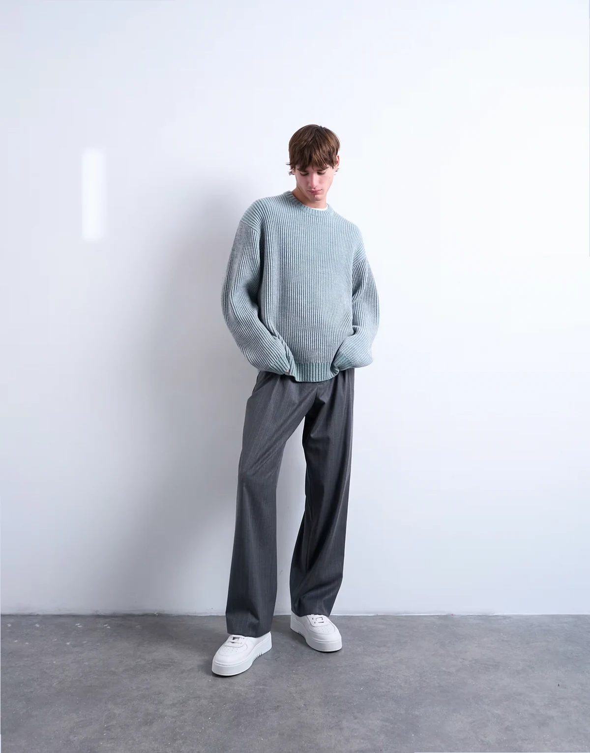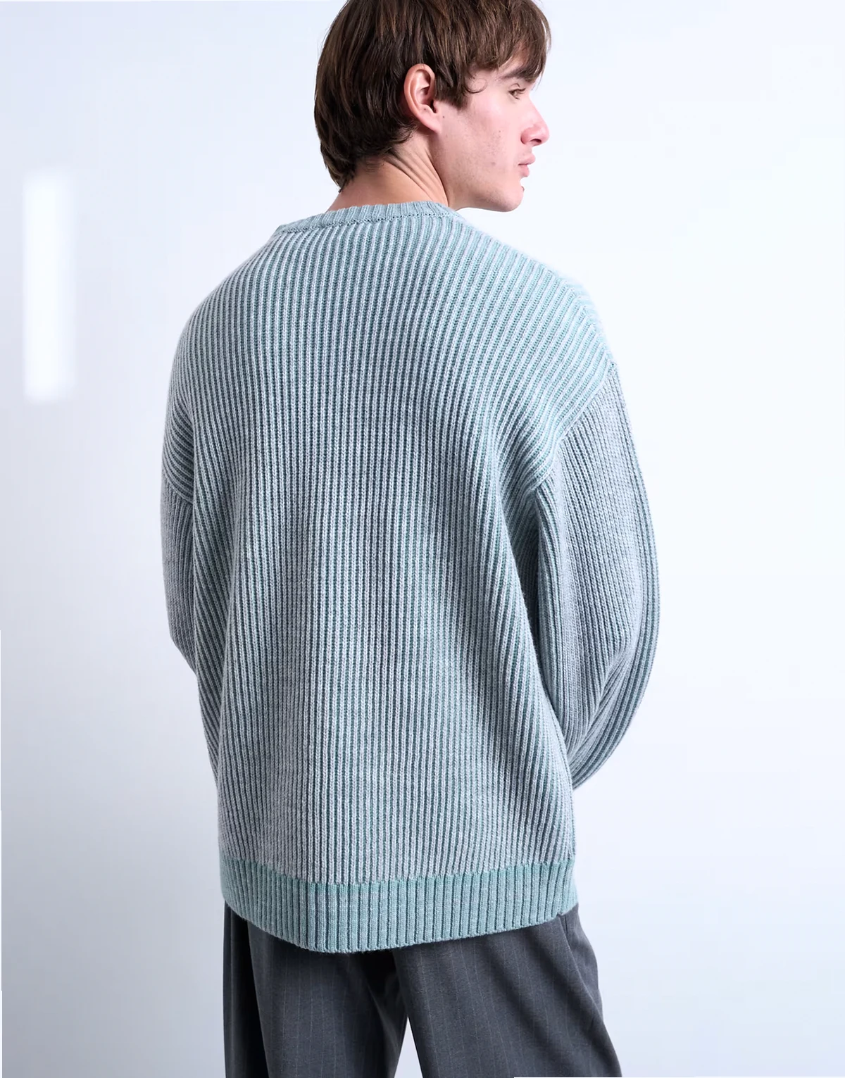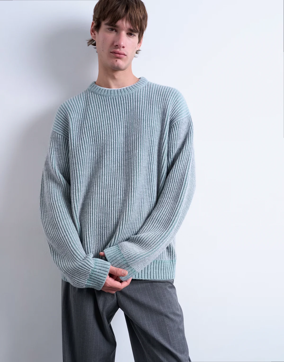Dieser Pullover ist aus grobem Strick im Patentmuster gefertigt. Dieses Modell in einem verwaschenen Blauton verfügt über einen Rundhalsausschnitt, überschnittene Schultern und eine lockere Passform.