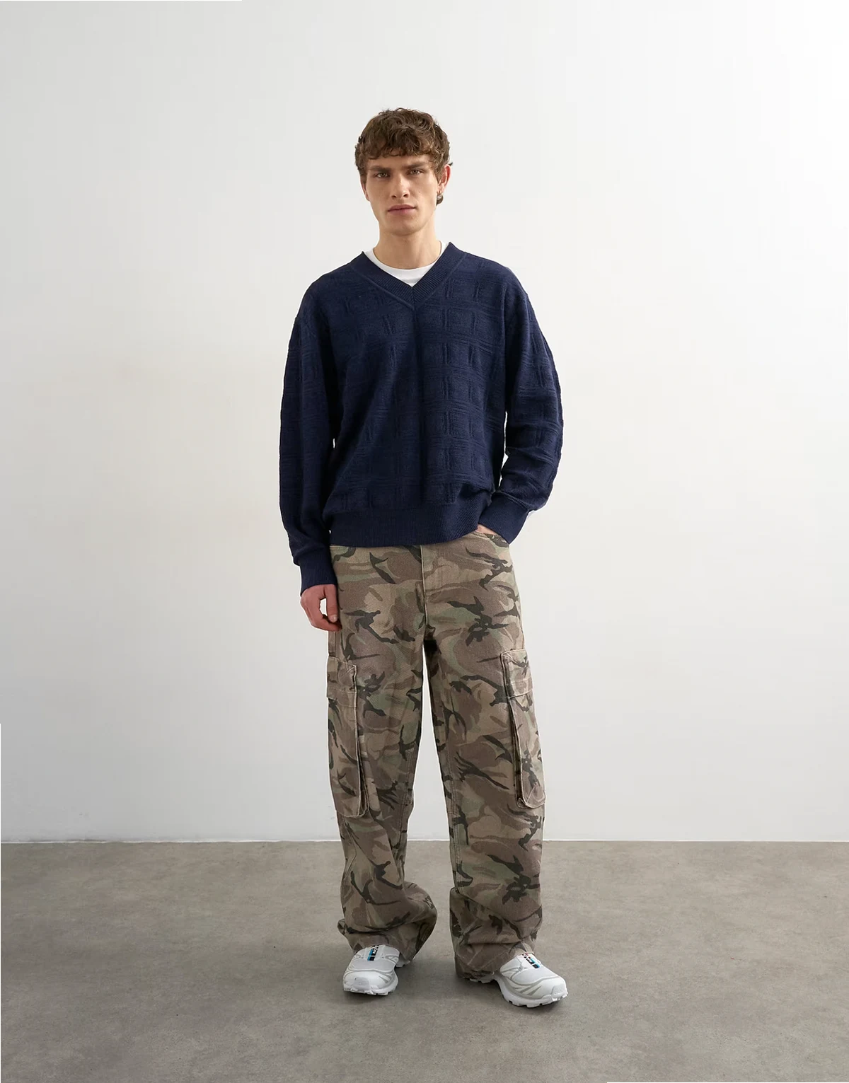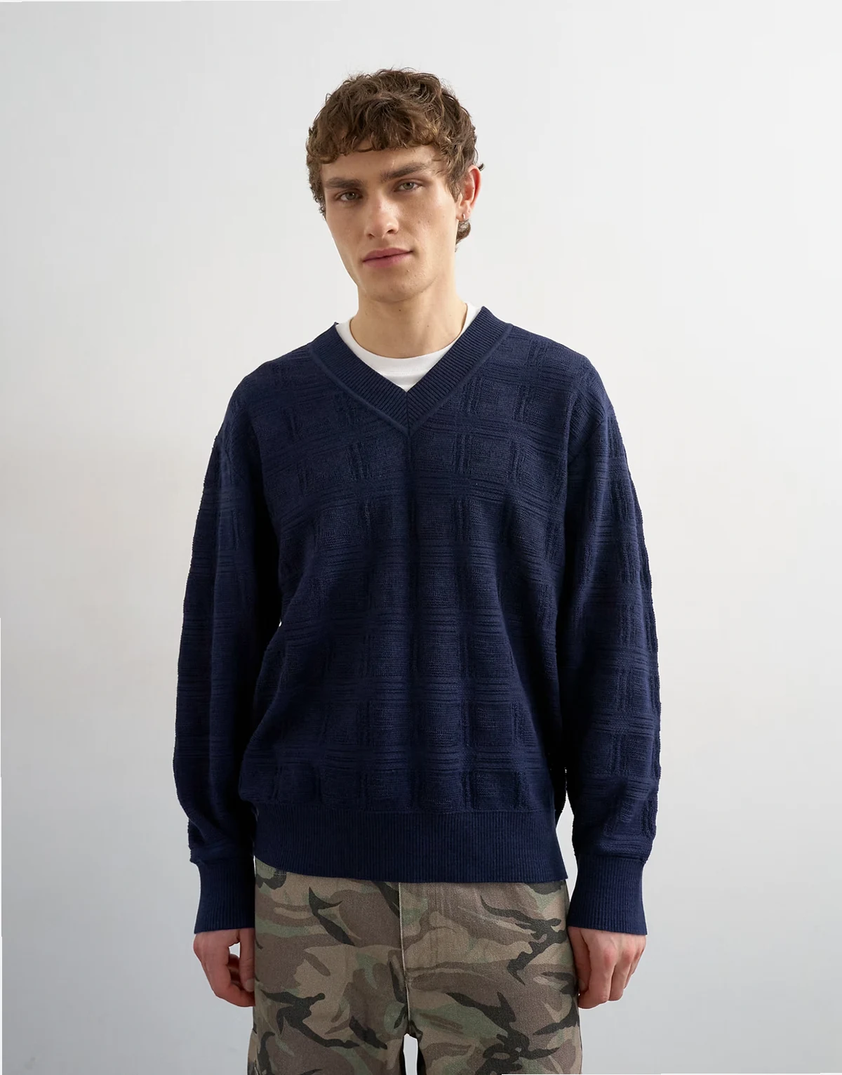 Dieser Pullover ist aus einem strukturierten Strick in Marineblau gefertigt. Das Modell im Relaxed Fit verfügt über einen V-Ausschnitt, lange Ärmel und gerippte Abschlüsse.