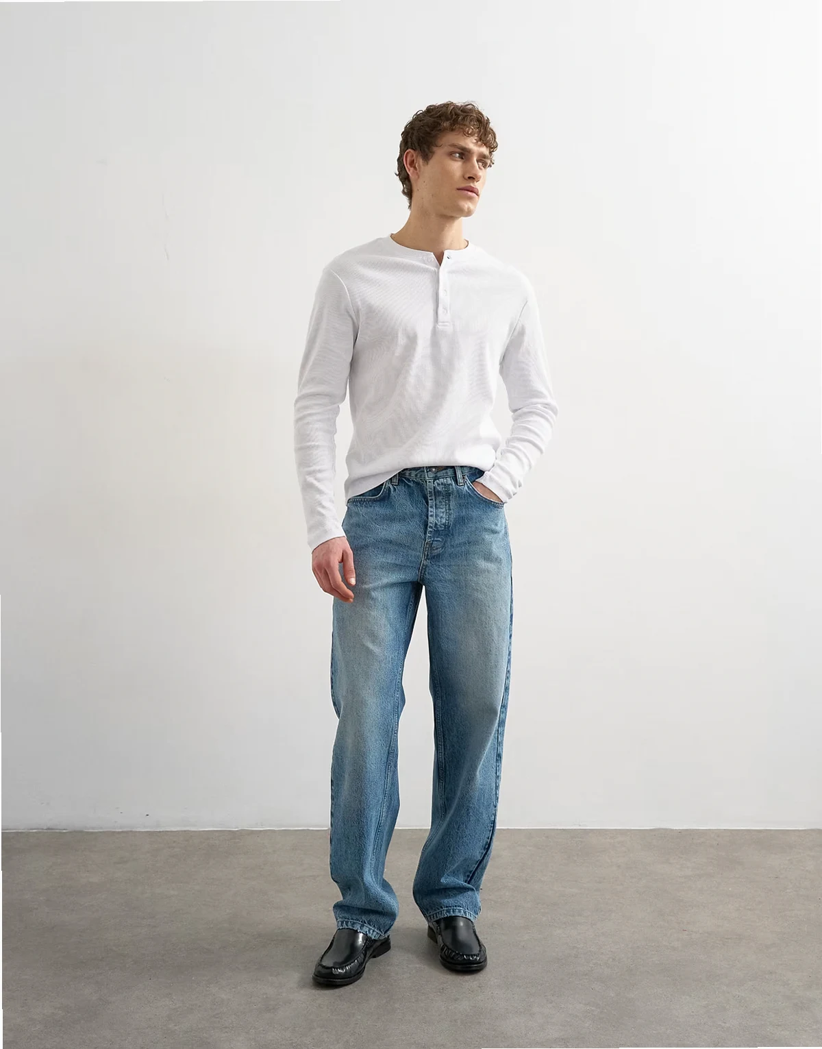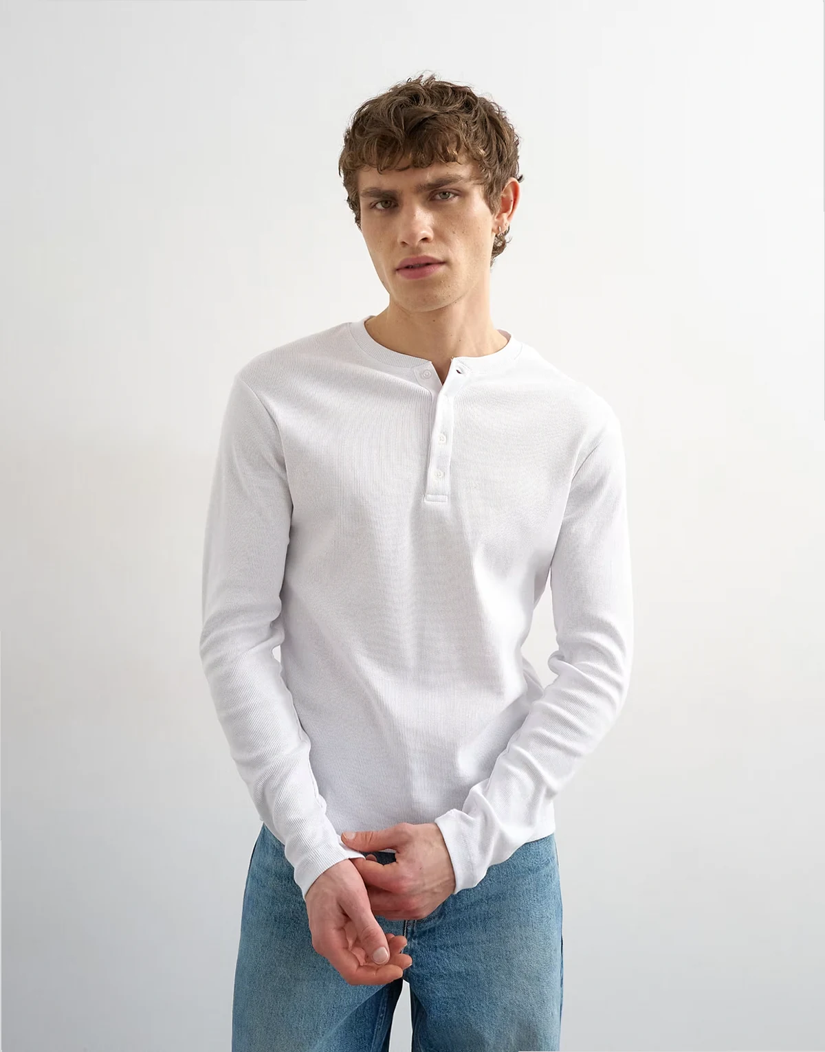 Dieses Oberteil ist aus geripptem Jersey in schlichtem Design gefertigt. Das Modell hat einen Henley-Ausschnitt, lange Ärmel und eine reguläre Passform.