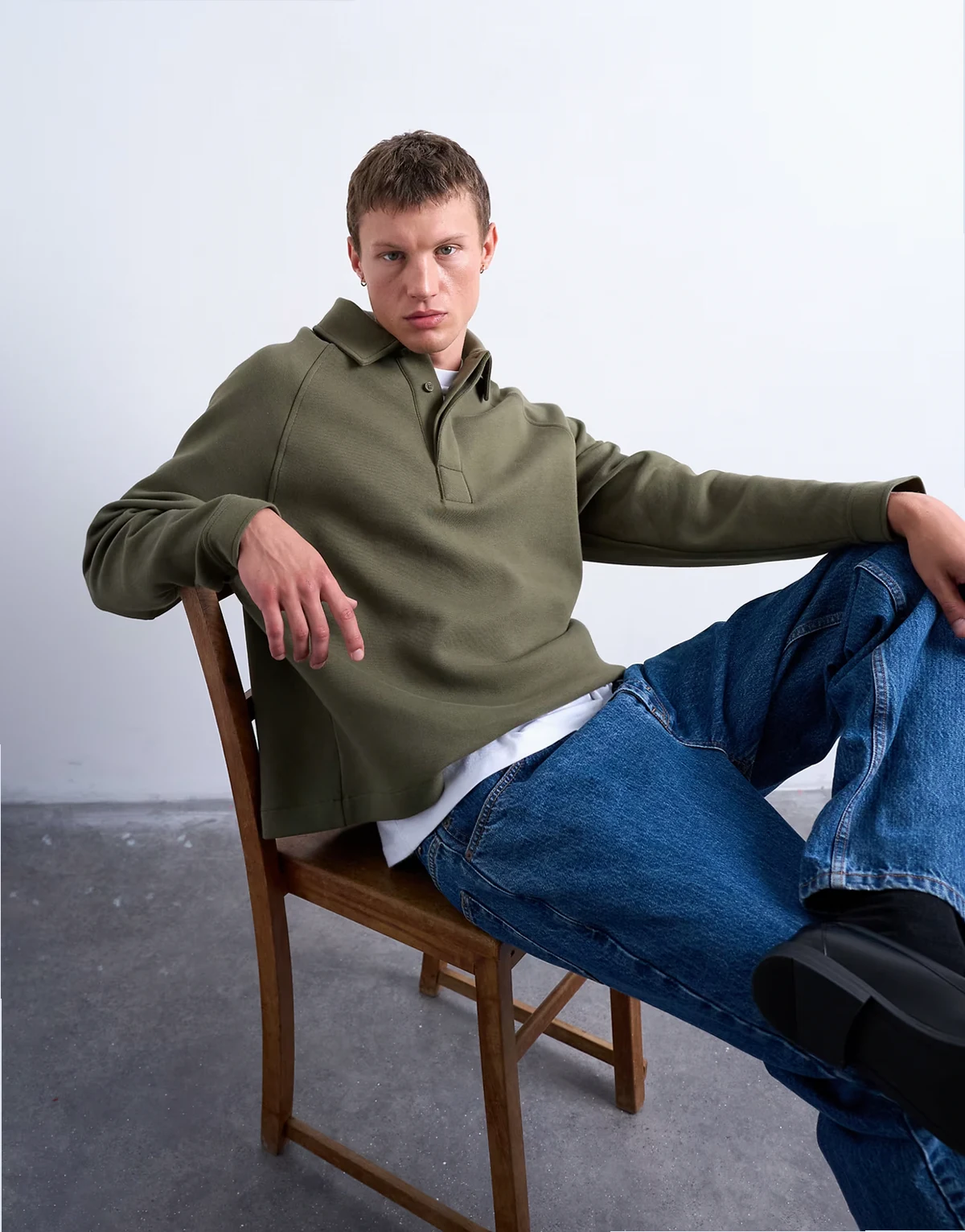 Dieses khakifarbene Sweatshirt hat einen Polokragen, lange Ärmel und eine kastige Passform. Es ist aus weichem Sweatstoff mit einem Hauch von Stretch gefertigt.