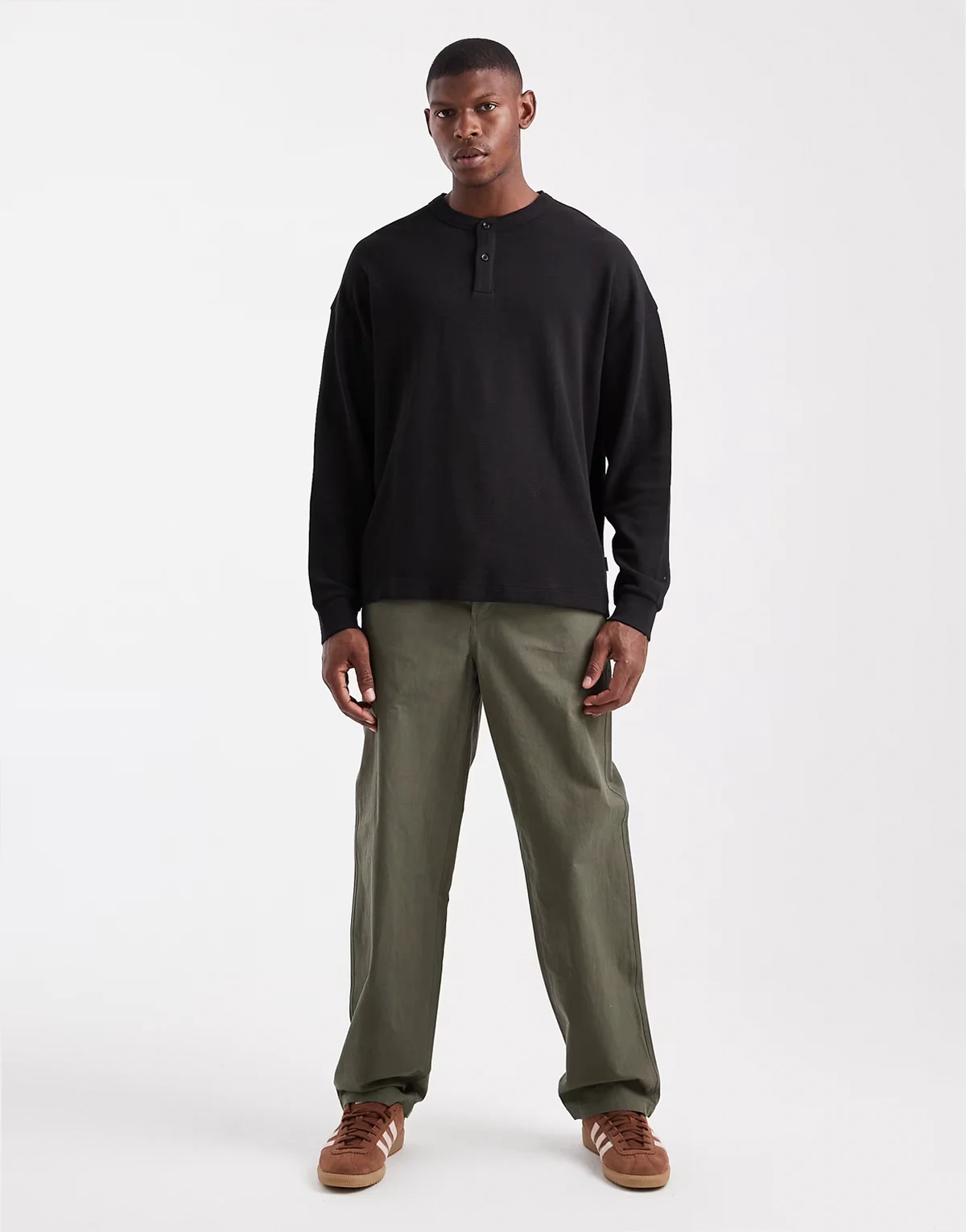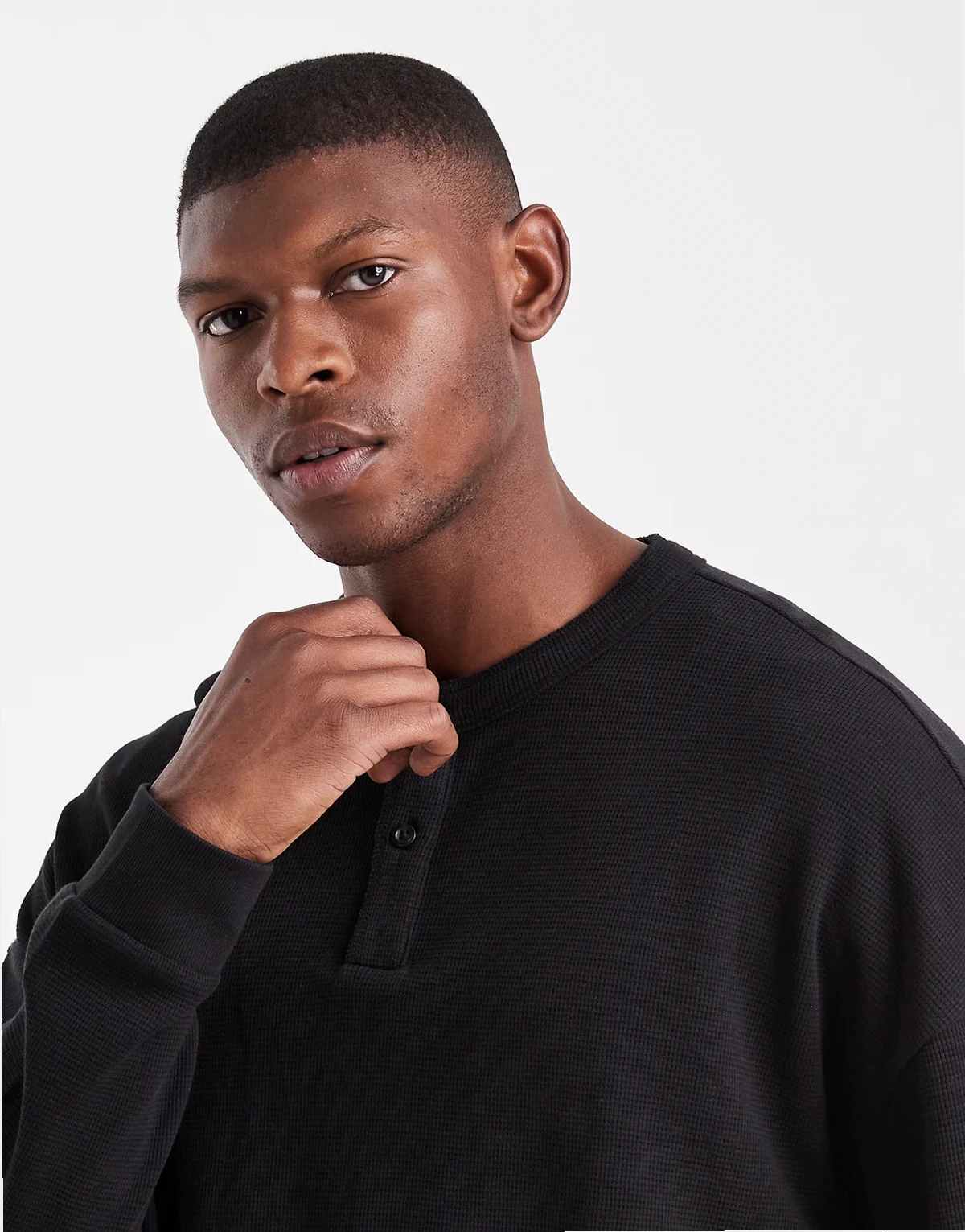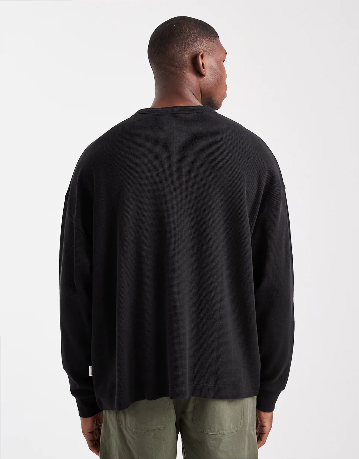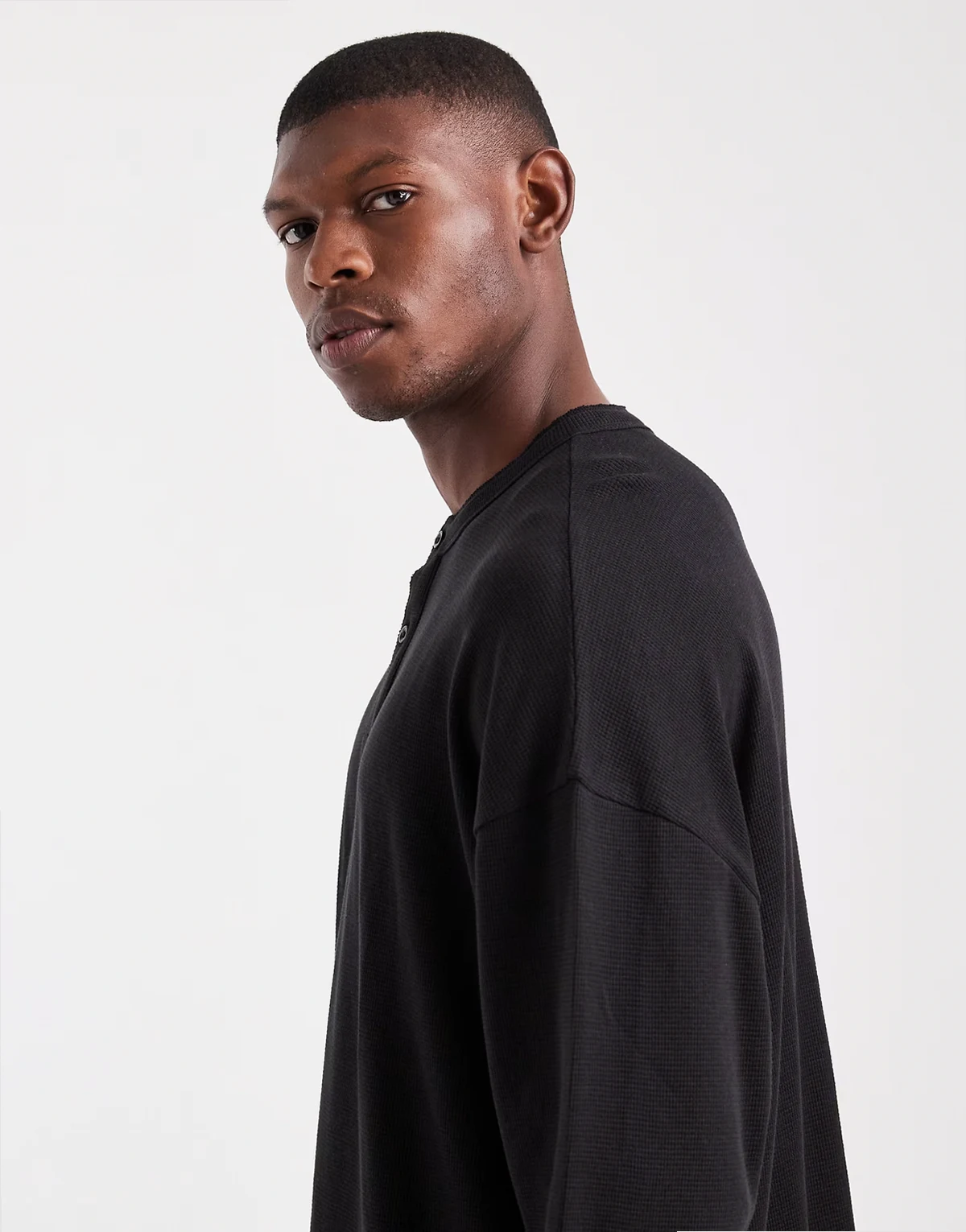 – Langärmliges Oversize-Shirt in Schwarz mit Henley-Ausschnitt und Waffelstruktur