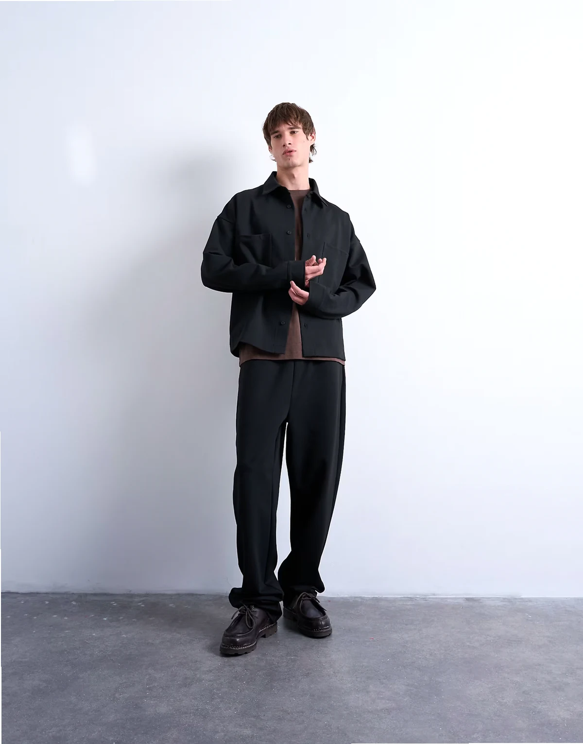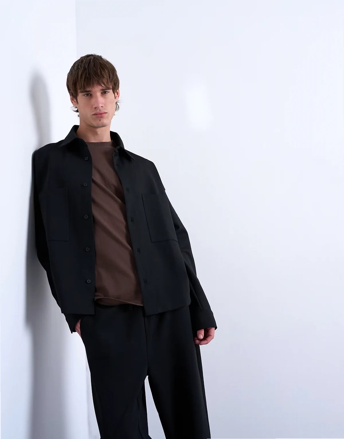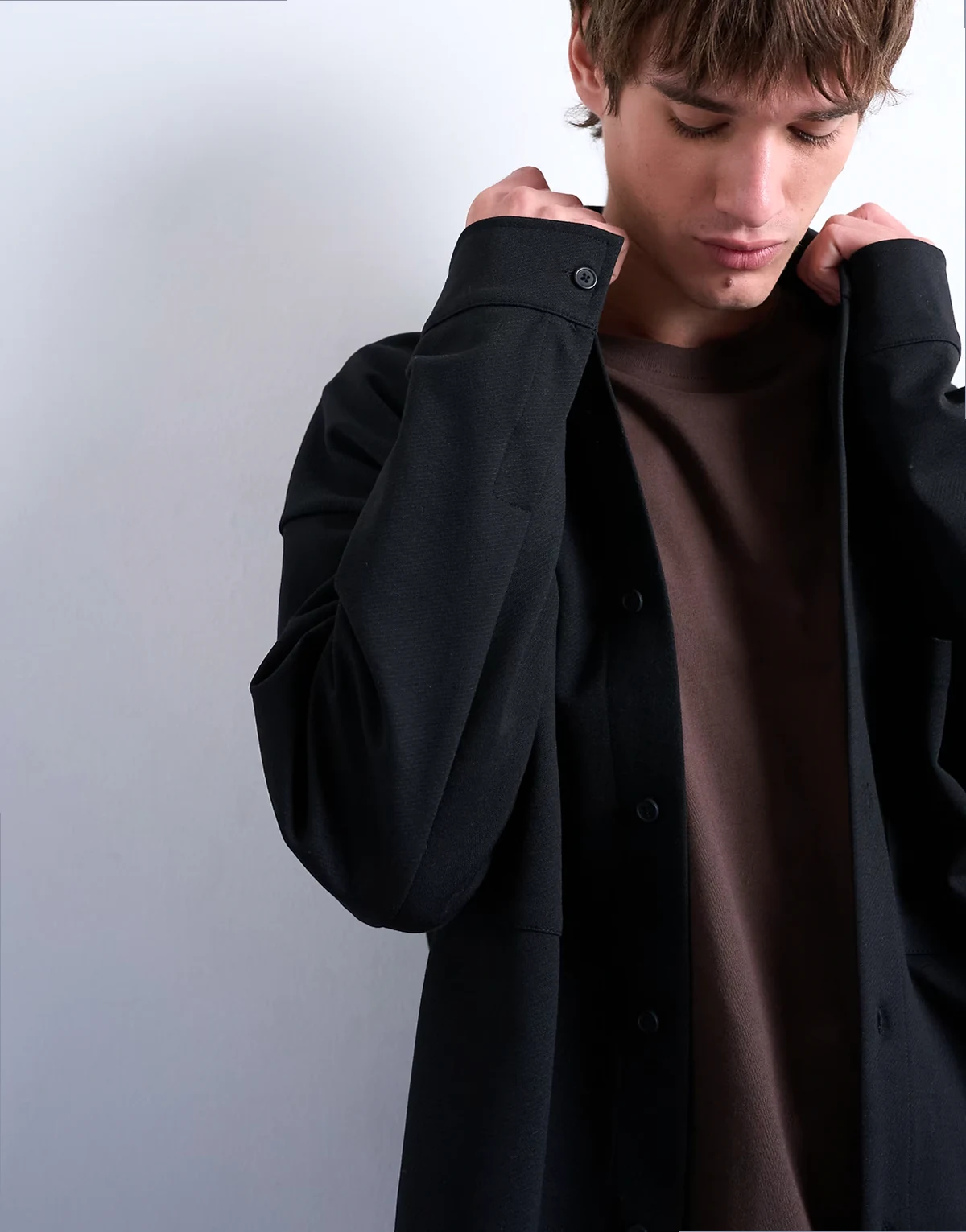 Diese Jacke ist aus Jersey in einem vielseitigen schwarzen Farbton gefertigt. Das Modell ist mit einem gespreizten Kragen, einer Knopfleiste und Doppeltaschen ausgestattet. Der Oversized Fit sorgt für einen legeren Look.