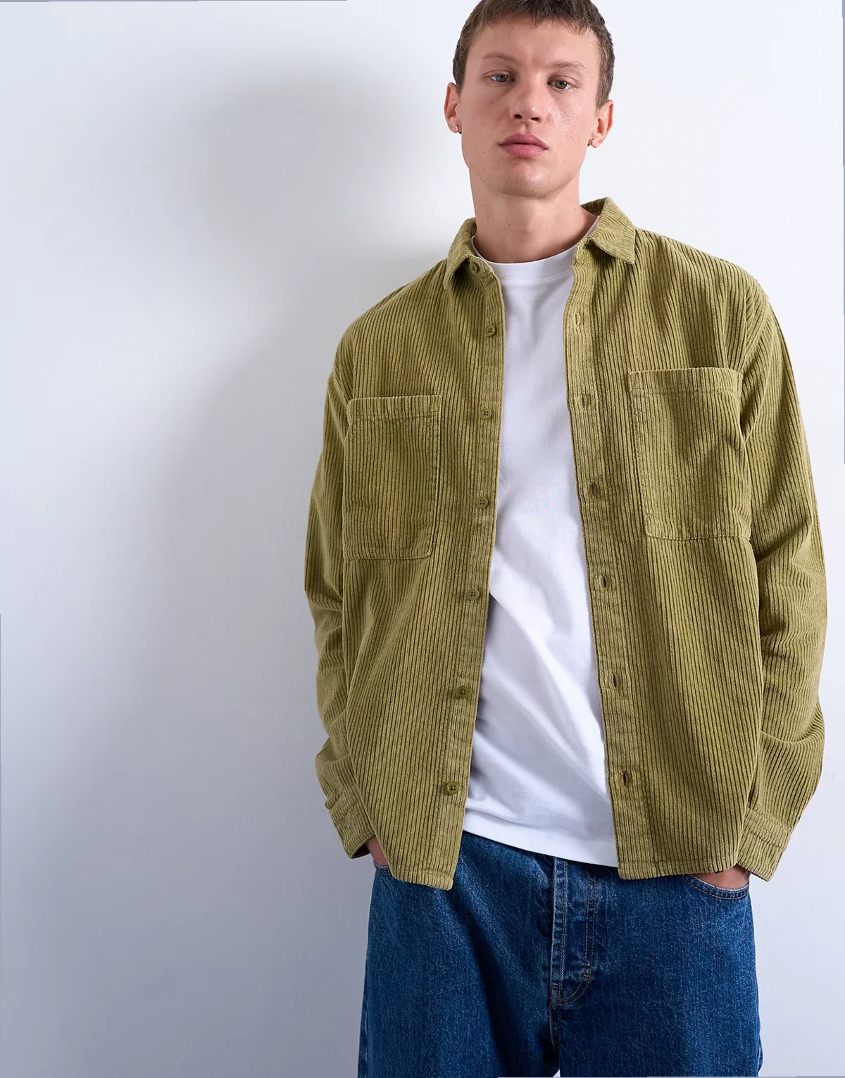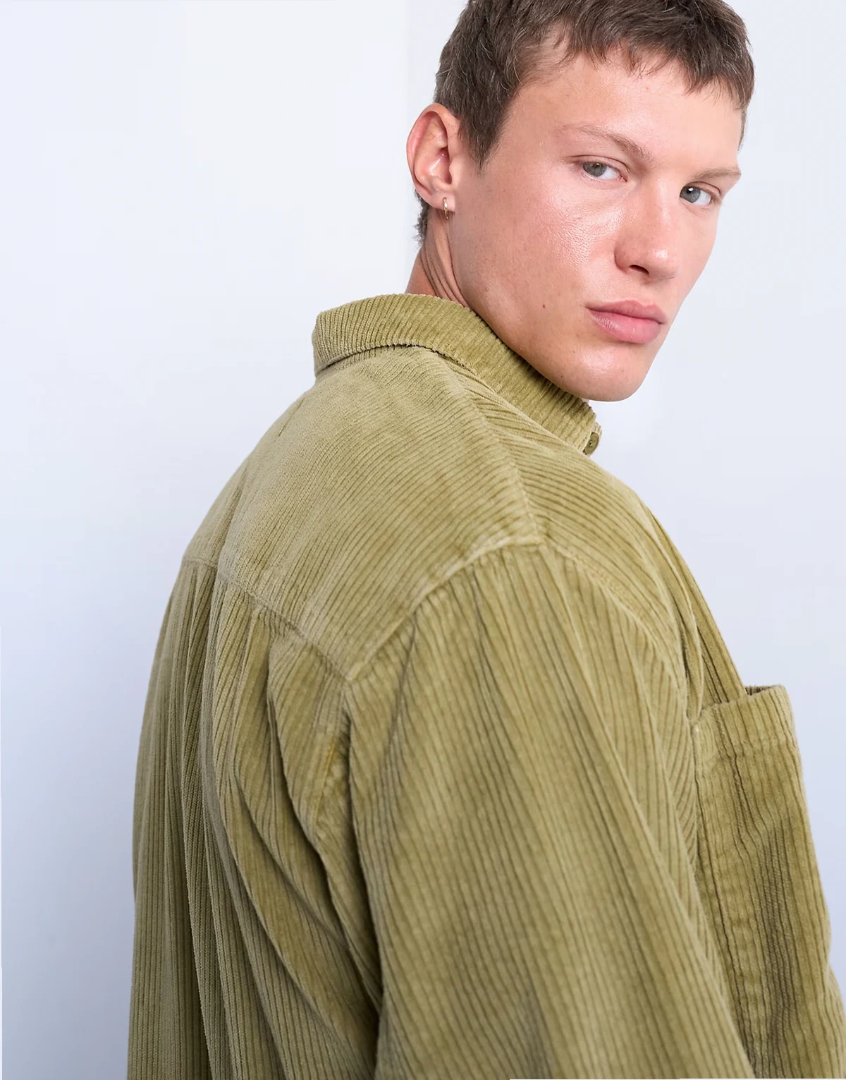 Das Hemd aus samtigem Feincord hat einen spitzen Kragen, lange Ärmel, zwei Brusttaschen und eine mittige Knopfleiste.