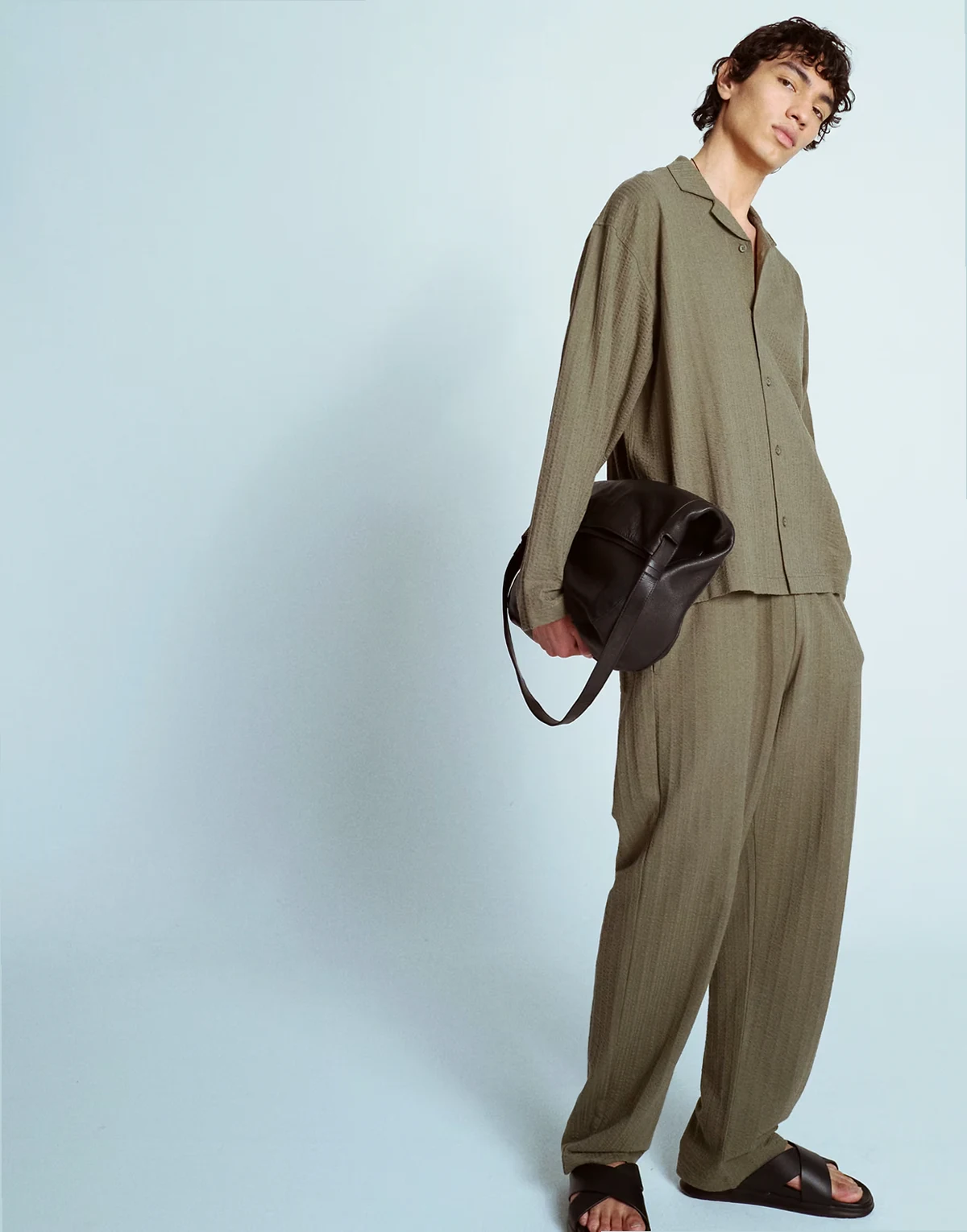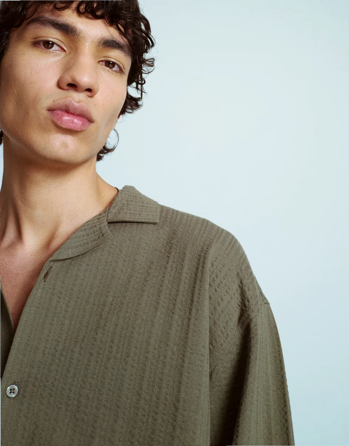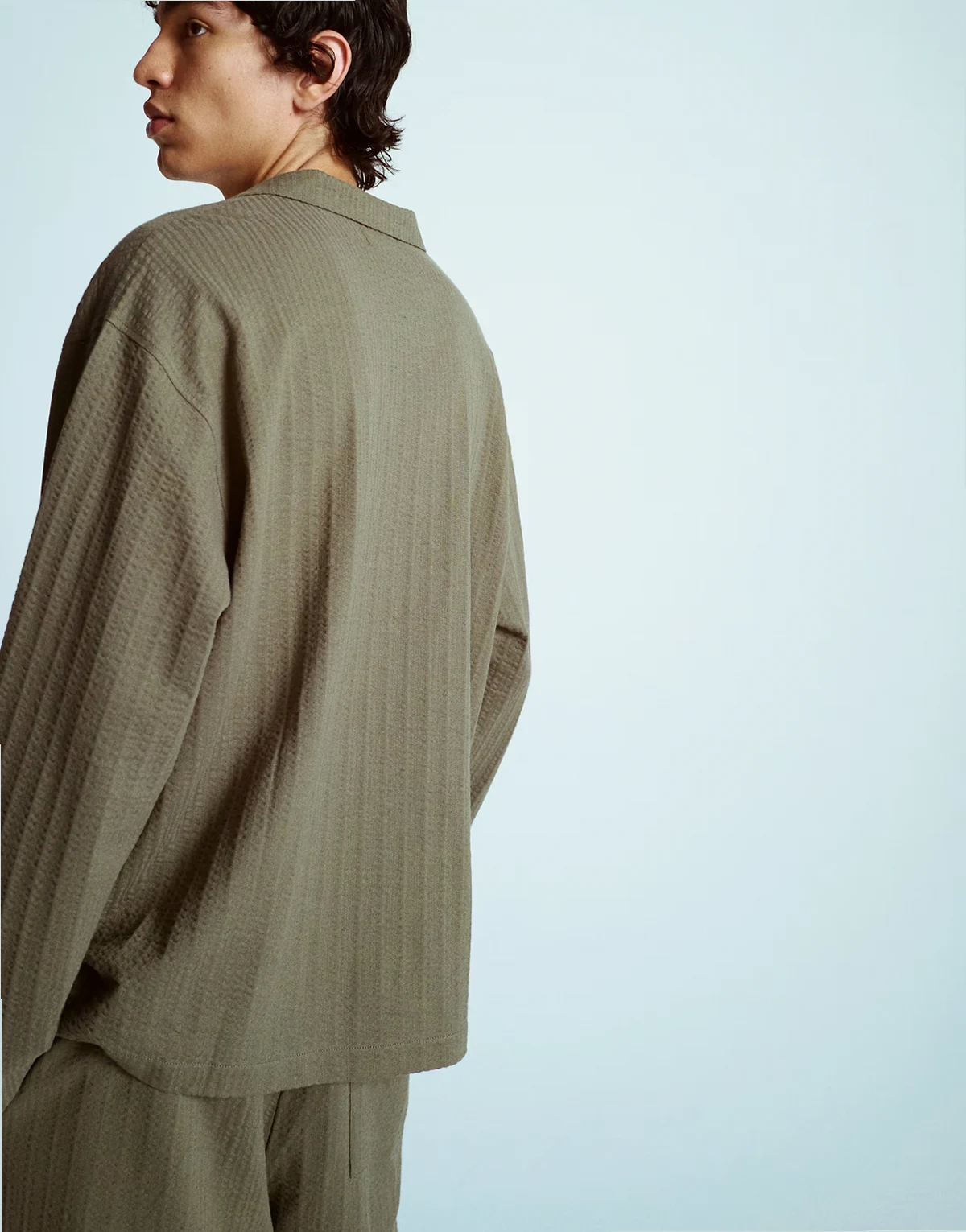 – Langärmliges Cropped Fit Hemd aus Seersucker-Jersey in Khaki mit Knopfleiste