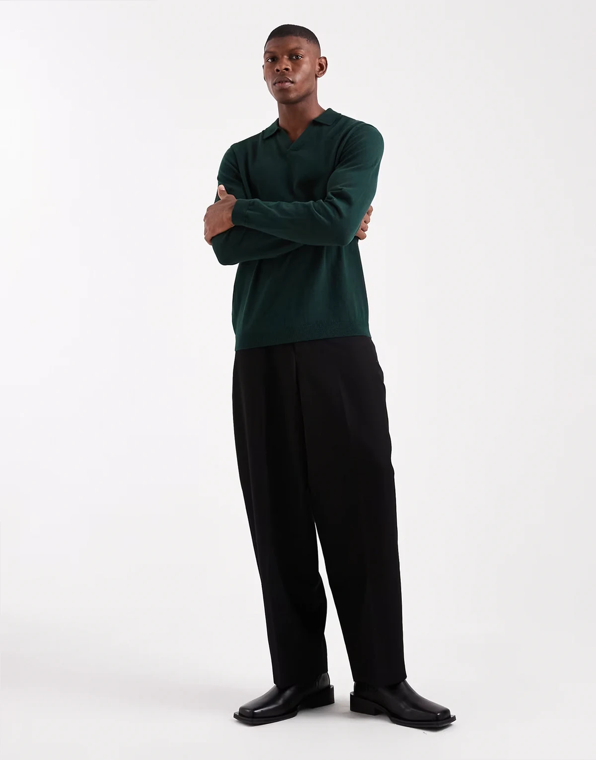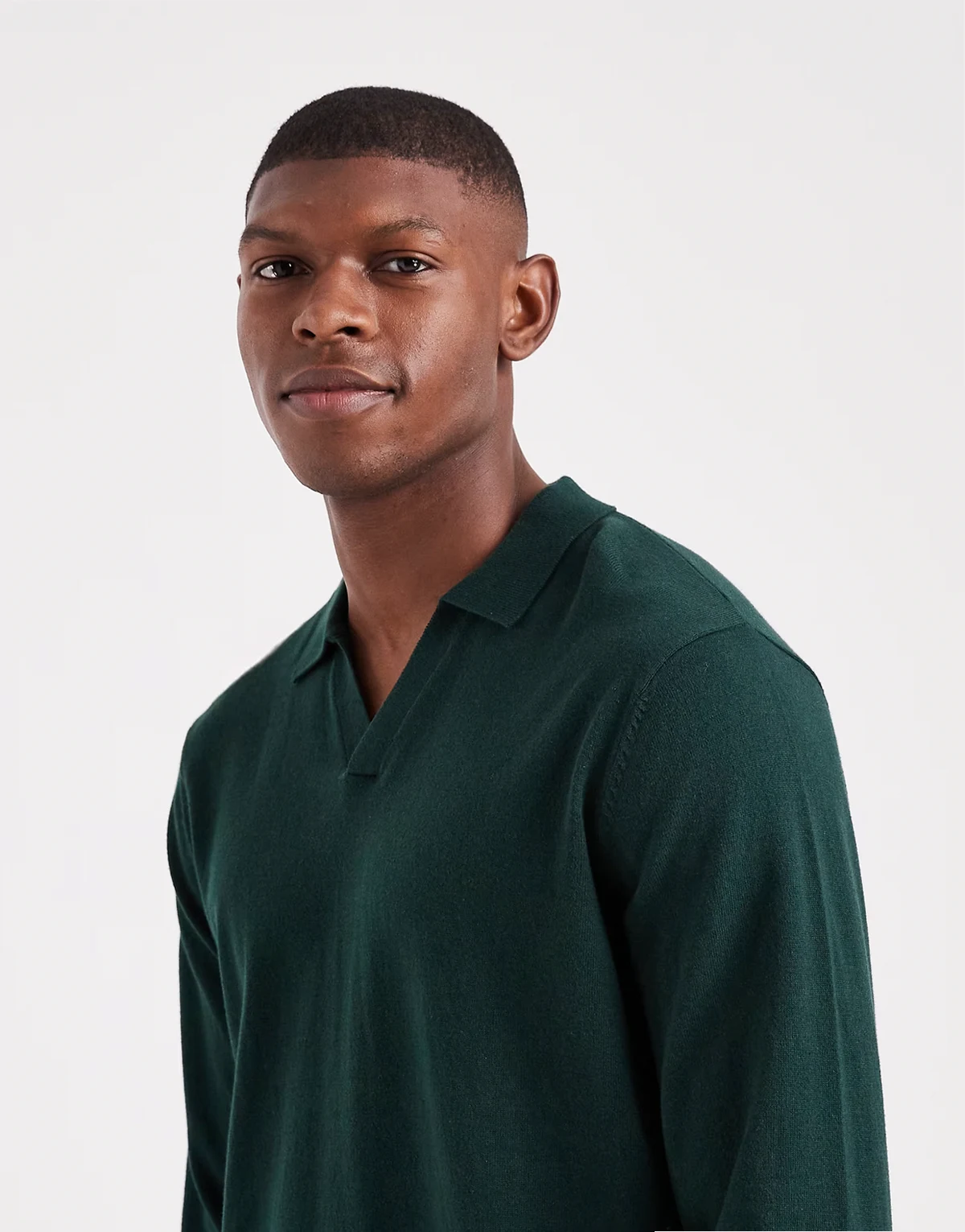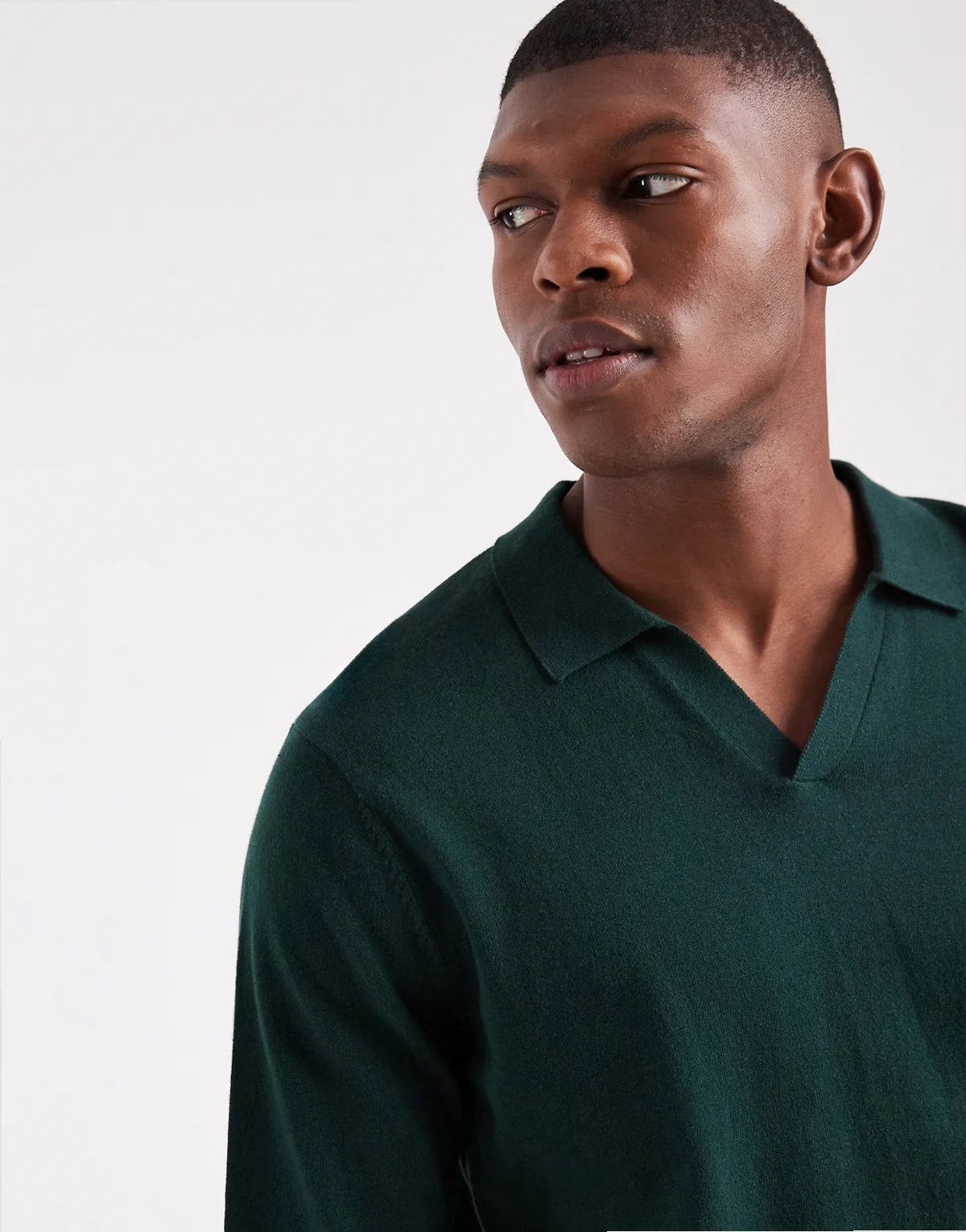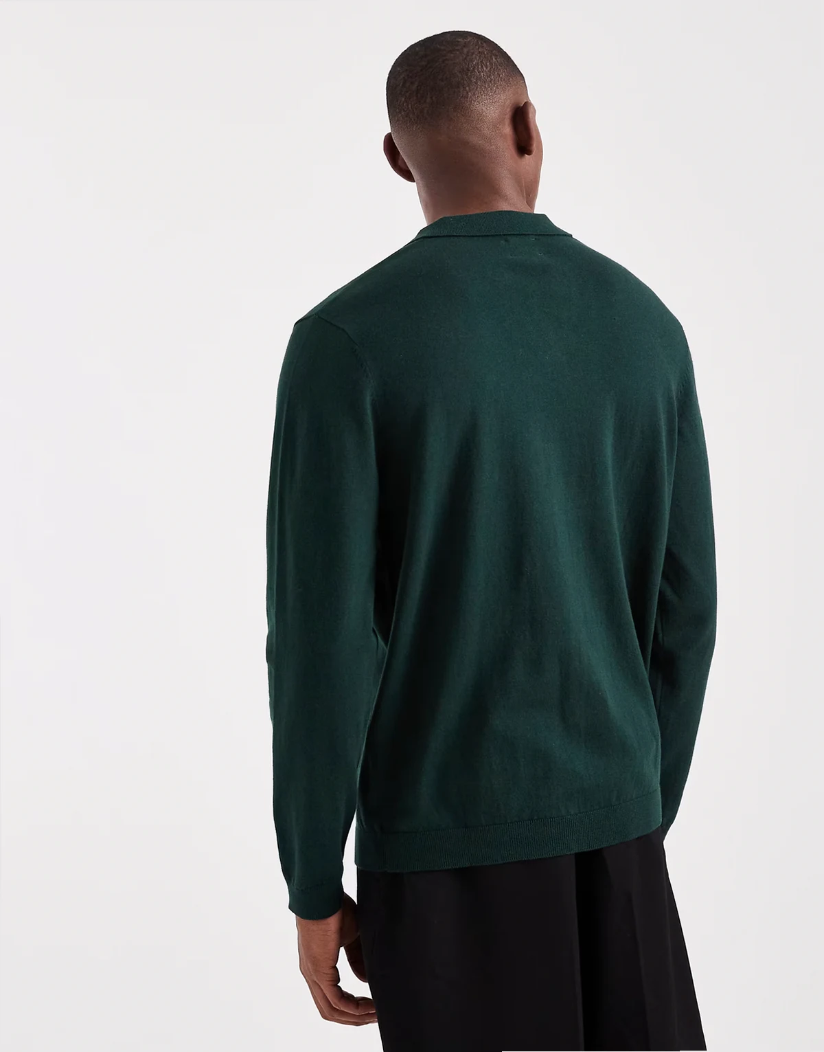 – Langärmliges Basic-Polohemd aus Strick in Dunkelgrün mit eingekerbtem Ausschnitt