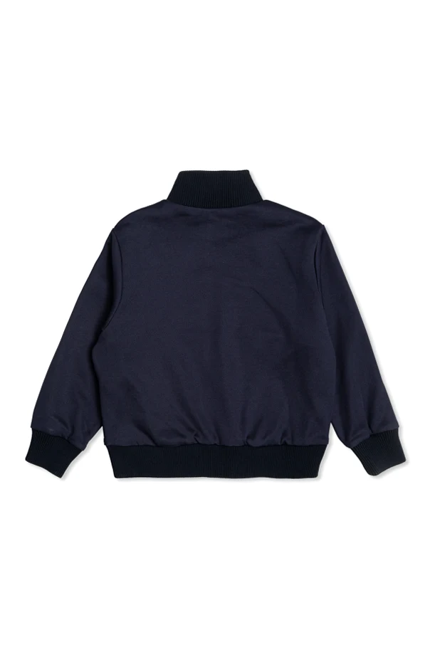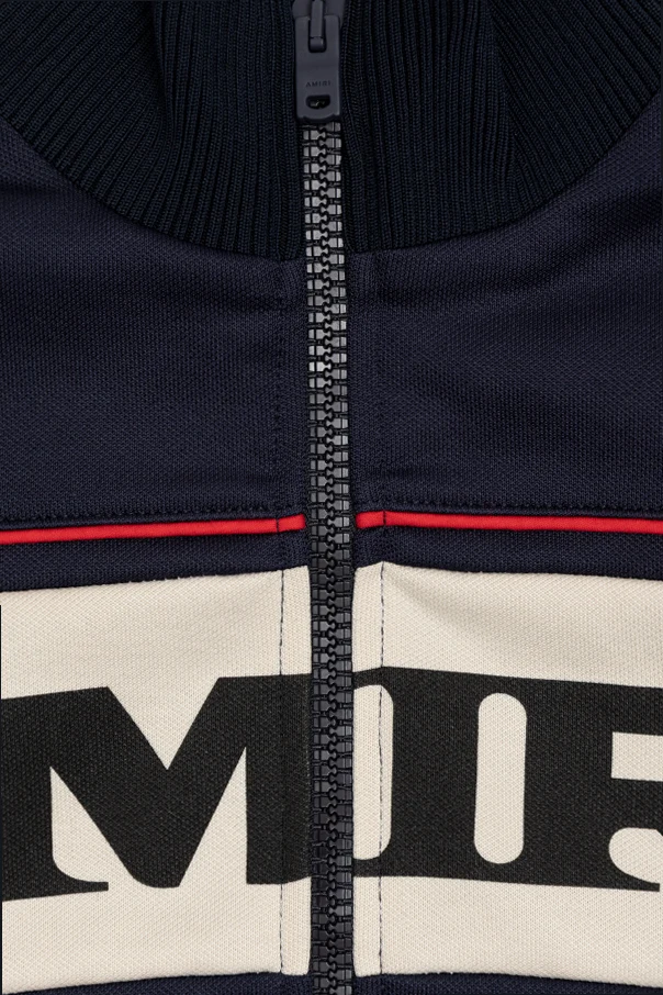 Dunkelblaue Sweatjacke mit aufgedrucktem Logo der Marke Amiri Kids ist eine erlesene Verbindung zeitloser Klassik mit einem modernen Designakzent. Der klassische, gerade Schnitt im Track-Jacket-Stil mit sorgfältig geformtem Stehkragen und durchgehendem Reißverschluss unterstreicht die Praktikabilität und Vielseitigkeit des Tragekomforts.