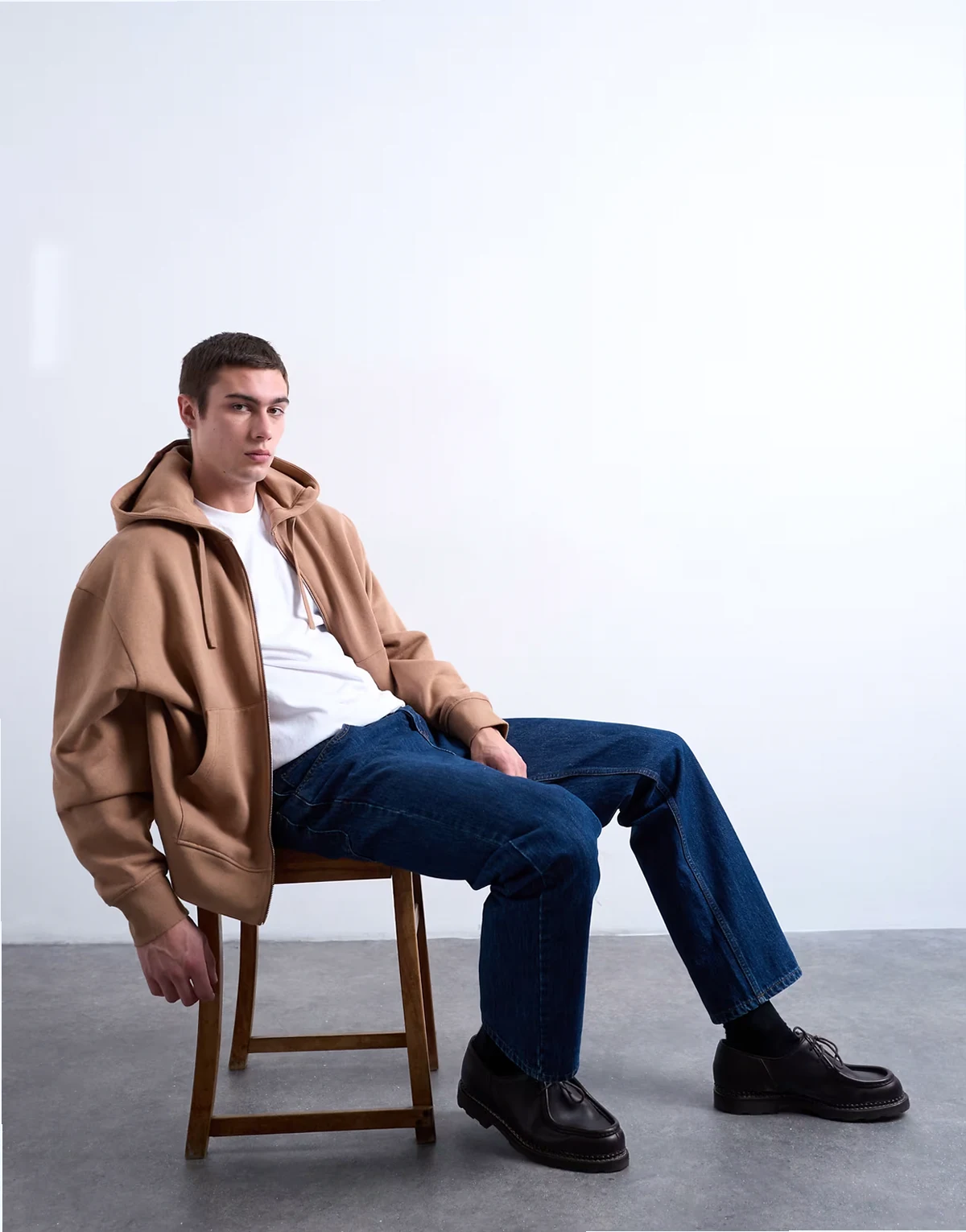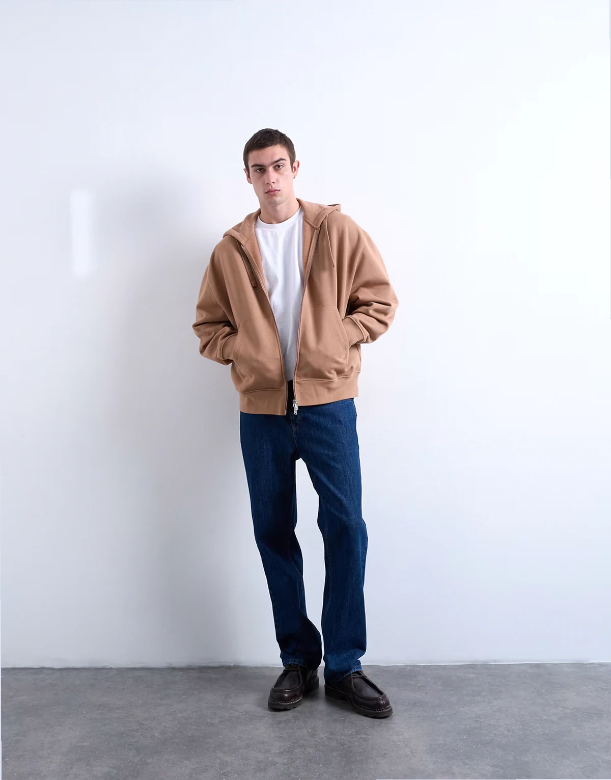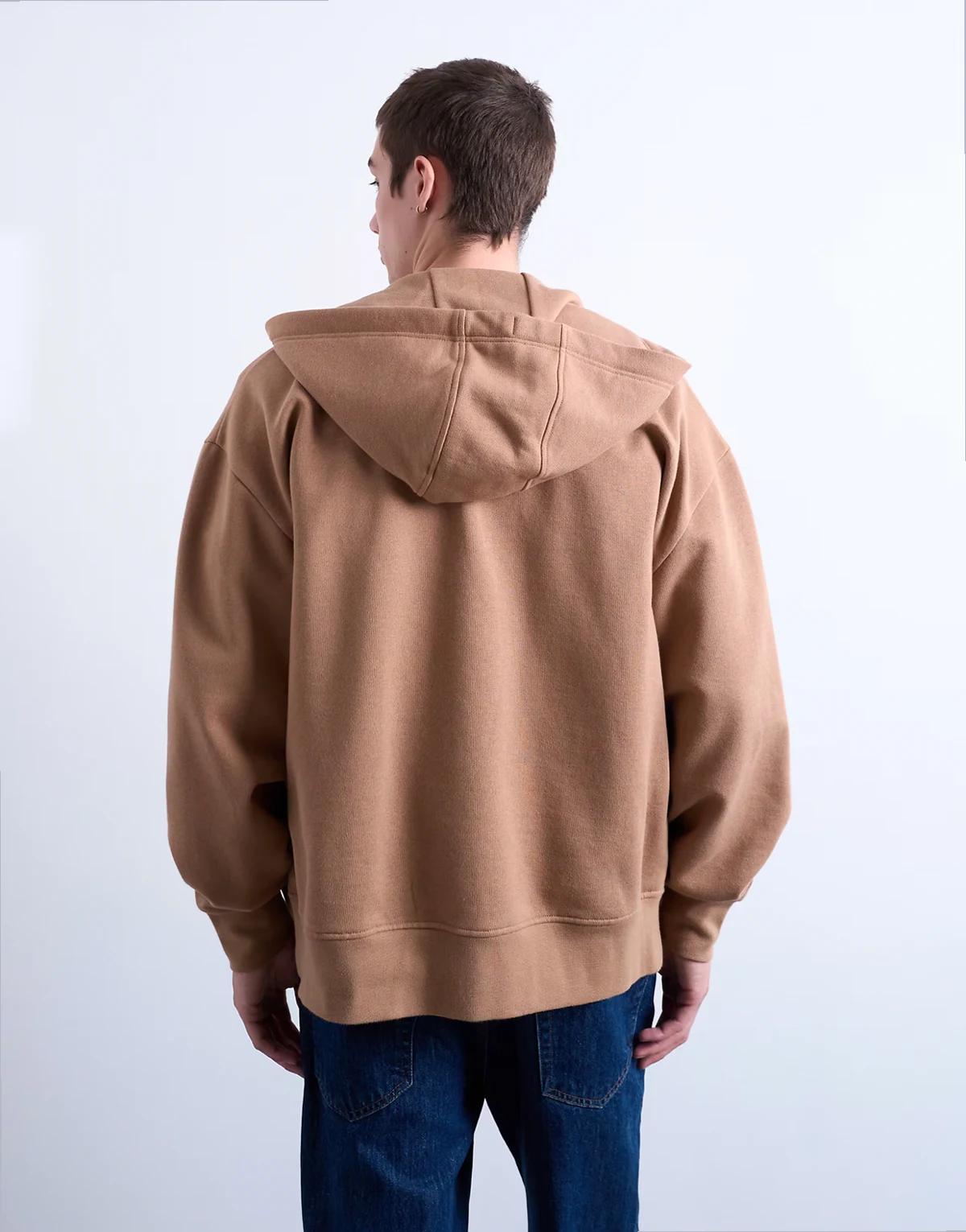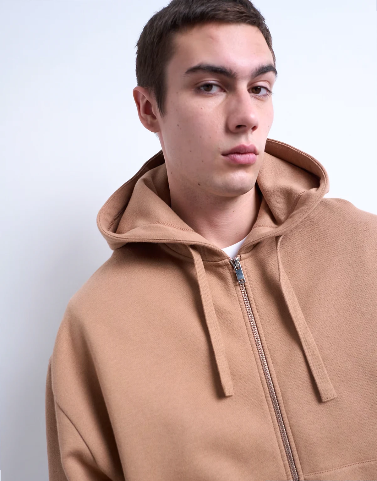 Diese Kapuzenjacke besteht aus dickem, schwerem Sweatshirt-Stoff und verfügt über eine Kapuze mit Kordelzug, einen Reißverschluss und zwei Seitentaschen. Das Modell hat einen Oversize-Schnitt.