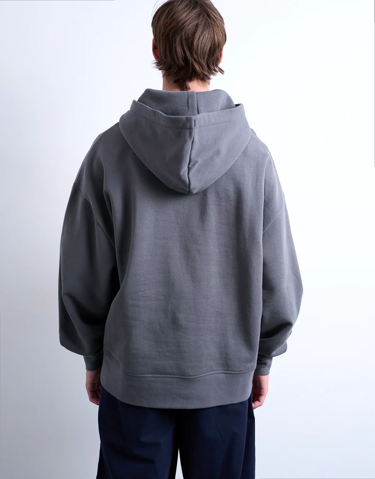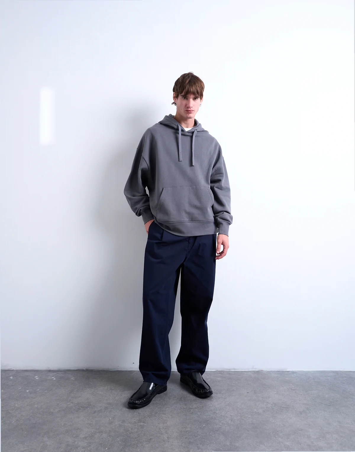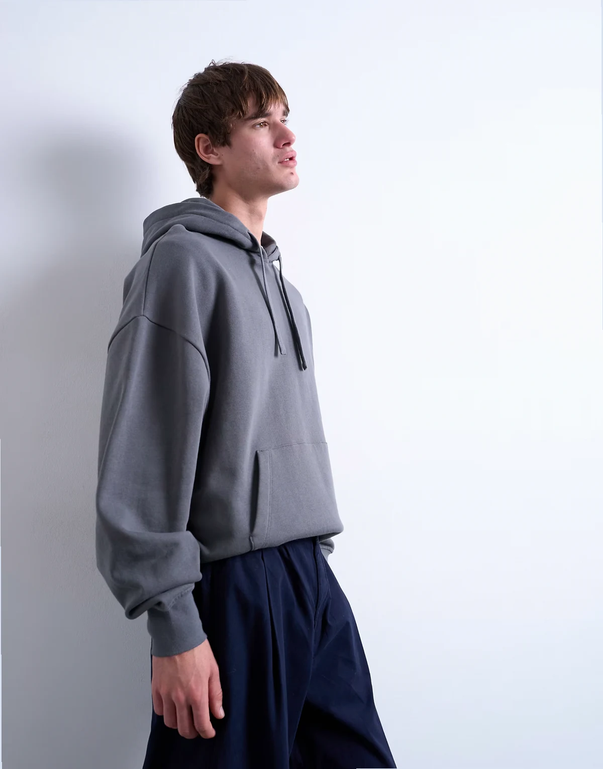 Dieser Kapuzenpullover besteht aus dickem Jersey in einem anthrazitgrauen Farbton. Das Modell hat eine Kapuze mit Kordelzug, überschnittene Schultern, eine Kängurutasche und eine Oversize-Passform.