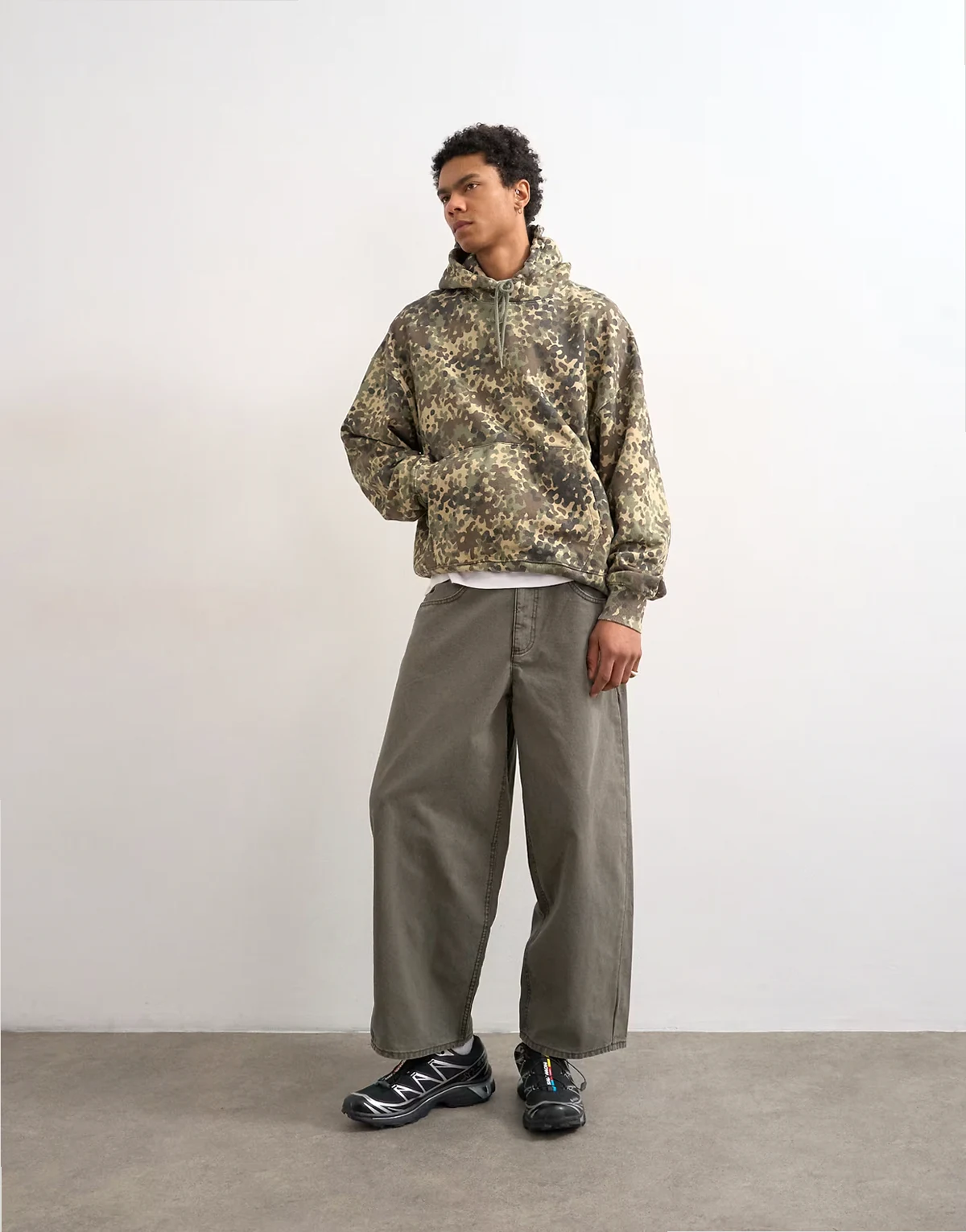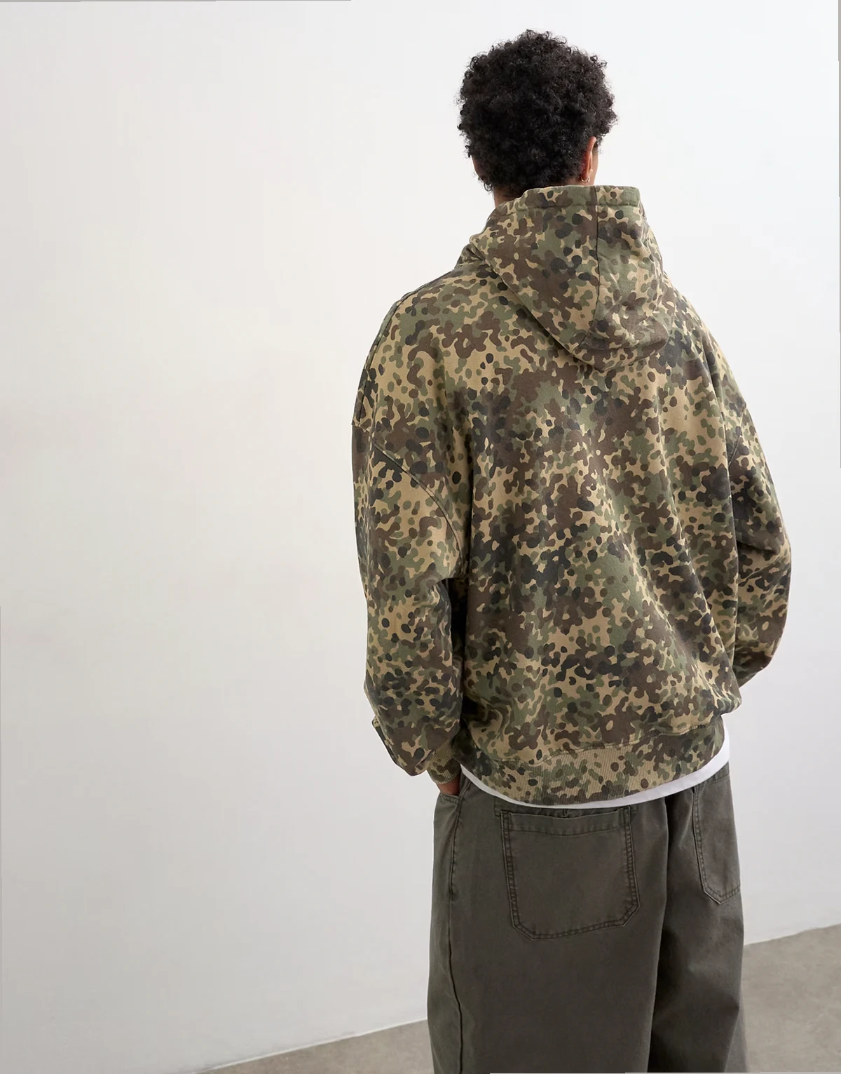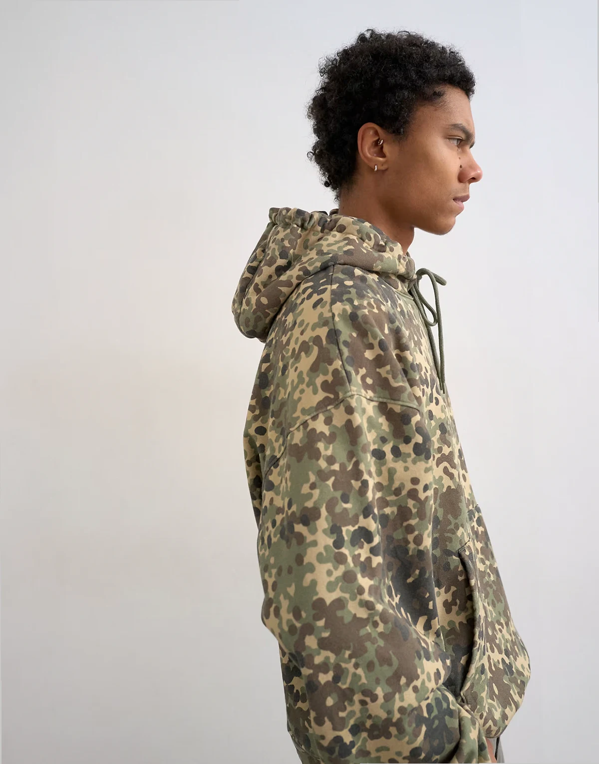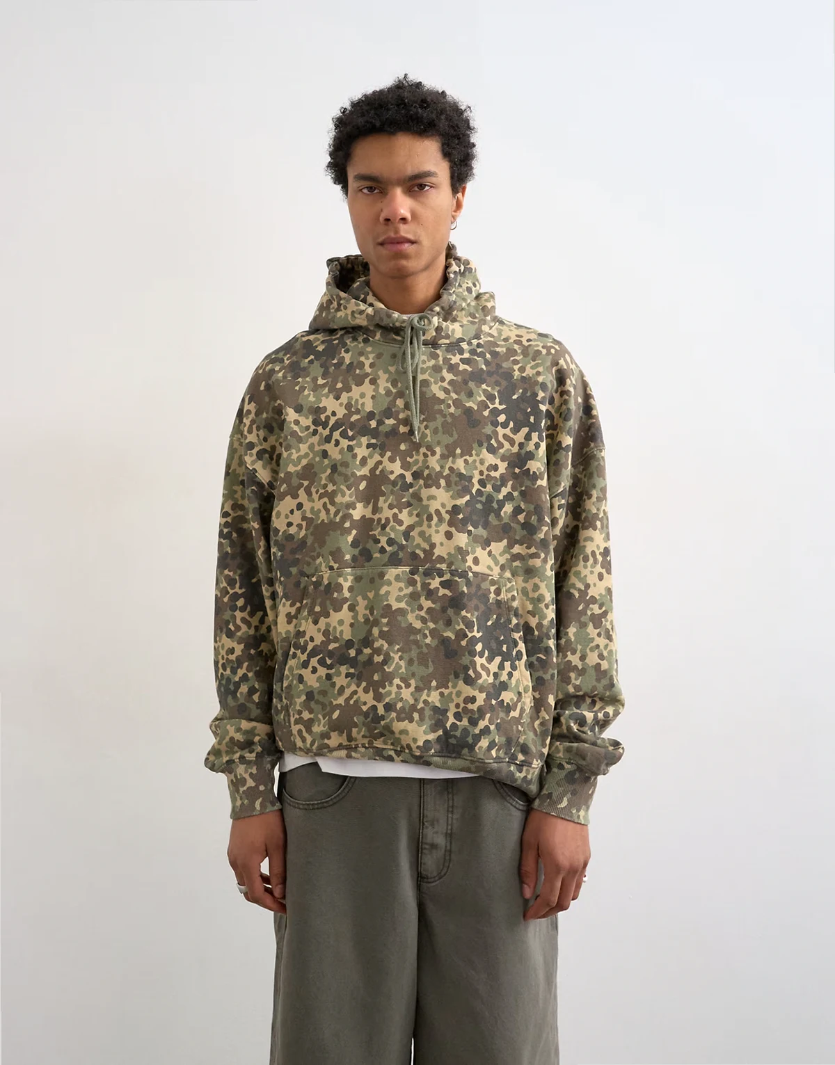 Dieser Kapuzenpullover ist aus Sweatshirt-Stoff mit Military-Muster gefertigt. Er hat eine Kapuze mit Kordelzug, lange Ärmel, eine Beuteltasche und eine Oversize-Passform.