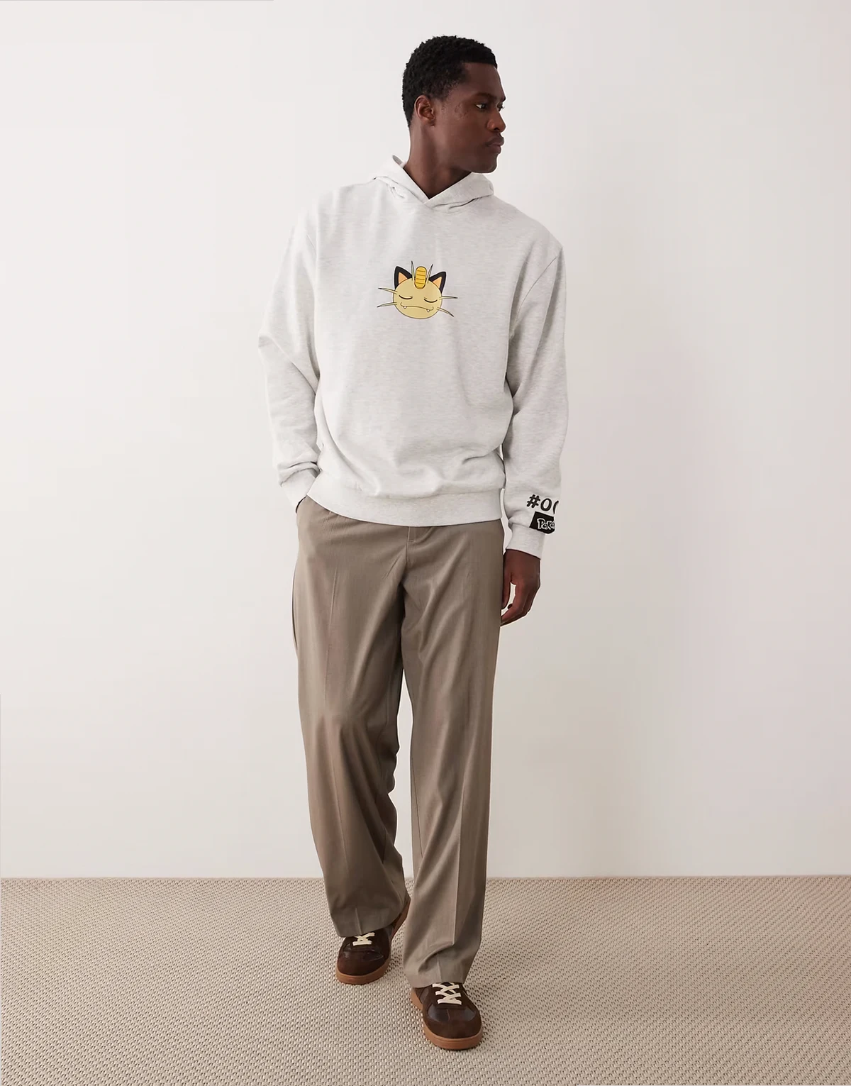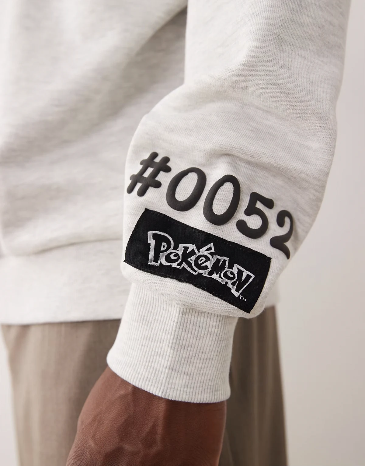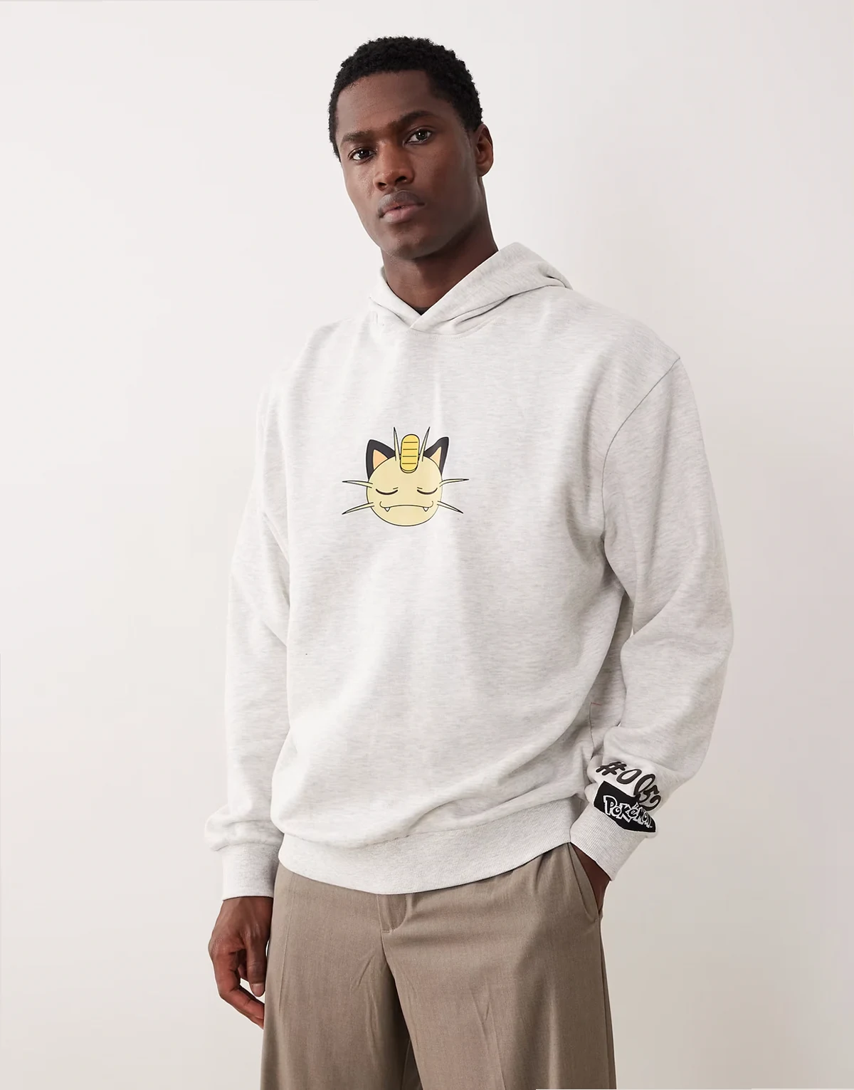 – Relaxed-Fit-Kapuzenpullover in meliertem Eisgrau mit Mauzi-Pokémon-Prints